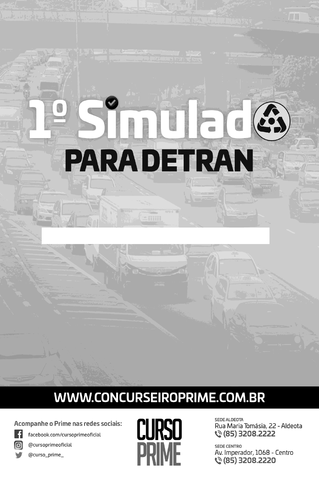 www.concurseiroprime.com.br - 1 - PROVA DE CONHECIMENTOS www.concurseiroprime.com.br - 2 - Objetivando que seu desempenho seja cada vez melhor, o Curso Prime elaborou algumas regras para o Simulado DETRAN. Lembre-se que quanto mais você treinar nos moldes de prova e fiscalização da UECE-CEV, melhor preparado você chegará na prova! REGRAS PARA A REALIZAÇÃO DO SIMULADO: 1. DESLIGUE SEU CELULAR. 2. UTILIZE APENAS CANETA com TINTA PRETA ou AZUL. 3. OBSERVE A CONTAGEM DE TEMPO NA LOUSA. 4. NÃO RASURE O GABARITO, ELE NÃO SERÁ TROCADO. 5. AO ENTRAR EM SALA, VOCÊ SÓ SAIRÁ APÓS O INÍCIO DA PROVA. 6. SEUS MATERIAIS FICARÃO EMBAIXO DA CARTEIRA. DEIXE À MÃO APENAS ÁGUA, LANCHE E CANETA. 7. O CARTÃO-RESPOSTA SERÁ ENTREGUE APÓS 1 (UMA) HORA DE PROVA. 8. A DURAÇÃO DA PROVA SERÁ DE 4h. 9. QUALQUER DÚVIDA CHAME O(A) FISCAL DE SALA. 10. OS RECURSOS DEVERÃO SER ENVIADOS PARA O E-MAIL: simuladoprime@gmail.com, ATÉ AS 24 HORAS DA SEGUNDA-FEIRA, DIA 05 DE JUNHO DE 2017. 11. NA SEXTA-FEIRA (09/06) O RESULTADO IMPRESSO ESTARÁ DISPONÍVEL NA RECEPÇÃO. Bom simulado! Este Caderno de Prova contém 50 (cinquenta) questões, sendo estilo A, B, C, D, E, assim distribuídas: Língua Portuguesa (08 questões: 01-08); Noções de Informática (06 questões: 09-14); Raciocínio Lógico-Matemático (06 questões: 15-20); Direito Administrativo (06 questões: 21-26); Atualidades (06 questões: 27-32); Legislação de Trânsito (18 questões: 33-50). www.concurseiroprime.com.br - 3 - LÍNGUA PORTUGUESA Para responder às questões de números 01 a 05, leia o texto. Histórias das Copas do Mundo De quatro em quatro anos, as seleções de futebol de diversos países do mundo se reúnem para disputar a Copa do Mundo de Futebol. A competição foi criada pelo francês Jules Rimet, em 1928, após ter assumido o comando da instituição mais importante do futebol mundial: a FIFA (Federation International Football Association). A primeira edição da Copa do Mundo foi realizada no Uruguai em 1930. Contou com a participação de apenas 13 seleções, que foram convidadas pela FIFA, sem disputa de eliminatórias, como acontece atualmente. A seleção uruguaia sagrou-se campeã e pode ficar, por quatro anos, com a taça Jules Rimet. Nas duas copas seguintes (1934 e 1938), a Itália ficou com o título. Porém, entre os anos de 1942 e 1946, a competição foi suspensa em função da eclosão da Segunda Guerra Mundial. Em 1950, o Brasil foi escolhido para sediar a Copa do Mundo. Com uma ótima equipe, o Brasil chegou à final, realizada no recém construído Maracanã (Rio de Janeiro – RJ). Um simples empate daria o título ao Brasil, porém, o Uruguai conseguiu o que parecia impossível: venceu o Brasil por 2 a 1 e tornou- se campeão. O Maracanã se calou e o choro tomou conta do país do futebol. O Brasil sentiria o gosto de erguer a taça pela primeira vez em 1958, na copa disputada na Suécia. Neste ano, apareceu para o mundo, jogando pela seleção brasileira, aquele que seria considerado o melhor jogador de futebol de todos os tempos, o nosso Pelé. Em 1962, no Chile, a seleção brasileira conquistou pela segunda vez a taça. Em 1970, no México, o Brasil tornou-se pela terceira vez campeão do mundo ao vencer a Itália por 4 a 1. Ao tornar-se tricampeão, o Brasil ganhou o direito de ficar em definitivo com a posse da taça Jules Rimet. Após o título de 1970, o Brasil entrou num jejum de 24 anos sem título. A conquista voltou a ocorrer em 1994, na Copa do Mundo dos Estados Unidos, quando nossa seleção venceu a Itália numa emocionante disputa por pênaltis. Quatro anos depois, o Brasil chegaria novamente à final, porém, perderia o título para o país anfitrião: a França. Em 2002, na Copa do Mundo do Japão/Coreia do Sul, o Brasil sagrou-se pentacampeão ao derrotar a seleção da Alemanha por 2 a 0. Em 2010, pela primeira vez na história, a Copa do Mundo foi realizada no continente africano. A África do Sul foi a sede do evento. E Espanha tornou-se, pela primeira vez na história, campeã mundial. Em 2014, depois de 64 anos, a Copa do Mundo será realizada novamente no Brasil. www.suapesquisa.com/educacaoesportes/historiadacopa.htm – Adaptado) 01. De acordo com o texto, a definição dos países que vão disputar a Copa do Mundo A) é feita da mesma forma desde a Copa de 1930. B) sofreu modificações da primeira Copa para as atuais. C) é sorteada a cada quatro anos. D) depende de regras a serem estabelecidas pelo país que será a sede. E) é decidida entre a FIFA e os técnicos das seleções. 02. A final da Copa do Mundo sediada pela primeira vez no Brasil A) foi disputada no Estádio do Morumbi, em São Paulo. B) terminou em empate entre o Brasil e o Uruguai. C) trouxe muita alegria para o nosso país. D) foi uma das primeiras partidas disputadas no estádio do Maracanã. E) foi o primeiro jogo que Pelé disputou em uma Copa do Mundo. 03. A partida final da Copa do Mundo de 1994 foi decidida A) após o tempo regulamentar do jogo. B) no primeiro tempo do jogo. C) aos 45 minutos do segundo tempo. D) num segundo jogo entre os times finalistas. (E) por sorteio. E) n.r.a. 04. Assinale a alternativa correta de acordo com o texto. A) O Chile foi o campeão da Copa de 1962. B) Brasil e Japão disputaram a final da Copa de 2002. C) Em 2010, a Espanha foi sede da Copa do Mundo pela primeira vez. D) A primeira Copa do Mundo disputada no Brasil foi em 1958. E) A Copa do Mundo de 1998 foi disputada na França. 05. Assinale a alternativa que apresenta o antônimo da palavra em destaque na frase do texto – ... a competição foi suspensa em função da eclosão da Segunda Guerra Mundial. A) Surgimento. B) Explosão. C) Encerramento. D) Suspensão. E) Manifestação. Leia o trecho a seguir para responder às questões de números 06 e 07. Cuidado O sedentarismo está entre os principais fatores de risco que ameaçam____ saúde. No entanto, é preciso ter cuidado ao começar___ praticar ativ