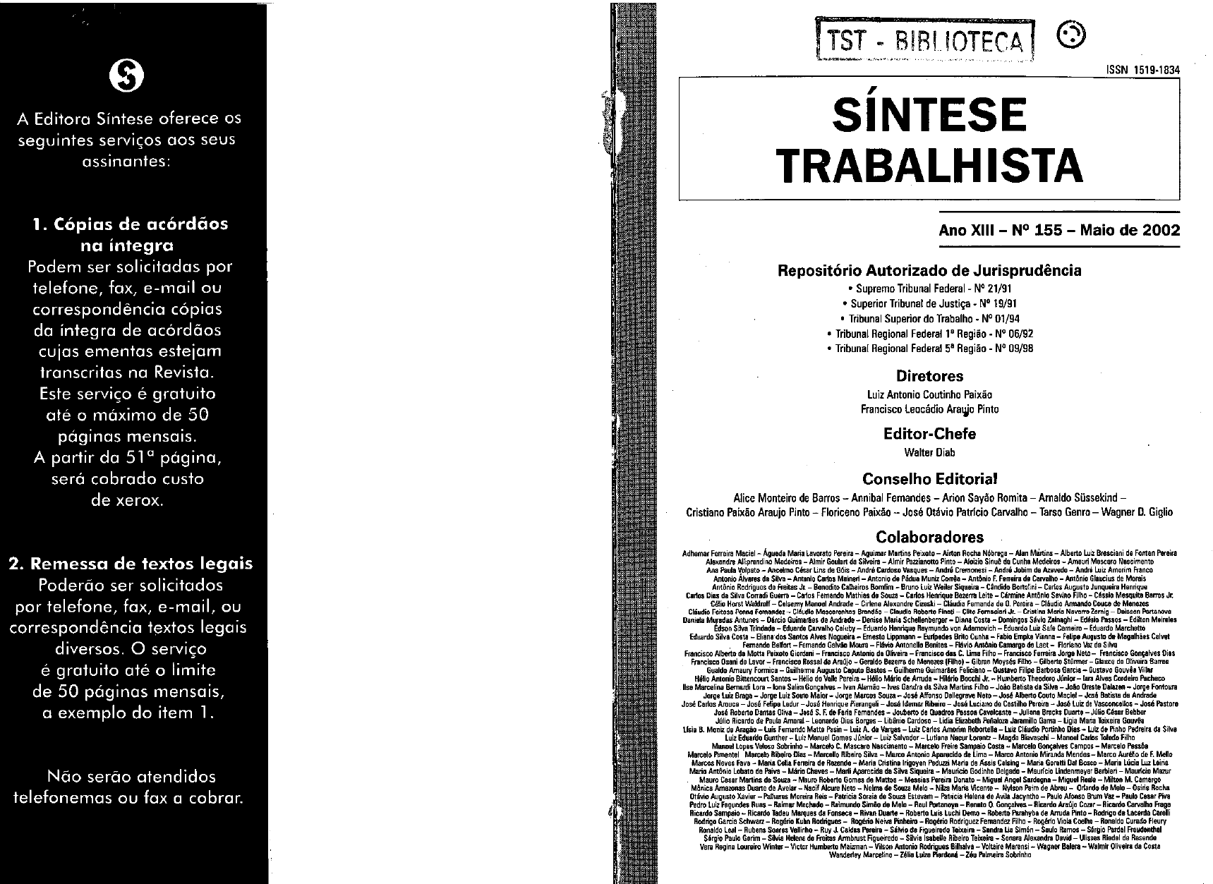 ISSN 1519-1834 , SINTESE TRABALHISTA Ano XIII - N° 155 - Maio de 2002 Repositório Autorizado de Jurisprudência • Supremo Tribunal Federal- N° 21/91 • Superior Tribunal de Justiça- N° 19/91 • Tribunal Superior do Trabalho - N° 01/94 • Tribunal Regional Federa11e Região- N° 06/92 • Tribunal Regional Federal 58 Região - N° 09/98 Diretores Luiz Antonio Coutinho Paixão Francisco leocádio AratMo Pinto Editor-Chefe Walter Oiab Conselho Editorial Alice Monteiro de Barros - Annibal Fernandes - Arion Sayão Romita - Arnaldo Süssekind - Cristiano Paixão Araujo Pinto- Floriceno Paixão- José Otávio Patricia Carvalho- Tarso Genro- Wagner O. Giglio Colaboradores Adhemar Ferreira Maciel- Águeda Maria lavorato Pereira - Aguimar Martins Peixoto - Airton Rocha Nóbrega - Alan Milrtins - Albarto Luiz Bresciani de FOlllan Pereira Alexandra Alliprandioo Madl!iros - Almir Goulart da Silveira -Almir Pazzianotto Pinto - Aloizio Sinuê da Cunha Medeiros - Amauri Mascaro Nascimento Ana Paula ~olpato- Ancelmo César Uns de Góis- André Ctrdoso Vasques- André Cremonesi -André Jobim de Azev!ldo- André Luiz Amorim Franco Antonio Alvares da Silva -Antonio Carlos Maineri- Antonio de Pádua Muniz Corrêa- Ant6nio F. Nmaira de Carvalho- Antônio GlaliCius de Morais Antônio Rodrigues de Freitas Jr. - Benedito Calheiros Bomfim - Bruno luiz Weiler Siqueira - Cêndido Bortolini - Carlos Augusto Junqueira Henrique Carlos Dias da Silva Corradi GuerTa - Ca~os Fernando Mathias de Souza - Carlos Henrique BezerTll Leite - Cánnine Antônio Savino Filho - Cássio Mesquita Barros Jt Célio HOI'St Waldraff- Cel:oemy Manoel Andrade - Cirlene Alexandre Cizes1i - Cláudia Fernanda de O. Peraira - Cláudio Armando Couce de Menezes Cliudio Feitosa Poona femondez- Cláudio Mescerenltas Brandão -Claudio Roberto Finati - Clito fomaciori Jr. - Cristino Mario Nevarro Zomig - Oaisson Portaoova Daniela MuradiLS Antunes - Dlircio Guiman!ies de Andrade- Denise Maria Schellenberger- Diana Costa - Domingos Sávio Zainaghi - Edésio Passos - Edilton Meirales ~dson Silva Trindade - Eduardo Carvalho Caiuby- Eduardo Henrique Raymundo von Adamovich - Eduardo Luiz Safe Carneiro - Eduardo Marchetto Edll8rdO Silva Costa - Eliana dos Santos Alves Nogueira - Ernesto Lippmann - Eurlpedes Brito Cunha - Fabio Empke Vian1111- Fetipe Augusto de Magalhães Calvl!l Fernando Belfort - Fernando GalviiD MOW'll - Flévio Antonello Benites- Flávio AniÕilio Camargo de Lael- Floriano vaz da Silve Francisco Alberto da Motta Peixoto Giordani - Francisco Antonio de Oliveira - Francisço da$ C. Uma Filho - Francisco Ferreira Jorge Neto- Francisco Gonçalves Dias françisco Clsani de Lavor- Francisco Rossal de Araajo -Geraldo Bezerra de Menezes {Filhol- Gibran Moysés Filho -Gilberto StOrml!f- Glam:e de Oliwira Barros Gualdo Amaury Fannica - Guilherme Augusto Caputo Bastos - Guilherme Guiman!ies Feliciano - Gustavo Filipe Barbosa Garcia- Oustavo Gouvêa VHiar Hélio Antonio Bittencourt Santos- Hélio do Valle Pereira- Hélio Mário de Amlda - Hilário Bocchi Jr. - Hwnberto Theodoro Janior -lanl AlvN Cordeiro l'lu:heco Use Marceline Bernardi lora -lona Salim Gonçalves- lviiD Alemão -lves Gandra da Silva Martins Filho - Joiio Batista da Silva - Joao Dreste Dalazen - Jorga FontoUfll Jorge Luiz Braga - Jorge Luiz SoU1o Maior- Jorge Marcos Souza- José Affonso Oallegrave Neto- José Alberto Couto Maciel- José Batista da Andrade José Ca~os Arouca- José Felipe Ledur -José Henrique Pierangeli- José ldemar Ribtliro- José Luciano de Castilho Pereira- José Luiz de Vasconcellos- José Pastare José Roberto Dantas Oliva - José S. F. de Faria Fernandes - Jotlberto de Quadros Pessoa Cavalçante - Juliana Bracks Duarte - Jalio Cé$ar Bebber Jalio Ricardo de Paula Amaral- Leonardo Dias Borges - Libíinio Cardoso - Lidia Elizabetb Pefialoza Jaramillo Gama -ligia Maria Teixeira Gouvh Usia 8. Moniz de Alilgiio -Luís fanlilndc Matte Pasin - Luiz A. de Vargas- Luiz Ca~os Amorim Robortella - Luiz Cláudio Portinllo Dias- Luiz de Pinllo Pedreira da Silva Luiz Edual'do GU11ther- Lui1 Manuel Gomes Júnior- Luiz Salvador- Lutiana Nacur Lorentz - Magda BiiMischi - Manoel CariDs Tafedo Filho Manoel Lopes VeiDSo Sobrinho- Marcelo C. Mascaro Nascimento - Man:elo Freire Sampaio Costa - Marcelo Gonçalves Campos - Marcelo PessOa Marcelo Pimentel Marcelo Ribeiro Dia;- Marcello Ribeiro Silve- Marco Antonio Aparecido da lima- Marco Antonio Miranda Mendes- Marco Aurélio de F. Mello Marcos Neves Fava - Maria Celia Ferreira de Rezende - Maria Cristina lrigoyen Peduzzi Maria de Assis Calsing - Maria Goratti OaiBosco - Maria Lacia Luz Leiria Mario Antônio Lobato de Paiva - Mário Chaves - Marli Aparecida da Silva Siqueira- Mauricio Godinho Delgado - Mauricio Undenmeyer lklrbieri - Mauricio Mawr Mauro Cesar Martins de Souza - Mauro Roberto Gomes de Mattos - Messias Pereira Oo1111to - Miguel Angel Sardegna - Miguel Real& - Milton M. Camargo M4nica Amazonas Duarte de Avelar- Nacif Alcure Ne10- Nelnlil de Souza Melo - Nilza Maria Vicenle- Nytson Paim de Abreu - Ortando de Melo - Osiris Rocha Olívio Auguslo Xavier - Palharas Moreilil Reis - Palricia Soraia de Souza EstiMim - Pat~cia Helena de Avila Jacyntho - Paulo Afonso Brum Vaz- Paulo Casar Piva Pedro Luiz Fegundes Ruas - Raimar Machado - Raimundo Simão de Melo - Raul f'ortanO)!B - Renato O. Gonçalves- Ricardo Araújo Cozer- Ricardo Carvalho Fraga Ricardo Sampaio- Ricardo Tadeu Marques da Fonseca- Rivan Duarte- Roberto Luis Luchi Demo- Roberto Parahyba de Afruda Pinto- Rodrigo de Lacerda Caralli Rodrigo Garcia Scbwaa- Rogério Kubn Rodrigues - Rogério Neiva Pinheiro- Rogério Rodriguez Fen111ndez Filho - Rogério Viola Coelho - Ronaldo Curado flaury Ronaldo Leal- Rubens Soaras Vallinho- Ruy J Caldas Pereira - Silvio de Figueiredo Teixeira -Sandra Ua Simón - Saulo Ramos - Sérgio Panlal Frelldoothal Sérgio Paulo Gerim- Silvia Helena de Freitas Annbrust Figueiredo- Silvia lsabelle Ribeiro Teixeira- So1111ra Alexandra 