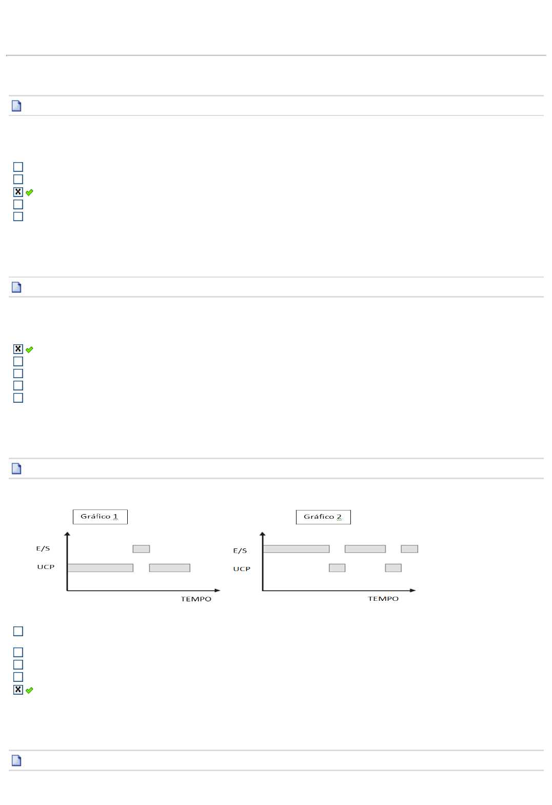 Exercício: CCT0757_EX_A2_201801153345_V1 11/08/2018 19:21:12 (Finalizada) Aluno(a): JORGIVALDO NOGUEIRA LEAL 2018.3 EAD Disciplina: CCT0757 - SISTEMAS OPERACIONAIS 201801153345 1a Questão Em sistemas multiprogramáveis os processos podem assumir diferentes estados. Os três estados mais importantes são: running (execução); ready (pronto); e wait (espera). Mudanças entre esses estados podem ocorrer a qualquer momento. Assinale dentre as assertivas seguir a unica mudança de estado que NÃO pode acontecer: ESPERA para PRONTO EXECUÇÃO para ESPERA ESPERA para EXECUÇÃO PRONTO para EXECUÇÃO EXECUÇÃO para PRONTO 2a Questão Suponha que um usuário acionou um programa que, ao ser carregado, solicitou a digitação de uma senha. Quando o programa foi acionado, o processo passou pelos estados "pronto" e "execução". Em seguida o programa ficou no estado "espera", pois dependia de uma operação de E/S (leitura do teclado) para prosseguir. Quando o usuário informar a senha o processo passará para qual estado? PRONTO TERMINADO CRIADO EXECUÇÃO ESPERA 3a Questão Processos podem ser classificados como CPU-bound ou I/O bound, de acordo com a utilização elevada do processador(UCP) e dos dispositivos de entrada/saída(E/S), respectivamente. Analisando os gráficos abaixo podemos afirmar que : ao longo do tempo o gráfico 1 representa um processo de I/O bound, já no gráfico 2 não é possível verificar o tipo de processo que representa. o gráfico 1 representa um processo de I/O bound e o gráfico 2 representra um processo de CPU-bound. tanto o gráfico 1 quanto o gráfico 2 representam processos de CPU-bound. tanto o gráfico 1 quanto o gráfico 2 representam processos de I/O bound. o gráfico 2 representa um processo de I/O bound e o gráfico 1 representra um processo de CPU-bound. 4a Questão Um processo do tipo CPU-bound é aquele que faz poucas operações de entrada e saída. Por outro lado, processos do tipo I/O-bound são aqueles que fazem muita leitura de disco ou requerem muita interação com o usuário. Desta forma, conclui-se que os processos que ficam a maior parte do tempo nos estados "pronto" e "executando" são os processos do tipo: Não é possível classificar o processo com as informações fornecidas. O processo em questão não é CPU-bound nem I/O-bound. I/O-bound. CPU-bound e I/O-bound ao mesmo tempo. CPU-bound. 5a Questão Suponha que um usuário esteja utilizando um editor de texto em um terminal Windows. Em um dado momento ele nota que o computador ficou lento. O usuário confirma que aparentemente não há nenhum programa sendo executado além do Windows e do Word. Ao conferir no gerenciador de tarefas, ele observa que existe um novo processo chamado "backup". Entretanto, não há nenhuma interface para lidar com esse processo. Neste caso, podemos dizer que o processo "backup" é um processo do tipo: CPU-bound. I/O-bound. monotarefa. background. foreground. 6a Questão O processo de um sistema operacional é definido como sendo "um programa em execução". Um processo pode assumir estados diferentes e consequentemente, ocorre mudanças entre os estados. Com relação a estas mudanças de estado, marque a opção que NÃO é possível acontecer. Bloqueado para pronto pronto para execução bloqueado para execução Execução para pronto Execução para bloqueado 7a Questão Marque a opção que melhor representa a afirmação a seguir. Armazena o conteúdo dos registradores gerais da UCP, além dos registradores de uso específico, como program counter (PC), stack pointer (SP) e registrador de status¿. Thread Espaço de Endereçamento Contexto de Hardware Limites Contexto de Software 8a Questão Os sistemas operacionais criam estruturas de controle, chamadas processo, para controlar a execução dos programas, sejam do usuário ou do próprio sistema. Essa estrutura registra informações sobre a situação do processo durante todo seu processamento, sendo uma dessas informações o estado do processo. Avalie as sentenças a seguir e assinale a correta. O estado de ESPERA representa o processo aguardando o fim da fatia de tempo de umprocesso em EXECUÇÂO O escalonador organiza a fila de processos em estado de PRONTO. Para escalonadores preemptivos existe a possibilidade de determinar uma fatia de tempo (time slice) para que o processo se mantenha em estado de EXECUÇÃO, após esse tempo o processo retorna para a fila de PRONTO O escalonador também pode selecionar processo em ESPERA para execução. A transição entre os três estados (PRONTO, ESPERA E EXECUÇÃO) é possível em ambos os sentidos. O estado de EXECUÇÃO representa o processo aguardando ser escalonado, ou seja, o processo depende da escolha por parte do sistema operacional para que possa executar seu código (instruções)