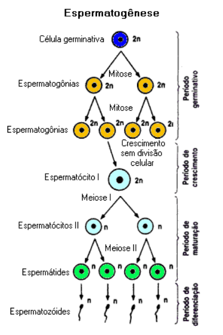 A espermatogênese divide-se em quatro fases: Fase de proliferação ou de multiplicação: Tem início durante a vida intra-uterina, antes mesmo do nascimento do menino, e se prolonga praticamente por toda a vida. As células primordiais dos testículos, diplóides, aumentam em quantidade por mitoses consecutivas e formam as espermatogônias . Fase de crescimento: Um pequeno aumento no volume do citoplasma das espermatogônias as converte em espermatócitos de primeira ordem, também chamados espermatócitos primários ou espermatócitos I, também diplóides. Fase de maturação: Também é rápida, nos machos, e corresponde ao período de ocorrência da meiose. Depois da primeira divisão meiótica, cada espermatócito de primeira ordem origina dois espermatócitos de segunda ordem (espermatócitos secundários ou espermatócitos II). Como resultam da primeira divisão da meiose, já são haplóides, embora possuam cromossomos duplicados. Com a ocorrência da segunda divisão meiótica, os dois espermatócitos de segunda ordem originam quatro espermátides haplóides. Espermiogênese: É o processo que converte as espermátides em espermatozóides, perdendo quase todo o citoplasma. As vesículas do complexo de Golgi fundem-se, formando o acrossomo, localizado na extremidade anterior dos espermatozóides. O acrossomo contém enzimas que perfuram as membranas do óvulo, na fecundação. Os centríolos migram para a região imediatamente posterior ao núcleo da espermátide e participam da formação do flagelo, estrutura responsável pela movimentação dos espermatozóides. grande quantidade de mitocôndrias, responsáveis pela respiração celular e pela produção de ATP, concentram-se na região entre a cabeça e o flagelo, conhecida como peça intermediária.