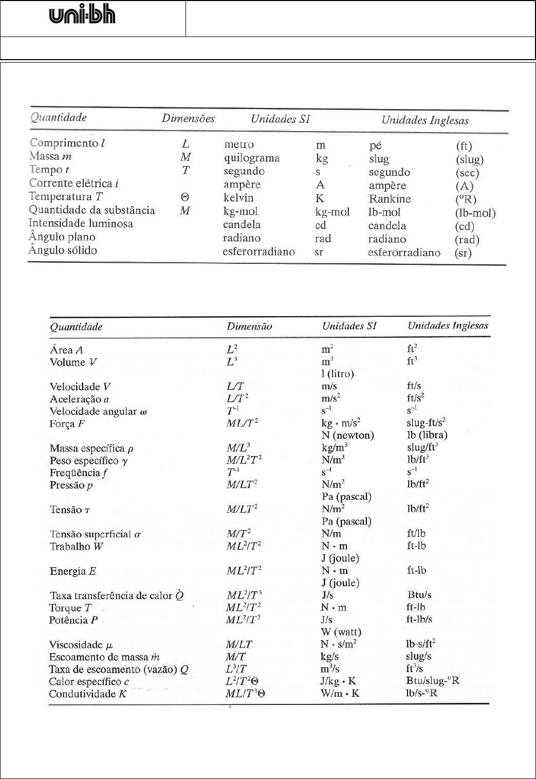 Centro Universitário de Belo Horizonte INSTITUTO DE ENGENHARIA E TECNOLOGIA – IET Disciplina: Mecânica dos Fluidos DIMENSÕES FUNDAMENTAIS E SUAS UNIDADES UNIDADES DERIVADAS PREFIXOS DO SI FATORES DE CONVERSÃO DE UNIDADES FATORES DE CONVERSÃO DO SISTEMA BRITÂNICO (BG) PARA O SI