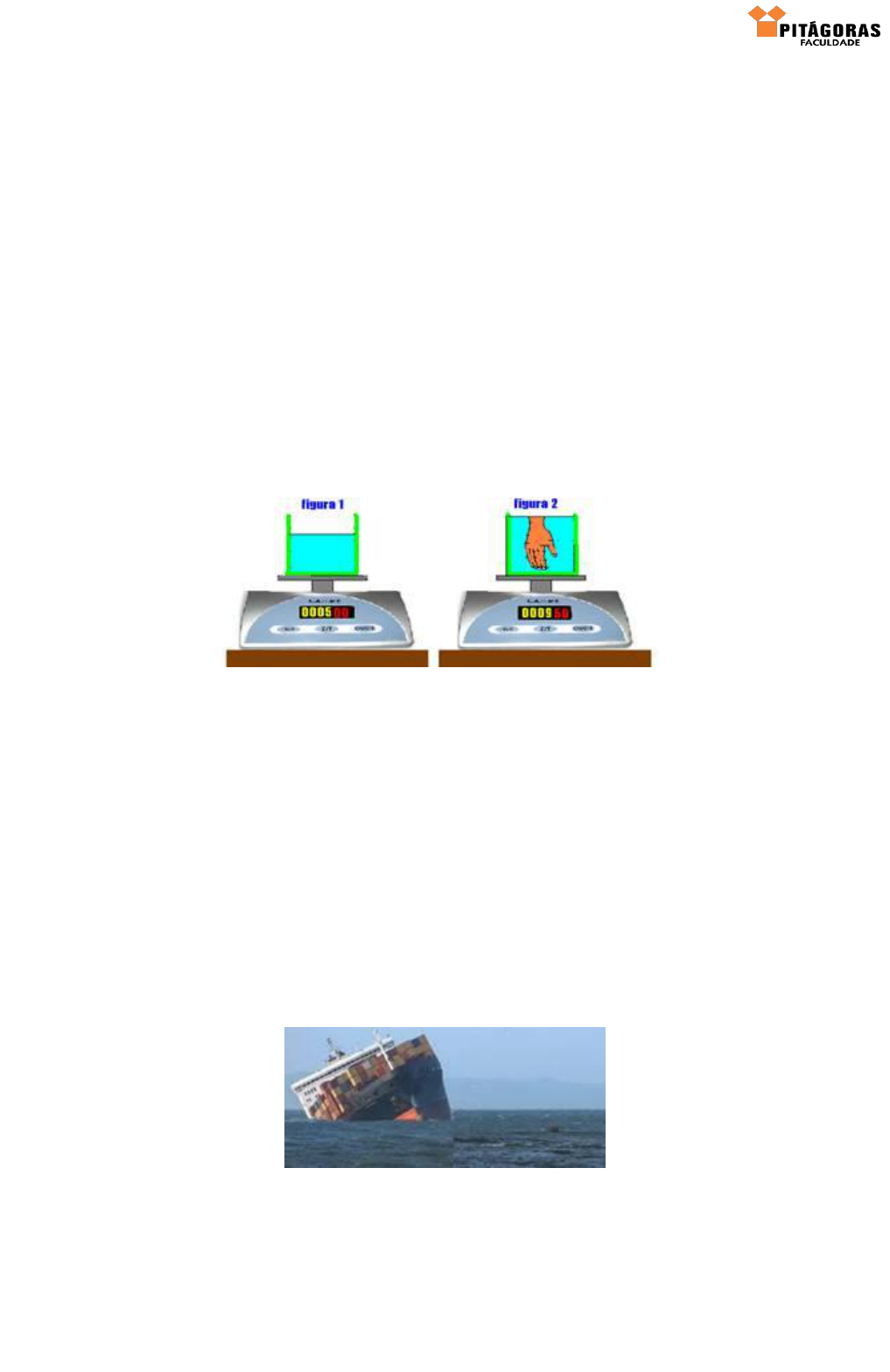 Exercícios 6 – Flutuação e Empuxo 1. Um bloco cúbico de madeira com peso específico γ = 6500N/m³,com 20 cm de aresta, flutua na água (ρH2O = 1000kg/m³). Determine a altura do cubo que permanece dentro da água. 2. Um bloco pesa 50N no ar e 40N na água. Determine a massa específica do material do bloco. Dados: ρH2O = 1000kg/m³ e g =10m/s². 3. Um corpo com volume de 2,0m³ e massa 3000kg encontra-se totalmente imerso na água, cuja massa específica é (ρH2O =1000kg/m³). Determine a força de empuxo sobre o corpo. 4. Um recipiente contendo água se encontra em equilíbrio sobre uma balança, como indica a figura 1. Uma pessoa põe uma de suas mãos dentro do recipiente, afundando-a inteiramente até o início do punho, como ilustra a figura 2. Com a mão mantida em repouso, e após restabelecido o equilíbrio hidrostático, verifica-se que a medida da balança sofreu um acréscimo de 4,5 N em relação à medida anterior. Calcule o volume da mão em cm3. 5. O empuxo é um fenômeno bastante familiar. Um exemplo é a facilidade relativa com que você pode se levantar de dentro de uma piscina em comparação com tentar se levantar de fora da água, ou seja, no ar. De acordo com o princípio de Arquimedes, que define empuxo, marque a proposição correta: a) Quando um corpo flutua na água, o empuxo recebido pelo corpo é menor que o peso do corpo. b) O princípio de Arquimedes somente é válido para corpos mergulhados em líquidos e não pode ser aplicado para gases. c) Um corpo total ou parcialmente imerso em um fluido sofre uma força vertical para cima e igual em módulo ao peso do fluido deslocado. d) Se um corpo afunda na água com velocidade constante, o empuxo sobre ele é nulo. e) Dois objetos de mesmo volume, quando imersos em líquidos de densidades diferentes, sofrem empuxos iguais. 6. Ao chocar-se com uma pedra, uma grande quantidade de água entrou no barco pelo buraco feito no casco, tornando o seu peso muito grande. A partir do descrito, podemos afirmar que: a) a densidade média do barco diminuiu, tornando inevitável seu naufrágio. b) a força de empuxo sobre o barco não variou com a entrada de água. c) o navio afundaria em qualquer situação de navegação, visto ser feito de ferro que é mais denso do que a água. d) antes da entrada de água pelo casco, o barco flutuava porque seu peso era menor do que a força de empuxo exercido sobre ele pela água do rio. e) o navio, antes do naufrágio tinha sua densidade média menor do que a da água do rio. 7. Um densímetro é um dispositivo que permite medir a massa específica ou densidade de fluidos. Um densímetro muito simples, para avaliar massas específicas, pode ser feito com um canudinho (D) de massa desprezível e um contrapeso (C) colado na base do mesmo. As figuras a seguir representam o efeito no densímetro (D), em equilíbrio, mergulhado em dois fluidos diferentes, Fluido 1 e Fluido 2 A partir da figura, é correto afirmar que a) o peso do densímetro no Fluido 1 é maior do que no Fluido 2. b) no Fluido 2, o densímetro recebe um empuxo maior do que no Fluido 1. c) o densímetro afunda mais no Fluido 2 porque a massa específica deste fluido é maior. d) o empuxo sobre o densímetro é o mesmo no Fluido 1 e no Fluido 2. e) o Fluido 1 é mais denso do que o Fluido 2. 8. Dois líquidos não miscíveis, A e B, com massas específicas ρA e ρB , respectivamente, são colocados em um recipiente junto com uma esfera cuja massa específica é ρ. Se ρA < ρ < ρB, indique qual das figuras apresenta a disposição correta dos líquidos e da esfera no recipiente. 9. Ana lança três caixas – I, II e III -, de mesma massa, dentro de um poço com água. Elas ficam em equilíbrio nas posições indicadas nesta figura: Sejam E(I), E(II) e E(III) os módulos dos empuxos sobre, respectivamente, as caixas I, II e III. Com base nessas informações, é CORRETO afirmar que a) E(I) > E(II) > E(III). b) E(I) < E(II) = E(III). c) E(I) = E(II) = E(III). d) E(I) > E(II) = E(III). 10. Uma garota de 24 kg vê um vendedor de bexigas infladas com gás hélio e pede à mãe 10 delas. A mãe compra apenas uma, alegando que, se lhe desse todas, a menina seria erguida do solo por elas. Inconformada com a justificativa, a menina queixa-se à sua irmã, que no momento estudava empuxo, perguntando-lhe qual seria o número máximo daquelas bexigas que ela poderia segurar no solo. Considerando o volume médio de cada bexiga, 2 litros, estime o número mínimo de bexigas necessário para levantar a garota. Em seus cálculos, considere a massa específica do ar igual a 1,2 kg/m3, 1 litro = 10-3 m3, g=10m/s2 e despreze as massas do gás e das bexigas.