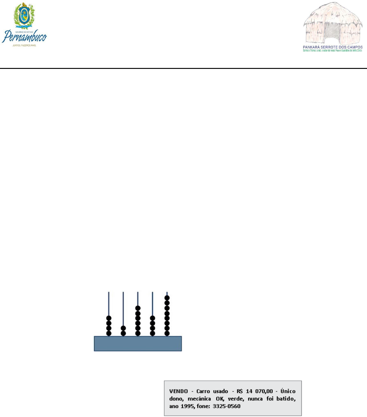GOVERNO DO ESTADO DE PERNAMBUCO SECRETARIA DE EDUCAÇÃO DO ESTADO DE PERNAMBUCO GERÊNCIA REGIONAL DE EDUCAÇÃO DO SERTÃO SUBMÉDIO SÃO FRANCISCO/FLORESTA ESCOLA ESTADUAL INDÍGENA JOSEFA ALICE DA CONCEIÇÃO ORGANIZAÇÃO DO POVO PANKARÁ DE SERROTE DOS CAMPOS – ITACURUBA – PE DISCIPLINA: Matemática PROFESSOR: Genilson Manoel da Silva ALUNO (A): AVALIACÃO DE MATEMÁTICA 1) Qual é o valor do algarismo 6 nos números abaixo? a) 715.065 = b) 1.6352.945= c) 95.615 = d) 268.145 = 2) Em uma cidade, o número de carros é formado por seis milhares, mais sete centenas, mais oito dezenas e mais seis unidades que são iguais a: a) 6786 b) 6876 c) 7686 d) 8766 3) O homem antigo inventou um instrumento para contar e fazer cálculos chamado ábaco. Dentre vários tipos de ábaco, um deles é composto de hastes verticais em que são encaixados pequenos anéis. O valor de cada anel muda de acordo com a posição da haste na qual será colocado. A haste na 1ª posição à direita representa a casa das unidades; na 2ª, a das dezenas; na 3ª, a das centenas, e assim por diante. O número representado no ábaco da figura anterior é: a) 42648. b) 46482. c) 84624. d) 86424. 4) Observe o anúncio do jornal. Posso afirmar que a ordem dos algarismos 7 e 4 mostradas no valor do carro são respectivamente: a) 1ª ordem ; 2º ordem. b) 2ª ordem ; 4º ordem. c) 3ª ordem ; 5ª ordem. d) 3ª ordem; 6ª ordem. 5) Caio percorreu 3000 metros de bicicleta em 30 minutos. Quantos quilômetros (km) ele percorrerá em 1 hora? a) 6 km b) 9 km c) 60 km d) 90 km 6) A distância da casa de Maria até a escola é de 1200m. Quantos quilômetros (km) Maria percorre, em um dia, para ir e voltar da escola? a) 1,2 km b) 2,4 km c) 12 km d) 2400 km 7) Sobre M.M.C e M.D.C, marque a alternativa correta: a) Quantos divisores tem o número 30? ( ) 8 divisores ( ) 4 divisores b) O maior divisor de um número é o próprio número. ( ) Não ( ) sim c) O MDC de 30 e 60 é: ( ) 60 ( ) 30 d) O MMC de 5 e 6 é: ( ) 30 ( ) 6 e) 870 é divisível por 3. ( ) Sim ( ) Não f) Todos os números pares são divisíveis por 2. ( ) Não ( ) Sim 8) Pedro está escrevendo um grande letreiro com a palavra "PANKARA", pintando uma letra por dia. Ele começou a escrever o letreiro na quarta-feira e trabalha todos os dias. Em que dia ele irá terminar o letreiro? ( ) Segunda-feira ( ) Terça-feira ( )Quarta-feira ( )Quinta-feira ( )Sexta-feira 9) Em uma escola estudam 1.920 alunos distribuídos igualmente em 3 períodos: manhã, tarde e noite. Pergunta-se a) Quantos alunos estudam em cada período? b) Quantos alunos estudam em cada sala. Por período se há 16 salas de aula?