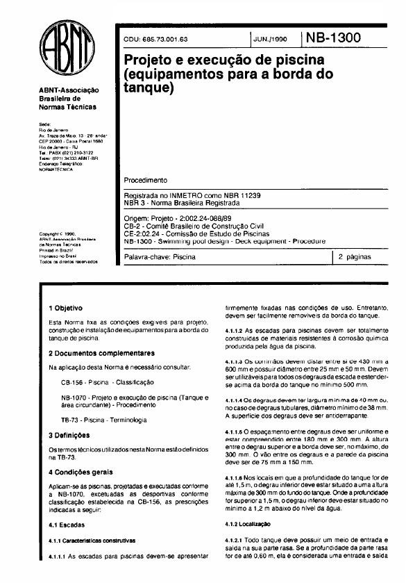 C6pia impressa pelo Sistema CENWIN ABNT-Associaeo Brasilelra de Normas TBcnicas CDU: 685.73.001.63 1 JUN./l990 1 NB-1300 Projeto e execu@o de piscina (equipamentos para a borda do tanque) Procedimento Registrada no INMETRO coma NBR 11239 NBR 3 - Norma Brasileira Registrada Origem: Projeto - 2:002.24-066/89 CB-2 - Comite Brasileiro de Constrqao Civil CE-2:02.24 - Comissao de Estudo de Piscinas NB-1300 - Swimming pool design Deck equipment - Procedure Palavra-chave: Piscina 2 paginas 1 Objetivo firmemente fixadas nas condQ3es de uso. Entrelanto, dwem ser lacilmenle removlveis da borda do tanque. Esta Norma fixa as condi@es exigiveis para projeto. constru~6oe inslala~aodeequipamenlos para a borda do tanque de piscina. 4.1.1.2 As escadas para piscinas devem ser 1Olalmenle conslruidas de materiais reSiSlenteS B corros~o quimlca produzida pela agua da piscina. 2 Documentos complementares Na aplica@o desta Norma 6 necess~rio COnSultar: CB-156 - Piscina Classifica@o 4.1.1.3 OS corrimHos devem distar entre si de 430 mm a 600 mmepossuirdi6metroentre25mm e50 mm. Devem serutiliz6veisparalodososdegrausdaescadaees1ender- se acima da borda do tanque no mimmo 500 mm. NE-1070. Projeto 8 execu@o de piscina (Tanque e area circundanle) - Procedimento TB-73 - Piscina Terminologia 3 DefiniG6es 4.1.11Osdegrausdevemterlarguramin~made40mmou, nocasodedegrauslubulares,di6metrominimode36mm. A superficie dos degraus deve ser antiderrapante. Oslermos1&nicosutilizadosnestaNormaes1~odefinidos na TB-73. 4.t.t.s 0 espa~amenloentredegrausdeve serunitormee eslar wmpreendido entre 160 mm e 300 mm. A altura entre o degrau superior e a borda deve ser, no mhximo. de 300 mm. 0 MO entre OS degraus e a par&? da piscina deve ser de 75 mm a 150 mm. 4 Condiqdes gerais Aplicam-se as pisclnas. projeladas e executadas cOnfOrme a NEi-1070, excetuadas as desponivas conforme classifica@o estabelecida na CB-156. as prescri@es indicadas aseguir: 4.1.1.6 NOS locais em que a profundidade do tanque for de ate 1.5m.odegrau interiordeveestarsituadoaumaaltura maximade mmdofundodotacque. On&? aprotundaade forsuperior a 1.5 m.odegrau interior deveestarsiluado no minim0 a 1.2 m abaixo do nivel da agua. 4.1 Eocadas 4.1.2 LccallZagBo 4.1.1.1 As escadas para plscinas devem-se apresentar 4.1.2.1 Todo tanque dwe possuir urn meio de entrada e saida na sua part8 rasa. Se a profundidade da pane rasa for de ate 0.60 m. ela 6 wnsiderada uma entrada e saida 2 C6pia impressa pelo Sistema CENWIN NB-1300/1990 natural. Se a profundidade for superior a 0,60 m, deve haver. nessa parte, pelo menos uma escada. 4.1.2.2Sendoaprofundidade maxima do tanquesuperiora 1,5 m deve haver, no mlnimo, mais uma escada na parte proiunda. Se 0 tanque for retangular. e a parte wm protundidade superior a 1.5 m tiver largura acima de 10 m, devemseinstaladasescadasemambasaslateraisdessa parte. 4.1.2.3 As escadas devem distar entre si no maxim0 20 m. 4.2 Equipamentos de salt0 4.2.1 OS equipamentos de SaltO. inChdYe pranchas, n80 SBO rewmendaveis em tanques que nao seiam de salto. OS equipamentos e tanques de salto devem seguir OS regulamentos dos organismos desporiivos oticiais. Caso sejam instaladosem piscinasdefinalidaden~odesportiva. devem atender ao prescrito em 4.2.2 a 4.2.8. 4.21 As pranchas, IrampOlinS e SUBS respectivas escadas devemserwnstruldosdemateriaisresistentes~corros~o. n&lo-absorventes, de facil limpeza e possuir supertlcie antiderrapante. 4.23 A prancha ou trampollm deve eStar situado a “ma altura mkima de 1 m acima do nivel da agua. 4.2.4 A profundidade minima da agua deve ser de 3 m. devendoestender-senum raiominimode3.5m apartirda proje@o da extremidade do equipamento de salt0 sobre 0 fund0 do tanque. 4.2.5 Adist&xia minimadosequipamentoSdeSaltoentre si e a borda lateral do tanque deve ser de 3 m. 4.2.6 E recomendavel que a ptoje@o do equipamen de salto no interior do tanque seja de pelo menos 1,O m em rela@o B borda do tanque. 4.2.7 c recomendavel que 0 comprimento da prancha seja no maxim0 de 4 m. e que a pane em balanp nao exceda a 60% do comprimento da prancha. 4.2.a~r~omend~velqueosequipamentosdeSaltosejam volladosparaosulmagnetiw,com umavaria@omaxima de 30” para oeste ou Me. excetuadas as plscinas ccbertas- techadas. 4.2.9 Deve existir dlspositivo que impqa 0 acesso a0 equipamento de salt0 sem prbvia autoriza@o.