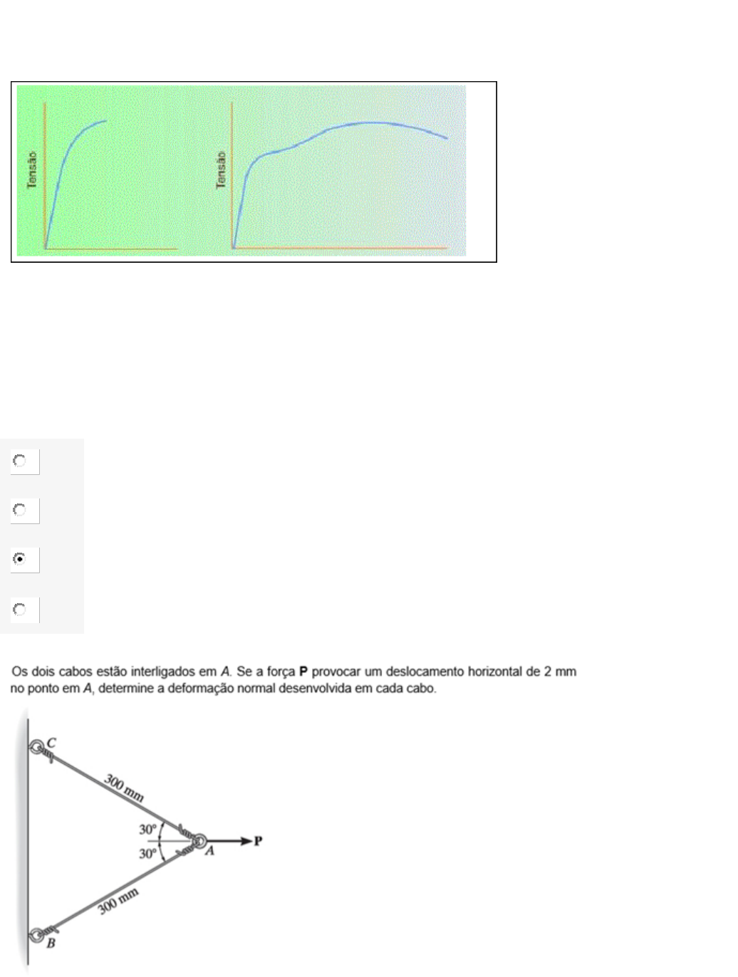 uestão 1/5 - Resistência dos Materiais Observe a figura, que mostra dois diagramas tensão-deformação para dois tipos de materiais. Analise as afirmações abaixo e assinale a alternativa correta. I – o diagrama da esquerda representa o comportamento de um material dúctil; II – materiais frágeis são aqueles que apresentam pouco ou nenhum escoamento antes da falha, por exemplo, o ferro fundido cinzento; III – materiais dúcteis são normalmente escolhidos para projetos estruturais pois, se ficarem sobrecarregados, exibirão grande deformação antes de falhar. A As afirmações I, II e III estão corretas B Apenas as afirmações I e III estão corretas C Apenas as afirmações II e III estão corretas D Apenas a afirmação III está correta uestão 2/5 - Resistência dos Materiais L=√L2A+L2B−2.LA.LB.cos(γ)L=LA2+LB2−2.LA.LB.cos(γ) e ε=Lf−LiLiε=Lf−LiLi A B C D uestão 3/5 - Resistência dos Materiais Um bloco cilíndrico curto de bronze C86.100, com diâmetro original de 38 mm e comprimento 75 mm, é colocado em uma máquina de compressão e comprimido até atingir o comprimento de 74,5 mm. Determine o novo diâmetro do bloco. Dado v=0,34. A 38,0000 mm B 38,0022667 mm C 38,0861 mm D 38,34 mm uestão 4/5 - Resistência dos Materiais A B C D uestão 5/5 - Resistência dos Materiais σ=FAσ=FA A B C D