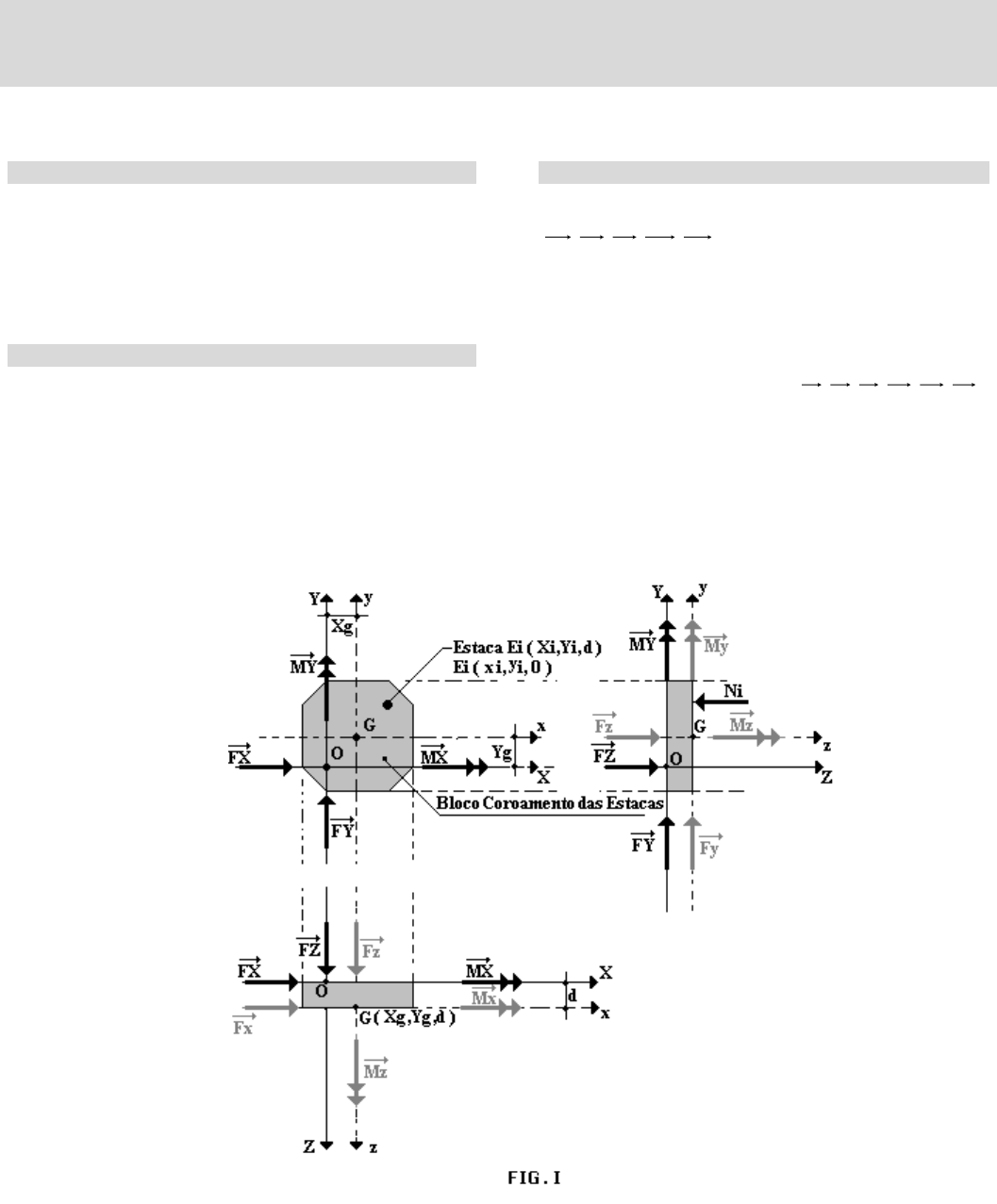 Carlos Vamberto de Araújo Martins 1 DETERMINAÇÃO DOS ESFORÇOS EM ESTACAS CRAVADAS VERTICALMENTE, CONSTITUINTES DE UM ESTAQUEAMENTO DE BLOCO SUJEITO A MOMENTOS E FORÇAS HORIZONTAIS E VERTICAIS. � 1 – CONSIDERAÇÕES PRELIMINARES O presente estudo visa apresentar a formulação necessária para obtenção dos esforços em estacas cravadas verticalmente, cujo estaqueamento a que pertencem esteja submetido a forças horizontais e verticais e a momentos. 2 – HIPÓTESES ADOTADAS 2.a – O Bloco de Coroamento é sobejamente rígido de forma a desprezar-se suas deformações face as das estacas; 2.b – O material das estacas atende à lei de Hooke; 2.c – Os afundamentos das estacas são iguais; 2.d – As deflexões das estacas são iguais. 3 – ESFORÇOS ATUANTES NO SISTEMA O sistema está submetido aos esforços , todos reduzidos ao sistema de eixos X,Y e Z (arbitrário) e com a origem em O. ( Ver fig. I ). Reduzindo os esforços ao sistema de eixos x, y e z, que passa pelo baricentro (G) da estacaria, teremos, para os esforços respectivos, , os seguintes módulos : � Fx = FX ( a ) Fy = FY ( b ) Fz = FZ ( c ) Mx = MX – FY.d + FZ.Yg ( d ) My = MY + FX.d - FZ.Xg ( e ) Mz =Mz,Fx+Mz,Fy = -FX.Yg+FY.Xg ( f ) Para que o sistema esteja em equilíbrio devemos ter, sendo n o número de estacas ( Ver FIGs I e II ): EMBED Equation.3 �� Ocorre que : Como os momentos geram forças reativas em forma de conjugados, o sistema de equilíbrio acima se simplifica em: ( 1 ) ( 2 ) ( 3 ) ( 4 ) ( 5 ) (6) NOTA: O segundo índice, indica o esforço que deu origem ao esforço referido. 4 – DETERMINAÇÃO DO BARICENTRO (G) DO ESTAQUEAMENTO a) Forças Normais (Ni): Da figura I, tiramos: Tendo em vista ( c ) e ( 3 ), teremos : ( A ) Analogamente : ( B ) Como o material da estaca obedece a lei de Hooke, teremos: , onde , sendo : (i – Alongamento ou encurtamento da estaca; Ai – Seção reta da estaca; Li – Comprimento de cálculo da estaca; Ki – Coeficiente de Rigidez. Em virtude de 2.c, teremos: (i = ( = constante Ni,Fz = - Ki.( Portanto, as expressões ( A ) e ( B ), tornam-se: ( C ) ( D ) b) Forças Horizontais ( Hi ,Vi ): De forma análoga, teremos: ; Sabemos que (Fig. II-a): Onde: (xi ((yi) - Deslocamento do bloco na direção x (y); Ei - Módulo de Elasticidade do material da estaca i; ( - Coeficiente adimensional que depende da vinculação da haste (estaca) com o bloco; Li - Comprimento livre da haste (estaca); Ji,x (Ji,y) - Momento de Inércia da seção reta da estaca na direção x (y); Assim, as coordenadas Xm e Ym podem ser escritas da forma: (C-1) (D-1) Onde: 5 – DETERMINAÇÃO DOS ESFORÇOS NAS ESTACAS 5.1 – Reação Axial devida à Carga Vertical Fz De ( 3 ) e ( c ) , teremos: , uma vez que (i = ( = constante Assim, Como Ni,Fz = - Ki.(i = -Ki.(, teremos : ( E ) 5.2 – Reação Axial devida aos Momentos Mx e My De ( 5 ) , teremos: Ainda observando-se a figura III – a, teremos : , sendo (i= constante Assim, De ( 4 ) , teremos ; Ainda, observando-se a figura III – b , teremos: sendo (i = constante Assim, Logo, 5.3 – Reação Axial Total (Ni) , ou seja : Para o caso particular em que o estaqueamento sofra o carregamento sobre eixos de simetria e as estacas preservem o mesmo material e dimensões, teremos: K1 = K2 = . . . . = Kn = constante Xg = 0 Yg = 0 E a expressão de Ni, acima , passa a ser : 5.4 – Reações Tangenciais(Horizontais e Verticais) devidas a Fx e Fy Reduzindo ao baricentro M(Xm,Ym), as Forças Externas , relativas aos eixos x e y, teremos a seguinte disposição: Reações Devidas a Sob a ação da força o bloco rígido sofre uma translação (x, Fx, na direção x´, gerando uma reação Hi,Fx na estaca i, também nessa direção, dada por: Que nos permite escrever: , que tendo em vista (1): Reações Devidas a : Analogamente, �� EMBED Equation.3 5.5 – Reações Tangenciais ( Horizontais e Verticais ) devidas a MZ',Fx e MZ',Fy a) Reações devidas a MZ',Fx : Sob a ação de MZ',Fx o bloco do estaqueamento, gira em torno do eixo z', perpendicular ao plano x'y', de um ângulo (, provocando o aparecimento de forças reativas Hi,Mz',Fx no plano dos topos das estacas. Para que o sistema esteja em equilíbrio, deveremos ter(Fig.V): ( F ) Considerando a estaca i: , ou, ainda, em vista de 2.d : Que permite escrever: Tendo em vista ( F ), teremos: Ocorre que: e Finalmente: Reações devidas a MZ',Fy : Analogamente, Ocorre que: , e Finalmente: 6 – RESUMO DOS ESFORÇOS NAS ESTACAS Todos os esforços até aqui analisados, foram obtidos considerando-se o sistema BLOCO. Tendo em vista a TERCEIRA LEI DE NEWTON, e, considerando-se o sistema ESTAQUEAMENTO, teremos, para os esforços genéricos nas estacas os mesmos aqui deduzidos com o sinal trocado. Observando a figura II, teremos: 6.1 – Esforço Axial Sendo, Xg e Yg dados por (C) e (D), respectivamente; ; Fz = Fz; Mx = Mx – Fy.d + Fz.Yg; My = My + Fx.d - Fz.Xg . 6.2 – Esforço Tangencial Horizontal Sendo, Ym dado por (D-1); ; Fx = Fx ; 6.3 – Esforço Tangencial Vertical Sendo, Xm dado por (C-1); ; Fy = Fy 6.4 - Momentos de Engastamento Estaca-Bloco Admitindo o engastamento perfeito da estaca no bloco do estaqueamento, teremos: e 6.5 – Regra de Sinais a ) Para as Forças Externas e nas Estacas, considerar a orientação dos eixos do presente estudo; b ) Para os momentos externos, considerar estes eixos e utilizar a regra universal do “Saca – Rolhas”. 7 – EXEMPLO NUMÉRICO Extraído da REVISTA ESTRUTURA N.º 94, pag. 55, do artigo Determinação das Reações em Blocos de Estacas Fincadas Verticalmente, dos autores Juan Pedro Zagni e Donato Cabral Garofano. � -------------------------------------------------------------------------------------------------------------------------------------------- Esforços Externos Fx = 5.000 kgf Fy = - 20.000 kgf Fz = 100.000 kgf Mx = 50.000 kgm My = 30.000 kgm D = 1m Dados Geométricos Estaca Xi ( m ) Yi ( m ) Li (m ) Ai (m2 ) Ei ( kgf/m2 ) Jxi ( m 4 