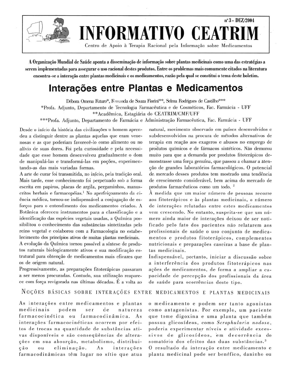 ml no 3 - DEZ/2004 - a - L - - - Ii INFORMATIVO CEATRIM Centro de Apoio à Terapia Racional pela Informação sobre Medicamentos . -c A Organização Mundial de Saúde aponta a disseminação de informação sobrè plantas medicinais como uma das estratégias a m; i3 2 m 8 serem implementadas para assegurar o uso racional destes produtos. Entre os problemas mais comumente citados na literatura encontra-se a interação entre ~lantas medicinais e os medicamentos, razão pela qual se constitui o tema deste boletim. 0 o - Interacões entre Plantas e Medicamentos C) Débora Ornena Futuro*, Fi~iti,iiida de Souza Fiorini*", Selma Rodiigues de Castilho*** "Profa. Adjunto, Departamento de Tecnologia Farmacêutica e de Cosméticos, Fac. Farmácia - UFF **Acadêmica, Estagiária do CEATRIM/CMF/UFF """Profa. Adjunto, Departamento de Farmácia e Administração Farmacêutica, Fac. Farmácia - UFF Descle o início da história das civilizações -o homem apren- deu a distinguir dentre as plantas aquelas que eram vene- nosas e as que poderiam favorecê-lo como alimento ou no alívio de suas dores. Foi pela curiosidade e pela necessi- dade que esse homem desenvolveu gradualmente o dom de manipulá-las e transformá-las em poções, experimen- tando-as das mais variadas formas. A arte de curar foi transmitida, no início, pela tradição oral. Mais tarde, esse conhecimento foi perpetuado sob a forma escrita em papiros, placas de argila, pergaminhos, manus- critos herbais e farma~o~éias. ' No aperfeiçoamento da ci- ência médica, tornou-se indispensável a conjugação de es- forços para o entendimento dos medicamentos criados. A Botânica ofereceu instnimentos para a classificação e a identificação das espécies vegetais usadas, a Química pos- sibilitou o conhecimento das substâncias sintetizadas pelo reino vegetal e colaborou com a Farmacologia no estabe- lecimento dos princípios ativos de muitas plantas medicinais. A evolução da Química tornou possível a síntese de produ- tos naturais biologicamente ativos e sua modificação es- trutural para obtenção de medicamentos mais eficazes que os de oiigem natural. Progressivamente, as preparações fitoterápicas passaram a ser menos 'procuradas. Contudo, sua utilização reapare- ce com força revigorada nas últimas décadas. É a volta ao natural, movimento observado em países desenvolvidos e subdesenvolvidos na procura de métodos alternativos de terapia em reação aos exageros e abusos no emprego de produtos químicos e de fáimacos sintéticos. Não demorou muito para que a demanda por produtos fitoterápicos de- monstrasse uma força genuína, que passou a chamar a aten- ção de grandes laboratórios farmacológicos. O potencial de. mercado desses produtos tem mostrado uma tendência de crescimento considerável, bem acima do mercado de produtos farmacêuticos como um todo. ' A medida que um maior número de pessoas recorre aos fitoterápicos e à s plantas medicinais, o número d e interações relatadas en t re es tes medicamentos vem crescendo. No entanto, suspeita-se que um nú- mero ainda maior de interações deixou de s e r noti- f icado pelo fato dos pac ien tes não relatarem aos profissionais d e s aúde o uso conjunto d e medica- men tos e produtos f i t o t e r áp i cos , complemen tos nutricionais e preparações caseiras a base de plan- tas medicinais. Indispensável , portanto, iniciar a discussão sobre a i n t e r f e r ê n c i a d o s p rodu tos f i t o t e r á p i c o s n a s ações de medicamentos, de forma a ampliar a ca- pac idade d e percepção dos profissionais d a á r ea de saúde para ocorrências des te tipo. As i n t e r a ç õ e s e n t r e m e d i c a m e n t o s e p l a n t a s m e d i c i n a i s p o d e m s e r d e n a t u r e z a f a r m a c o c i n é t i c a o u f a r m a c o d i n â m i c a . As i n t e r a ç õ e s ' f a r m a c o c i n é t i c a s oco r r em p o r e f e i - tos d e t rocas na q u a n t i d a d e d e s u b s t â n c i a s a t i - vas d i spon íve i s e s ão consequênc ia s d e a l t e r a - ções e m s u a abso.rção, me tabo l i smo , d i s t r i b u i - ç ã o o u e l i m i n a ç ã o . A s i n t e r a ç õ e s f a r m a c o d i n â m i c a s têm l u g a r no s í t i o q u e a t u a o m e d i c a m e n t o e p o d e m s e r t a n t o a g o n i s t a s como a n t a g o n i s t a s . Por exemplo , u m p a c i e n t e q u e tome d i g o x i n a e u m a p l a n t a q u e t a m b é m possua g l i cos ídeos , como S c r o p h u l a r i a nodosa , pode r i a expe r imen ta r n íve is e a t i v idade exces - s i v o s d e g l i c o s í d e o s , e m d e c o r r ê n c i a do somatór io d o s e f e i t o s d a s d u a s s ~ b s t â n c i a s . ~ O r e s u l t a d o d a i n t e r a ç ã o e n t r e m e d i c a m e n t o e p l a n t a med ic ina l pode s e r benéf ico , dan inho ou n e u t r o , d e p e n d e n d o d o n í v e l e d o t i p o d e i n t e r a ç ã o . A l g u m a s p l a n t a s p o s s u e m p r o p r i e d a d e s h i p o g l i c e m i a n t e s q u e p o d e m t e r u m e f e i t o s i n é r g i c o com os a g e n t e s h i p o g l i c e m i a n t e s d e p r e s c r i ç ã o . Em um p a c i e n t e p o u c o in fo rmado , um a g e n t e h i p o g l i c e m i a n t e d e o r igem v e g e t a l p o d e p rovoca r n í v e i s p e r i g o s a m e n t e r e d u z i d o s d e g l i cose no ~ a n g u e . ~ Ex i s t em i n t e r a ç õ e s po t enc i a i s b a s e a d a s no co- nhec imen to d a f a rmacod inâmica d e um produto e a a p l i c a ç ã o d e p r i n c í p i o s b á s i c o s d e f a r m a - co log ia . Ass im, t o d a s a s p l a n t a s q u e possuem e f e i t o l a x a n t e po r a u m e n t a r o bolo i n t e s t i n a l ( s e n e , c á s c a r a s a g r a d a , f r a n g u l a , P l a n t a g o ova ta ) pode r i am d i m i n u i r a abso rção d e de t e r - m i n a d o s m e d i c a m e n t o s ( c á l c i o , f 