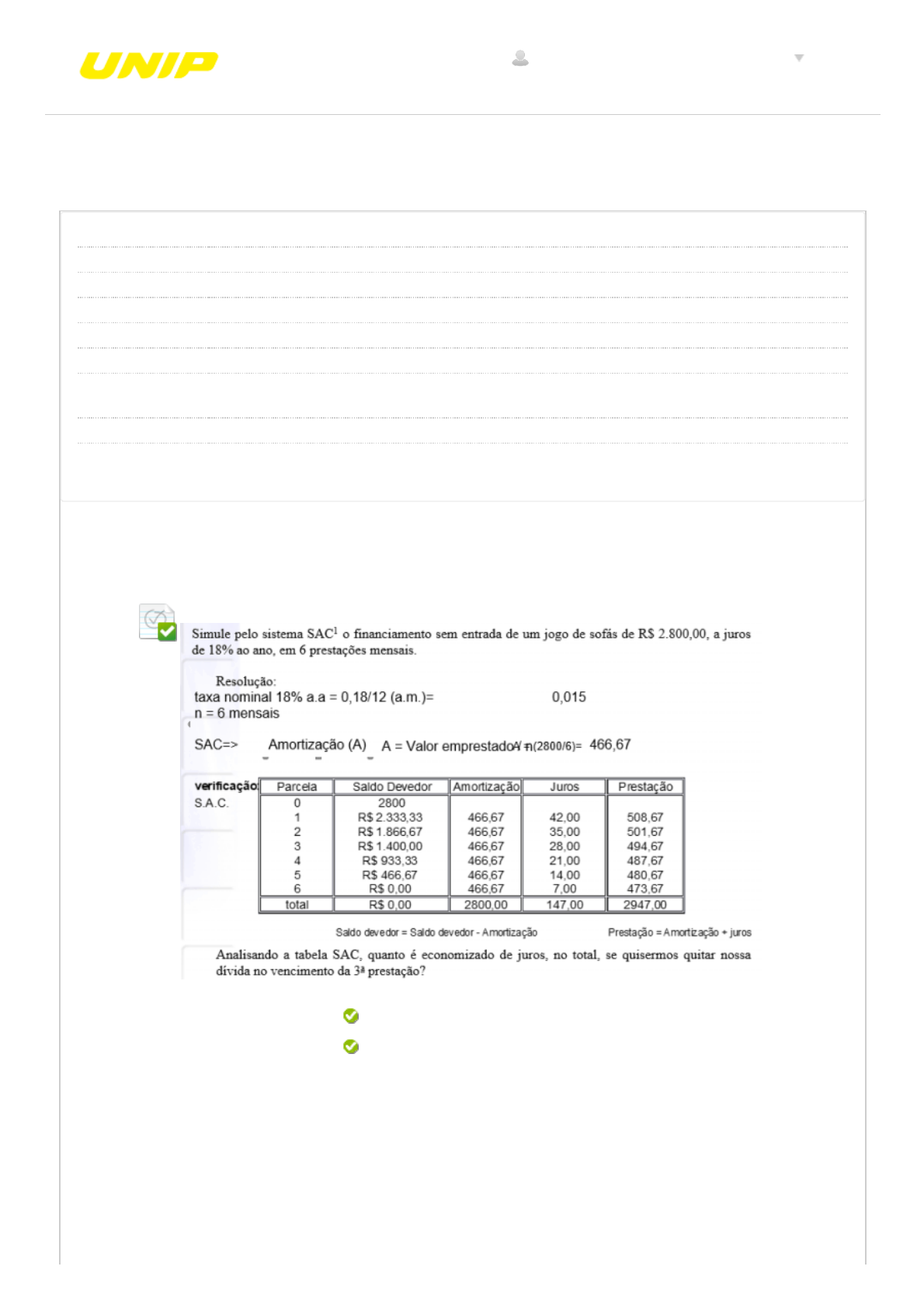 09/10/2018 Revisar envio do teste: QUESTIONÁRIO UNIDADE II – 6666-... https://ava.ead.unip.br/webapps/assessment/review/review.jsp?attempt_id=_9175943_1&course_id=_27878_1&content_id=_428854_1&return_c… 1/7 Revisar envio do teste: QUESTIONÁRIO UNIDADE II ESTUDOS DISCIPLINARES III 6666-10_SEI_AD_0118_R_20182 CONTEÚDO Usuário ana.castro33 @unipinterativa.edu.br Curso ESTUDOS DISCIPLINARES III Teste QUESTIONÁRIO UNIDADE II Iniciado 09/10/18 17:58 Enviado 09/10/18 18:31 Status Completada Resultado da tentativa 4,5 em 5 pontos Tempo decorrido 33 minutos Resultados exibidos Todas as respostas, Respostas enviadas, Respostas corretas, Comentários, Perguntas respondidas incorretamente Pergunta 1 Resposta Selecionada: a. Respostas: a. b. c. d. e. Feedback da resposta: Economizamos R$ 42,00 de juros. Economizamos R$ 42,00 de juros. Economizamos R$ 28,00 de juros. Economizamos R$ 21,00 de juros. Economizamos R$ 35,00 de juros. Economizamos R$ 147,00 de juros. Alternativa: A Resolução: 21+14+7=42 CONTEÚDOS ACADÊMICOS BIBLIOTECAS MURAL DO ALUNO TUTORIAISUNIP EAD 0,5 em 0,5 pontos ana.castro33 @unipinterativa.edu.br 09/10/2018 Revisar envio do teste: QUESTIONÁRIO UNIDADE II – 6666-... https://ava.ead.unip.br/webapps/assessment/review/review.jsp?attempt_id=_9175943_1&course_id=_27878_1&content_id=_428854_1&return_c… 2/7 Pergunta 2 Resposta Selecionada: e. Respostas: a. b. c. d. e. Feedback da resposta: Tomando consciência que a coluna da amortização (A) indica exatamente o valor que é abatido de sua prestação, podemos notar que PMT = J + A, lembre-se de que PMT é o valor de cada parcela. A parcela é composta dos juros acrescidos sobre o saldo total devedor (J) somado com o que de fato se está abatendo da dívida. Dessa forma, consultando a tabela, podemos dizer que no primeiro mês do valor da prestação de R$ 1.183,85; que nessa quantia pagamos R$ 262,50 de juros e abatemos ou amortizamos (A) do nosso �nanciamento: R$ 921,36 R$ 1.183,85 R$ 262,50 R$ 931,03 R$ 1.171,55 R$ 921,36 Alternativa: E Resolução: basta consultar a coluna da amortização linha 1. Pergunta 3 Resposta Selecionada: a. Respostas: a. b. c. d. e. Feedback da resposta: (Bacen) Um capital de R$ 4.000,00, aplicado a uma taxa de juros de 2% a.m., durante 3 meses, em regime de capitalização composta, gera um montante de quanto? R$ 4.244,83 R$ 4.244,83 R$ 4.161,60 R$ 244,83 R$ 4.044,83 R$ 4.180,00 Resposta: 0,5 em 0,5 pontos 0,5 em 0,5 pontos 09/10/2018 Revisar envio do teste: QUESTIONÁRIO UNIDADE II – 6666-... https://ava.ead.unip.br/webapps/assessment/review/review.jsp?attempt_id=_9175943_1&course_id=_27878_1&content_id=_428854_1&return_c… 3/7 Pergunta 4 Resposta Selecionada: a. Respostas: a. b. c. d. e. (CEF) Um capital de R$ 2.000,00 foi aplicado à taxa de 3% a.m. por 60 dias e o de R$ 1.200,00, à taxa de juros de 2% a.m. por 30 dias. Se a aplicação foi a juros compostos, qual o montante recebido? Atenção: a unidade de tempo da taxa e do tempo tem que ser a mesma. Nesse caso, sugerimos transformar o tempo em meses. R$ 2.121,80 R$ 2.121,80 R$ 1.224,00 R$ 4.244,83 R$ 3.300,00 R$ 3.345,80 Pergunta 5 Resposta Selecionada: b. Respostas: a. b. c. d. e. Feedback da (F.T. – CE) Obtenha o capital inicial que, aplicado a juros compostos durante 12 meses, à taxa de 4% ao mês, atinge o montante de R$ 1.000,00. R$ 624,60 R$ 1.000,00 R$ 624,60 R$ 601,60 R$ 1.624,60 R$ 524,60 0 em 0,5 pontos 0,5 em 0,5 pontos 09/10/2018 Revisar envio do teste: QUESTIONÁRIO UNIDADE II – 6666-... https://ava.ead.unip.br/webapps/assessment/review/review.jsp?attempt_id=_9175943_1&course_id=_27878_1&content_id=_428854_1&return_c… 4/7 resposta: Pergunta 6 Resposta Selecionada: a. Respostas: a. b. c. d. e. Feedback da resposta: A coluna da amortização (A) indica exatamente o valor que é abatido de sua prestação. Podemos notar que PMT = J + A, lembre-se de que PMT é o valor de cada parcela. A parcela é composta dos juros acrescidos sobre o saldo total devedor (J), somado com o que de fato se está abatendo da dívida. Dessa forma, consultando a tabela, podemos dizer que no quinto mês do valor da prestação de R$ 1.183,85; que nessa quantia pagamos R$ 223,19 de juros e abatemos ou amortizamos (A) do nosso �nanciamento: R$ 960,66 R$ 960,66 R$ 262,50 R$ 931,03 R$ 1.171,55 R$ 921,36 Alternativa: A Resolução: basta consultar a coluna da amortização linha 5. Pergunta 7 Resposta Selecionada: c. Respostas: a. b. c. d. e. Feedback da resposta: Podemos notar que PMT = J + A, lembre-se de que PMT é o valor de cada parcela. A parcela é composta dos juros acrescidos sobre o saldo total devedor (J), somado com o que de fato se está abatendo da dívida. Dessa forma, consultando a tabela, podemos dizer que no terceiro mês do valor da prestação de R$ 1.183,85; essa quantia amortizada na dívida foi de R$ 940,80. Os juros do nosso �nanciamento nessa parcela foram de: R$ 243,05 R$ 1.183,85 R$ 940,80 R$ 243,05 R$ 252,83 R$ 233,17 Alternativa: C Resolução: basta ler na linha da terceira parcela o valor da coluna dos juros. 0,5 em 0,5 pontos 0,5 em 0,5 pontos 09/10/2018 Revisar envio do teste: QUESTIONÁRIO UNIDADE II – 6666-... https://ava.ead.unip.br/webapps/assessment/review/review.jsp?attempt_id=_9175943_1&course_id=_27878_1&content_id=_428854_1&return_c… 5/7 Pergunta 8 Resposta Selecionada: e. Respostas: a. b. c. d. e. Feedback da resposta: Quanto além da prestação o suposto tomador do �nanciamento precisará dispor se quiser quitar o carro junto com o pagamento da prestação de número 10? R$ 15.338,70 RS 11.838,54 RS 11.338,54 R$ 15.838,70 R$ 16.350,87 R$ 15.338,70 Alternativa: E Resolução: basta consultar a coluna do saldo devedor no �nal da linha 10. Pergunta 9 Resposta Selecionada: c. Respostas: a. b. c. d. e. Feedback da resposta: Uma aplicação rende 12% de juros nominais ao ano. Em regime de juros compostos, quanto rende uma aplicação de R$ 30.000 no período de 4 meses? Dica: taxa mensal 