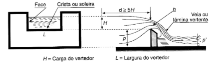 INTRODUÇÃO Os vertedores podem ser definidos como paredes, diques ou aberturas sobre as quais um líquido escoa. O termo aplica-se também aos extravasores de represa. Os vertedouros ou vertedor devem ser construídos com forma geométrica definida e seu estudo é feito considerando-os como orifícios sem a parte superior. A presença do vertedor que essencialmente uma parede com abertura de determinada forma geométrica, colocada na maioria dos casos perpendicular a corrente elevando o nível d’água a sua montante até este nível atinja a sua cota suficiente para produzir uma lamina sobre o obstáculo, compatível com a vazão descarregada. Eles podem ser instalados em canais naturais ou artificiais. O vertedor retangular sem contração lateral são os mais utilizados para fins de medição de vazão em canais menores. OBJETIVO Verificar o funcionamento de um vertedor como um medido de vazão em escoamento a superfície livre para pequenos cursos d’água. E ainda determinar o valor do coeficiente K para os quatro tipos de vertedor utilizado. BASE TEÓRICA A borda horizontal denomina – se crista ou soleira. As bordas verticais constituem as faces do vertedor. A carga do vertedor, H, é a altura atingida pelas águas, a contar da cota da soleira do vertedor. Devido a depressão (abaixamento) da lâmina vertente junto ao vertedor a carga H deve ser medida a montante, a uma distância aproximadamente igual ou superior a 5H. FIGURA 1: Esquema das variáveis de um vertedor. Onde: H – É a altura da lamina d’água a cima da soleira. L – É a largura do vertedor. e – É a espessura do vertedor. p – Altura ou profundidade do vertedor. P’ – Altura de água a jusante do vertedor. 3.1. Vertedouros de paredes delgadas Vertedor retangular de parede delgada sem contração FIGURA 2: Vertedor retangular sem contração. Para orifícios retangulares de grande dimensão foi deduzida a seguinte fórmula: Adaptando-a para o vertedor temos h1 = 0, pois a parte superior (h1) da parte do orifício fica eliminada e h2 passa a ser o H. Portanto a fórmula para o vertedor retangular fica: Assim: Vertedor retangular de parede delgada com contração - Importância da contração As contrações ocorrem quando a largura do vertedor é inferior à do canal.3- Duas contrações. 2- Uma contração Sem contração FIGURA 3: Esquema de vertedouros com e sem contração. Onde: L – Distância entre as contrações. L’ – Largura da veia liquida após passar pela contração. B – Largura do canal. Nos casos 1 e 2 deve-se corrigir o valor de L para L’, dessa forma temos: Dessa forma para os vertedores com contração temos a seguinte expressão: Assim, para os vertedouros de duas contrações ficamos: Vertedor Triangular Os vertedores triangulares possibilitam maior precisão na medida de descargas correspondentes a vazão reduzida (Q < 0,03 m³/s), porque é mais fácil medir a altura H do que nos vertedores retangulares. Na prática somente são empregados os que tem forma isósceles, sendo mais usuais os de 90º. FIGURA 4: Esquema de um vertedor triangular. Em função do b Usando Cd = 0,604 e g = 9,81m/s2 a equação acima fica: 3.2. Vertedouros retangulares de parede espessa Um vertedor é considerado de parede espessa quando a soleira é suficientemente espessa para que na veia aderente se estabeleça o paralelismo dos filetes. e > 0,66H FIGURA 5: Modelo de vertedor com parede espessa. MATERIAIS E METODOS 4.1. Materiais O aparato para medição de vazão consiste de bancada hidráulica, provida de uma bomba, reservatório graduado para medição de vazão volumétrica, ponta limnimétrica, cronometro, quatro vertedouros de plástico, dois em forma de triangulo com 90º e 30º, e dois retangulares com e sem contração. 4.2. Metodologia Com a regulamentação do fluxo através de uma válvula da bancada hidráulica e com os aparatos citados, pode-se retirar as leituras a fim de se calcular qual a altura da lamina d’água. De modo que estabeleceu-se um fluxo na altura da soleira e com a ponta limnimétrica retirou-se a medida H0 e em seguida com o fluxo passando na soleira de modo a medir a vazão utilizou-se a ponta novamente a fim de obter a medida do fluxo passante acima da soleira H1, encontrando H. QUADRO 1: Dados do vertedor de soleira com duas contrações. Vertedor de soleira delgada com duas contrações H0 (mm) H1 (mm) H (mm) Vazão (m3/s) 65,1 23,4 41,7 0,0005 QUADRO 2: Dados do vertedor de soleira sem contração. Vertedor de soleira delgada sem contração contrações H0 (mm) H1 (mm) H (mm) Vazão (m3/s) 67,7 57,0 10,7 0,0065 QUADRO 3: Dados do vertedor de soleira triangular 90°. Vertedor de soleira delgada triangular 90° H0 (mm) H1 (mm) H (mm) Vazão (m3/s) 63,8 24,0 39,8 0,0005 Vertedor de soleira delgada triangular 30° H0 (mm) H1 (mm) H (mm) Vazão (m3/s) 58,1 1,3 56,8 0,00416 58,1 14,9 43,2 0,000238 58,1 28,0 30,1 0,0001136 QUADRO 4: Dados do vertedor de soleira triangular 30°. RESULTADOS 5.1. Cálculo do coeficiente K para os vertedouros Pelas formulas: Obteve-se QUADRO 5: Resultado dos valores calculados de K. ___________ Triangular 30° Triangular 90° Com duas contrações Sem contração K 5,41 1,58 27,31 2,71 5.2. Analise do vertedor triangular de 30° QUADRO 6: Resultado dos valores calculados de K para o vertedor triangular de 30°. L(m) K Triangular 30º 0,0568 5,41 0,043 0,62 0,0301 0,72 Pela Formula: E considerando o coeficiente de descarga igual á 0,62, temos: QUADRO 7: Resultado dos valores calculados da vazão. L(m) Q(m3/s) Teórico Q (m3/s) Experimental Triangular 30º 0,0568 0,00037 0,00416 0,043 0,000187 0,000238 0,0301 0,000077 0,0001136 Dessa forma podemos perceber que os valores se aproximam do experimental na primeira medição de vazão, já nas duas últimas os valores se distanciam um pouco. 5.3. Situações práticas Estações Fluviométricas Os métodos fluviométricos sempre se referem a uma seção do rio e, consequentemente, a uma