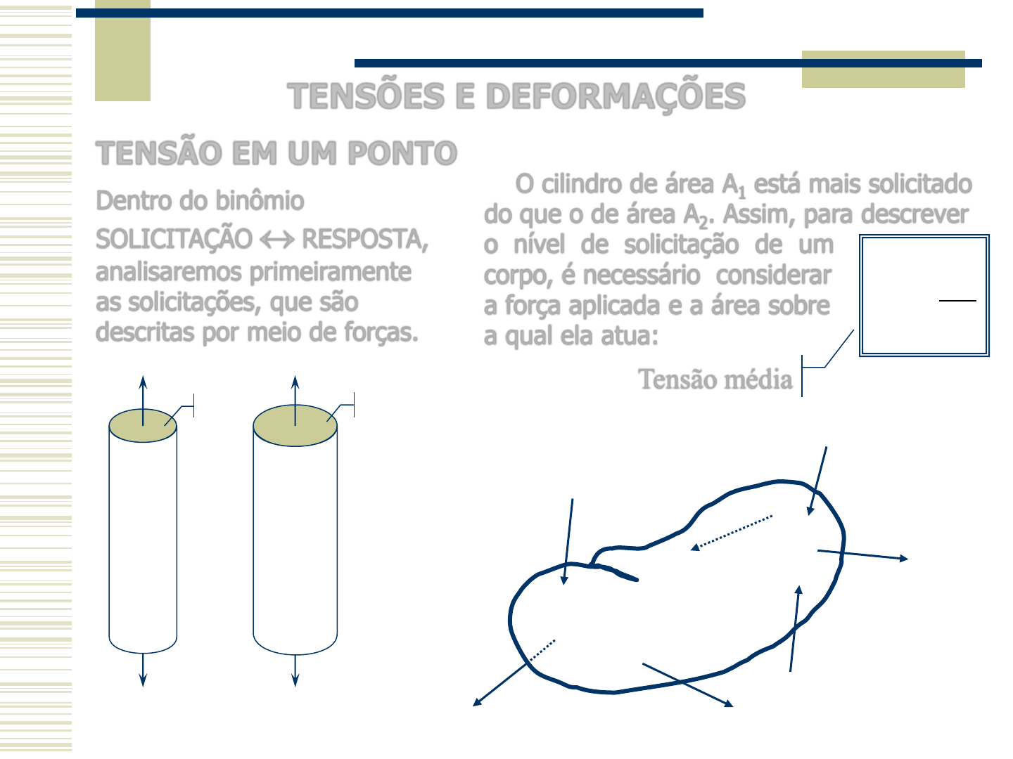 MET162 – Transformação Mecânica dos Metais TENSÕES E DEFORMAÇÕES Dentro do binômio SOLICITAÇÃO RESPOSTA, analisaremos primeiramente as solicitações, que são descritas por meio de forças. TENSÃO EM UM PONTO A1 A2 O cilindro de área A1 está mais solicitado do que o de área A2. Assim, para descrever o nível de solicitação de um corpo, é necessário considerar a força aplicada e a área sobre a qual ela atua: Tensão média MET162 – Transformação Mecânica dos Metais t s q n Exercício 1.1 (Ref. 3) MET162 – Transformação Mecânica dos Metais VARIAÇÃO DA TENSÃO COM O PLANO DE CORTE A tensão no ponto P deverá ser avaliada para cada plano de corte. MET162 – Transformação Mecânica dos Metais DA1 a a n DA s t P P Exercício 1.2 (Ref. 3) Exercícios 1.3, 1.4 e 1.5 (Ref. 3) Para um plano genérico, Exemplo 1.1 (Ref. 4) MET162 – Transformação Mecânica dos Metais O desmembramento da tensão s1 nas duas tensões s(a) e t(a) é, de fato, uma transformação de coordenadas: Rigorosamente, tal transformação deveria ser feita com as forças, pois tensões não são grandezas vetoriais. Tendo isto em mente, é possível aceitar esta “licença”. Uma abordagem cientificamente mais rigorosa do estado de tensões em um ponto pode ser feita a partir da representação do ponto P por um corpo de pequenas dimensões dx, dy, dz, mantido em equilíbrio por forças tais como F1, F2 e F3: Cada uma dessas forças pode ser resolvida em componentes paralelas às três direções coordenadas, e se cada uma das nove componentes é dividida pela área em que atua, o estado total de tensões em P é descrito, então, pelas nove componentes de tensão: MET162 – Transformação Mecânica dos Metais Esta coleção de tensões é chamada de tensor de tensões, designado por sij . Em notação tensorial, é expresso por: Significado físico da notação de duplo subscrito: O subscrito i define a normal ao plano sobre o qual uma componente age, enquanto o subscrito j define a direção (x, y ou z) da componente; Uma combinação de i e j em que ambos são positivos ou ambos são negativos define uma componente positiva; Uma combinação de i e j em que um é positivo e o outro é negativo define uma componente negativa. MET162 – Transformação Mecânica dos Metais No tensor de tensões, dois subscritos idênticos (xx) indicam uma tensão normal, enquanto dois diferentes (xy) indicam uma tensão cisalhante. Para simplificar, as tensões normais serão designadas com apenas um subscrito (si) e as cisalhantes como tij. Além disso, o equilíbrio implica na ausência de efeitos rotacionais em torno de qualquer eixo, de modo que tij = tji . Assim: Embora as componentes do tensor de tensões estejam perfeitamente definidas, alguns aspectos físicos do estado de tensões não se evidenciam a partir da equação do tensor. Em muitas situações reais, algumas componentes podem ser nulas. O exemplo mais óbvio é o do ensaio de tração. Mesmo no caso de estados de tensão mais genéricos, há um conjunto de eixos coordenados (1, 2, 3) para o qual as tensões cisalhantes desaparecem. As tensões normais s1, s2 e s3 , ao longo desses eixos, são chamadas tensões principais. Os valores das tensões principais são as três raízes da seguinte equação cúbica: onde: Exemplos 1.2 e 1.3 (Ref. 4) MET162 – Transformação Mecânica dos Metais Como vimos na análise da tração pura, os planos em que as tensões cisalhantes se anulam são ortogonais entre si e, neles, a tensão normal é máxima ou mínima. Pode-se mostrar, também, que uma destas tensões normais é o maior valor de s agindo em P, uma outra dá o menor valor e a terceira é um valor intermediário. Os planos onde t = 0 recebem o nome de “Planos Principais” e as tensões s1, s2 e s3 recebem o nome de “Tensões Principais”. Por convenção, s1 ³ s2 ³ s3 . s > 0 tração s < 0 compressão. Os coeficientes I1, I2 e I3 independem do sistema de coordenadas escolhido e, por isso, são chamados de invariantes. Como resultado disso, as tensões principais para um dado estado de tensões são únicas (s1, s2, s3). Além de permitirem o cálculo das tensões principais, os invariantes ganharão importância no próximo capítulo, na previsão do início do escoamento. MET162 – Transformação Mecânica dos Metais CÍRCULOS DE MOHR 2a A s t tmax D E t ½(s1-s2) 0 Exercício 1.6 (Ref. 3) Os ângulos a e 2a são contados sempre no mesmo sentido. 0 Exercícios 1.7 e 1.8 (Ref. 3) Se t é positivo, provoca “giro” no plano A em torno de O no sentido horário. MET162 – Transformação Mecânica dos Metais CÍRCULOS DE MOHR PARA TRÊS DIMENSÕES plano1 plano3 plano2 s1 s3 tmax s2 plano1 plano2 plano3 É possível demonstrar que os valores de s e t para um plano com inclinação qualquer passando por P corresponderão sempre a pontos dentro da região sombreada do círculo de Mohr. MET162 – Transformação Mecânica dos Metais MET162 – Transformação Mecânica dos Metais s1 tmax s2 = s3 = TRAÇÃO PURA MET162 – Transformação Mecânica dos Metais s1 s3 = s2 tmax ESTADO PLANO DE TENSÕES MET162 – Transformação Mecânica dos Metais s1 s3 tmax s2 DIMINUIÇÃO DA TENSÃO DE CISALHAMENTO MÁXIMA MET162 – Transformação Mecânica dos Metais s1 tmax = 0 s2 = s3 = ESTADO HIDROSTÁTICO DE TENSÕES MET162 – Transformação Mecânica dos Metais s1 s3 tmax s2 AUMENTO DA TENSÃO DE CISALHAMENTO MÁXIMA Exercícios 1.9 e 1.10 (Ref. 3) Exemplo 1.5 (Ref. 4) MET162 – Transformação Mecânica dos Metais Analise cuidadosamente as três aplicações apresentadas no item 1.6 da Ref. 3 e proponha mais uma outra aplicação diferente. Descreva os estados de tensão correspondentes e desenhe os respectivos círculos de Mohr. Haverá um sorteio para apresentação da análise das aplicações e do resultado da aplicação proposta. Exercício Extra MET162 – Transformação Mecânica dos Metais Deformação convencional A D