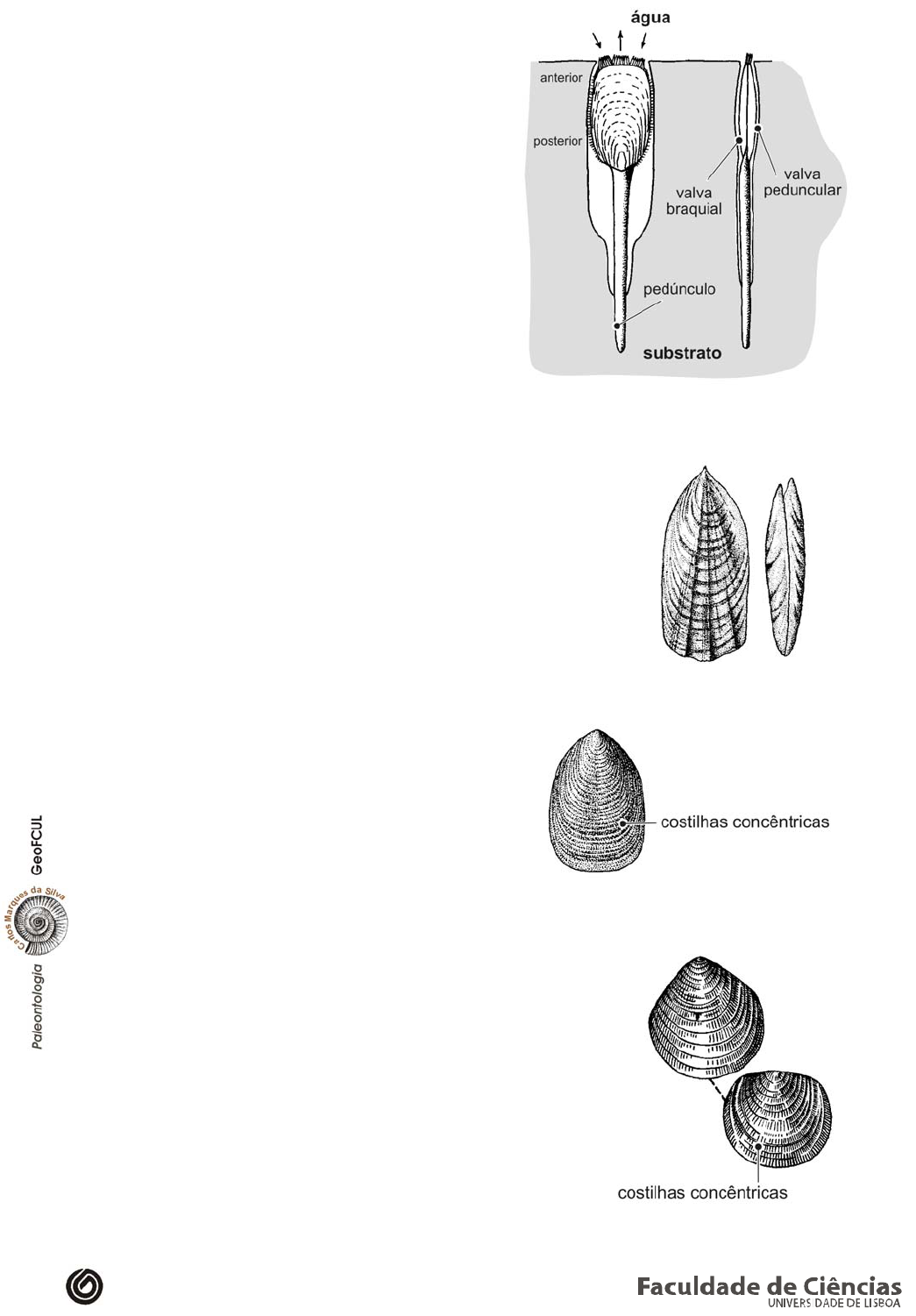 Departamento de GEOLOGIA 4.2. IDENTIFICAÇÃO DE FÓSSEIS DE BRACHIOPODA Filo Brachiopoda Classe Lingulata Lingulida Lingula BRUGUIÈRE, 1797 Fig. 4.1 Lingula sp. Modo de vida. Extraído de CLARKSON (1984: 149). Fig. 4.2 Lingula unguis (Linnaeus). De BONDARENKO & MIKHAILOVA (1984: 393). Concha quitino-fosfatada, pequena (1-3 cm), muito fina, levemente biconvexa, equivalve e praticamente equilateral. Bordos da concha subparalelos ou convexos, conferindo-lhe contorno geral sub-rectangular a elíptico. Umbo terminal, posterior. Concha lisa, apresentando, contudo, finas estrias de crescimento concêntricas. Por vezes, pode apresentar finas estriações radiais. Paleoecologia: Organismos endobentónicos cavículas, suspensívoros. Ambientes marinhos bentónicos, pouco profundos (mais frequentemente) a profundos, de águas quentes e salinidade normal. Toleram, temporaria- mente, condições de salinidade reduzida. Distribuição estratigráfica: Ordovícico à actualidade. Lingulella SALTER, 1866 Fig. 4.3 Lingulella davisii (M’Coy). Extraído de COX (1964: est. 1). Concha quitino-fosfatada, pequena (1-3 cm), fina, levemente biconvexa, equivalve e praticamente equilateral. Bordos da concha subparalelos ou convexos, conferindo-lhe contorno geral sub-rectangular a oval. Umbo terminal, posterior. Concha apresentando ornamentação fina, constituída por leves costilhas concêntricas. Difere de Lingula, sobretudo, por aspectos da morfologia interna da concha. Paleoecologia: Organismos endobentónicos cavículas, suspensívoros. Ambientes marinhos bentónicos, pouco profundos e de salinidade normal. Distribuição estratigráfica: Câmbrico a Ordovícico médio. Obulus EICHWALD, 1866 Fig. 4.4 Obulus apollonis Eichwald. De BONDARENKO & MIKHAILOVA (1984: 393). Concha quitino-fosfatada, pequena (1-3 cm), espessa, biconvexa, praticamente equilateral. Bordos da concha subparalelos ou convexos, conferindo-lhe contorno geral sub-rectangular a oval. Umbo terminal. Concha apresentando ornamentação fina, constituída por finas costilhas concêntricas e, por vezes, estriações radiais. face interna das valvas com evidentes impressões musculares e de outros elementos do corpo mole. Paleoecologia: Organismos epibentónicos sésseis pedunculados, suspensívoros. Ambientes marinhos bentónicos, pouco profundos e de salinidade normal. Fig. 4.1 - Lingula Fig. 4.2 - Lingula Fig. 4.3 - Lingulella Fig. 4.4 - Obulus BRACHIOPODA 25 Distribuição estratigráfica: Câmbrico médio a Ordovícico inferior. Observações: A enorme acumulação de conchas de Obulus, nas regiões de São Petersburgo, na Rússia, e do sul do Báltico, origina uma rocha, o “arenito de Obulus”, que é explorada industrialmente para a obtenção de fosfatos. Classe Calciata Craniida Crania RETZIUS, 1781 Fig. 4.5 A - Crania craniolaris (Linnaeus). De BONDARENKO & MIKHAILOVA (1984: 394). B - Crania sp. em posição de vida. Concha carbonatada, pequena ( 1 cm), espessa, com contorno arredondado e bordo da charneira (posterior) sub-rectilíneo. Valva braquial cónica, baixa, com umbo do lado posterior do centro. Concha ostentando ornamentação finamente granulosa e fortes linhas de crescimento. Valvas ostentando, internamente limbo holoperiférico, dois pares de cicatrizes musculares grandes, sendo as posteriores sobrelevadas. Paleoecologia: Organismos epibentónicos sésseis cimentados, suspensívoros. Ambientes marinhos bentónicos, pouco profundos a profundos, carbonatados, de águas quentes e de salinidade normal. Distribuição estratigráfica: Cretácico à actualidade. Trimerellida Trimerella BILLINGS, 1862 Fig. 4.6 A - Trimerella sp. De TASCH (1973: 268). B - T. ohioensis Meek. MOORE et al. (1952: 223). Concha carbonatada, pequena a média (4-6 cm), espessa, biconvexa, praticamente equilateral. Valva peduncular com ampla pseudointerárea. Possui complexo sistema de septos de cavidades umbonais no interior de ambas as valvas, provavelmente servindo como plataformas de fixação muscular. Concha lisa. Paleoecologia: Organismos epibentónicos sésseis pedunculados, suspensívoros. Ambientes marinhos bentónicos, pouco profundos, carbonatados, de águas quentes e de salinidade normal. Participa na formação de biohermas (pequenas estruturas recifais). Distribuição estratigráfica: Silúrico. Orthida Orthis DALMAN, 1828 Fig. 4.7 Orthis calligramma Dalman. De PIVETEAU (1952: 47). Concha carbonatada, pequena a média (2-3 cm), biconvexa a plano-convexa, com contorno semicircular, praticamente equilateral. Valva peduncular convexa, valva braquial suavemente convexa a aplanada. Bordo da charneira rectilíneo. Deltírio simples (abertura triangular da valva peduncular pela qual o pedúnculo protrui), aberto. Ornamentação constituída por numerosas costilhas radiais fortes, subiguais, formando cristas angulosas. Fig. 4.7 - Orthis Fig. 4.5 - Crania Fig. 4.6 - Trimerella BRACHIOPODA 26 Fig. 4.10 - Piarorhynchia Paleoecologia: Organismos epibentónicos sésseis pedunculados, suspensívoros. Ambientes marinhos bentónicos, pouco profundos, de salinidade normal. Distribuição estratigráfica: Ordovícico (Arenigiano- Landeilano). Rhynchonellida Rhynchonella FISCHER, 1809 Fig. 4.8 Rhynchonella loxia Fischer. De PIVETEAU (1952: 92). A - Vista dorsal (da valva braquial); B - Vista da comissura frontal ou anterior; C - Perfil. Concha carbonatada, pequena (1-1,5 cm), com contorno subtriangular, forma geral subtetraédrica. Valva peduncular em geral convexa, mas côncava anteriormente, onde apresenta um único sulco muito pronunciado; valva braquial semiglobosa, com uma ampla prega anterior. Ornamentação variável, de quase inexistente a constituída por numerosas costilhas radiais bem marcadas, originando comissura frontal em “zig- zag”. Forame de dimensões médias. Internamente, apresenta fortes placas dentais; septalium pouco profundo, conduzindo anteriormente a um curto septo braquial mediano. Paleoecologia: Organismos epibentónicos sé