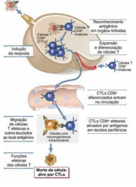 LINFÓCITOS T CD8+ - DIFERENCIAÇÃO E FUNÇÕES Restrito ao MHC de classe I Antígenos intracelulares (citosólicos – célula produz o antígeno): vírus, tumores e enxertos. Função efetora: eliminação direta do antígeno. DIFERENCIAÇÃO DE LINFÓCITOS T CD8+: DE CÉLULAS IMATURAS A CITOTÓXICAS Antígenos intracelulares (citosólicos) Vírus Tumores Enxertos Incapaz de matar num primeiro momento, só adquire essa capacidade depois que é apresentado. Começa a se proliferar por divisões mitóticas que saem do órgão linfóide para procurar o antígeno que foi apresentado para ele. O LINFÓCITO RECONHECE OS ANTÍGENOS DENTRO DAS CÉLULAS. O linfócito mata a célula que contém o antígeno. Há duas apresentações de antígeno: uma nos órgãos linfóides e outra no órgão que está infectado. O linfócito T CD8+ sobrevive após programar a célula a apoptose e eliminá-la. A morte da célula pelo linfócito T não influencia na vizinhança. CTLs EFETORES Grânulos lisossômicos modificados e citocinas. Perforinas Granzimas IFNγ – ativa macrófagos O linfócito T CD8+ quando é ativado produz um monte de grânulos e citocinas no seu citoplasma e quando ocorre o reconhecimento de antígenos esses grânulos caem sobre a APC, que induzem a morte celular. **O LINFÓCITO T CD4+ TAMBÉM PODE ATIVAR O CD8+. PAPEL DAS CÉLULAS T CD4+ NA ATIVAÇÃO DAS CÉLULAS T CD8+ Na primeira via – agem diretamente nos receptores da célula T CD8+. O T CD4+ se diferencia em TH1. Na segunda via – o CD4 aumenta na expressão de B7 na superfície da APC, estimulando o CD8 de uma forma mais forte. *B7 é um coestimulador que está na superfície da APC, QUE SE LIGA AO CD28. **UM PACIENTE COM HIV DEPLETA CD4+ E POR ISSO, DEPLETA CD8+ TAMBÉM, MESMO QUE EM MENOR QUANTIDADE. Quanto mais coestimulador tiver, mais o linfócito T CD8+ vai ser estimulado. Após a ligação de CD40L e CD40 que vai aumentar a produção de coestimulador. As APCs que tem coestimuladores (mas essa produção é estimulada pelo CD4+) LICENCIAMENTO DAS APC PARA ESTIMULAR AS CTL (CÉLULA T CITOLÍTICA) O aumento de IL-12 também estimula o linfócito T. **O CD4+ PARTICIPA DA ATIVAÇÃO DO CD8+ ATRAVÉS DA PRODUÇÃO DE CITOCINAS E PELO LICENCIAMENTO DE APC. PAPEL DAS CITOCINAS (PRODUZIDAS PELO CD4+) IL-2 – promove a proliferação e diferenciação das células TCD+ em CTLs e células de memória. IL-12 e INF-1 – promovem a diferenciação de TCLs imaturas em efetoras. IL-15 – sobrevivência das CTLs de memória IL-21 – indução das CTLs de memória e prevenção da exaustão das CTL. EXAUSTÃO DAS CÉLULAS T A exaustão não é um processo bom, pois permite a cronicidade da infecção viral e o desenvolvimento do tumor. Também pode ser um alvo farmacológico. APC vem e apresenta pro CD8, o CD8 ativo se liga e procura outras células com vírus e induz a morte celular. O CD8 produz IFNgama que ativa macrófagos para ajudar a matar a célula. Na exaustão – com o tempo o linfócito T CD8+ vai sofrendo modificações, diminuindo a taxa de IFNgama e aumenta o PD-1 (receptor inibidor do ligante PD-1) e o CTLA4 (receptor inibidor que se liga ao B7) e eles se ligam nos respectivos inibindo a morte celular. FUNÇÕES EFETORAS DOS LINFÓCITOS T CD8+ CITOTÓXICOS MECANISMOS DE CITOTOXIDADE MEDIADOS POR CÉLULAS T O primeiro reconhecimento que tem que acontecer é o MHC apresentando o peptídeo para o receptor de célula T. Os grânulos liberados pela célula T auxiliam na morte celular. A região de sinapse imunológica é onde os grânulos são despejados na célula alvo. ICAM-1 – molécula de adesão (produzido pela APC/célula alvo, porque ela é que vai morrer). O receptor expresso na superfície da célula T é o LFA-1. RECONHECIMENTO DE ANTÍGENOS E ATIVAÇÃO DAS CTL TCR + MHC I + peptídeo CD8 + MHC I B7 + CD28 LFA-1 + ICAM-1 Faz está na APC e o FazL no linfócito T, quando há a ligação dos Fas, tem a ativação da via das caspases e morte celular por apoptose. FUNÇÕES DAS CTL NA DEFESA DO HOSPEDEIRO Em infecções por micróbios intracelulares, a atividade citolíticas dos CTLs é importante para a erradicação do reservatório de infecção. Destruição de células infectadas por CTLs é uma causa de lesão tecidual em algumas doenças infecciosas. Ex: vírus da hepatite B ou C. CTLs são importantes mediadores da imunidade contra tumores e na rejeição de transplante de órgãos. **EXPLICAR O MECANISMO DE LICENCIAMENTO DE APC E EXPLICAR O MECANISMO DE EXAUSTÃO DO CD8+ E DE FORMAÇÃO E A FUNÇÃO DAS SINAPSES IMUNOLÓGICAS.