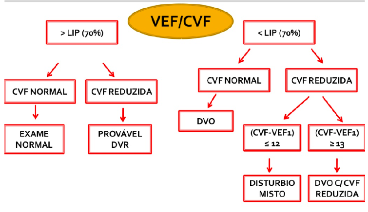 Resumo by oRlAnDoLuIgI_mEdRuNnEr #ELENÃO Pneumologia - Espirometria O resultado da espirometria virá em forma de dois gráficos: Curva Fluxo-Volume e curva Volume-Tempo. CVF = A capacidade vital forçada nos dá uma estimativa do volume pulmonar. Não é um dado fidedigno, pois não temos como mensurar o Volume Residual durante a espirometria. Relação VEF1/CVF (Índice de Tiffenau) = nos indica se há ou não obstrução do fluxo de ar. VEF1= nos diz se há atraso na liberação do ar durante a expiração. Ex: paciente com DPOC tem tempo de expiração prolongado pelo aprisionamento de ar, por isso no primeiro segundo eliminam um volume inferior ao normal. Prova broncodilatadora = nos ajuda a verificar a ocorrência ou não de hiper-reatividade brônquica. Quando considerar um teste como aceitável? Em geral >6s Pelo menos 10s na presença de obstrução e idealmente 15s; Término do exame: Platô no último segundo e desconforto acentuado ou risco de síncope; Os dois maiores valores de VEF1 e CVF não devem diferir maior que 0,15L Distúrbio Ventilatorio Restritivo (DVR): diferentemente da obstrução na qual a limitação ao fluxo é o problema primário, a restrição resulta em volumes pulmonares reduzidos. A perda de volume pulmonar pode ocorrer quando o parênquima é deslocado (tumores, derrames pleurais) ou removido (ressecção) ou alteração do próprio tecido pulmonar que ocorre em doenças que causam fibrose ou infiltram tecidos. Affecções que afetam a parede torácica ou os músculos respiratórios também comumente resultam em restrição. Distúrbio Ventilatório Obstrutivo (DVO): É qualquer processo que interfere com o fluxo aéreo para dentro ou para fora dos pulmões. Podem se estabelecer nas grandes ou pequenas vias aéreas. Grandes vias aéreas – estenose traqueal, tumores ou aspiração de corpo estranho. Pequenas vias aéreas – asma, enfisema, bronquite crônica e bronquiectasias. Olhar sempre o VEF1/CVF e identificar se é normal ou menor que o Limite Inferior Previsto; Depois sempre olhar o CVF para avaliar se está normal ou não. Observação: com o Indice de Tiffenau reduzido e CVF reduzida, você terá que subtrair o CVF – VEF1 que no caso seriam os números em porcentagem exposto no exame. Não esquecer que sempre temos que avaliar se o paciente teve ou não resposta ao broncodilatador em casos de DVO! Basicamente é ver se o paciente teve ou não resposta ao BD. Teve resposta? SIM. Avaliar se os índices normalizaram. Se não normalizou, pode ser ASMA ou DPOC. Se não teve resposta ao BD = DPOC. DVO ausente, o paciente tem resposta ao broncodilatador quando tem VEF1>=10% DVO presente, paciente tem resposta quando há uma variação absoluta de >=200mL e percentual >7%; Por último, não menos importante, dá para classificar as doenças pulmonares em Leve, Moderada e Grave. Para isso, usamos os valores da tabela abaixo: Conclusão: Sempre avaliar primeiro VEF/CVF Avaliar depois CVF e dar a Hipótese diagnostica; Em caso de DVO, avaliar se o paciente teve ou não resposta ao BD; Avaliar o distúrbio de acordo com os valores de índice de Tiffenau, CVF e VEF1; Nunca esquecer de correlacionar exame + clínica do paciente.