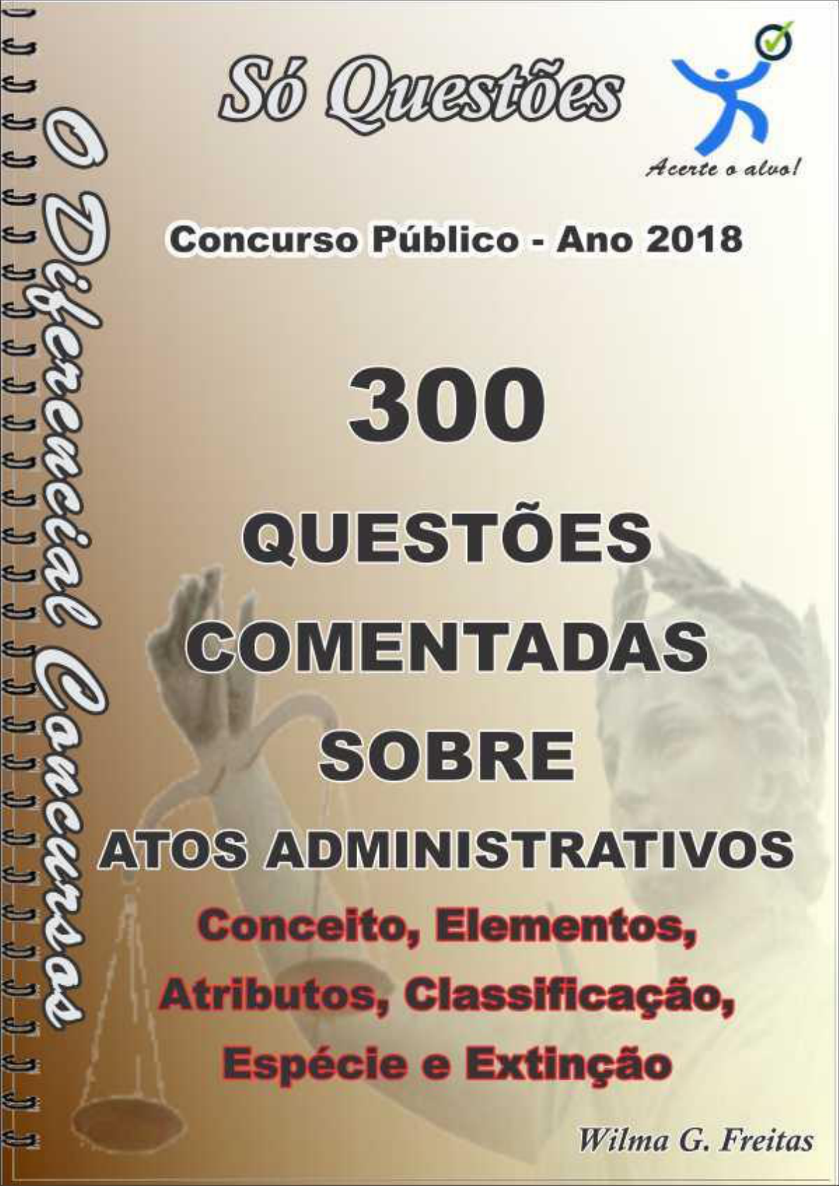 1 300 Questões comentadas Dos Atos Administrativos 300 Questões Comentadas dos Atos Administrativos 2 300 Questões comentadas Dos Atos Administrativos 300 Questões Comentadas dos Atos Administrativos APOSTILA AMOSTRA Acesse o site: Para adquirir a apostila de 300 Questões Comentadas Dos Atos administrativos acesse o site: www.odiferencialconcursos.com.br S U M Á R I O Apresentação...............................................................................3 Questões......................................................................................4 Respostas..................................................................................75 Bibliografia...............................................................................206 3 300 Questões comentadas Dos Atos Administrativos 300 Questões Comentadas dos Atos Administrativos APRESENTAÇÃO Esta obra é destinada aos estudantes de Direito Administrativo, especialmente para os que se preparam para a realização de concursos púbicos. Os atos administrativos é um tópico muito importante, complexo e bastante exigido pelas bancas organizadoras, demandando uma atenção especial por parte dos concurseiros. O presente material conta com 300 questões criteriosamente comentadas. Ele é sempre atualizado com novas questões, a fim de acompanhar várias formas de abordagem sobre o assunto. Nossos comentários são especialmente desenvolvidos para oferecer ao concurseiro conhecimento aprofundado sobre Atos Administrativos. Nunca é demais frisar que é a prática de exercícios que fixa o conhecimento e prepara o candidato para reconhecer as armadilhas preparadas pelas bancas organizadoras dos certames, pois muitas vezes conhecer determinado assunto não é suficiente para assimilar a forma como este conhecimento é cobrado nas provas. A quantidade de questões aliada à qualidade e ao compromisso de conduzi-lo ao sucesso representam nosso maior diferencial. Wilma G. Freitas 4 300 Questões comentadas Dos Atos Administrativos 300 Questões Comentadas dos Atos Administrativos QUESTÕES 1. Complete a lacuna. O ato administrativo sujeita-se ao regime jurídico ....................... ( ) administrativo ( ) da Administração 2. Assinale a alternativa correta, no que concerne ao ato administrativo. a) O ato administrativo é perfeito quando foi expedido em absoluta conformidade com as exigências do sistema normativo, mas não pode ser aplicado em virtude da ausência de motivação. b) De acordo com a teoria dos motivos determinantes, os motivos que determinam a vontade do agente ou os fatos que serviram de suporte à sua decisão integram a validade do ato. c) Decisão judicial, atingida pela eficácia da coisa julgada material, tem o condão de determinar a revogação do ato administrativo, observado o princípio da legalidade. d) A diferença entre os atos de aprovação e homologação está em que o segundo é composto de uma margem de discricionariedade, que não se outorga no primitivo. e) O ato administrativo é imperfeito, quando sujeito a condição suspensiva. 3. Complete a lacuna. 5 300 Questões comentadas Dos Atos Administrativos 300 Questões Comentadas dos Atos Administrativos A tipicidade ................. presente em todos os atos unilaterais. ( ) está ( ) não está 4. Sob o ponto de vista doutrinário e considerando o fim imediato a que se destinam e o objetivo que encerram; certidões, licenças, circulares e regulamentos são espécies de atos administrativos, classificados, respectivamente, como: a) ordinatórios, negociais, enunciativos e normativos. b) enunciativos, ordinatórios, normativos e ordinatórios. c) enunciativos, negociais, normativos e ordinatórios. d) enunciativos, negociais, ordinatórios e normativos. e) negociais, ordinatórios, normativos e negociais. 5. Marque V, se assertiva for verdadeira, ou F, se assertiva for falsa. É factível que a Administração Pública, por ato próprio, de natureza administrativa, opte por um regime jurídico não autorizado em lei. ( ) VERDADEIRA ( ) FALSA 6. As certidões, os atestados e os pareceres são espécies do ato administrativo: a) punitivo. 6 300 Questões comentadas Dos Atos Administrativos 300 Questões Comentadas dos Atos Administrativos b) complexo. c) normativo. d) ordinatório. e) enunciativo. 7. Marque V, se assertiva for verdadeira, ou F, se assertiva for falsa. Todo ato praticado no exercício da função administrativa é ato administrativo. ( ) VERDADEIRA ( ) FALSA 8. Analise a veracidade das frases. I. O revestimento exteriorizador do ato administrativo constitui requisito vinculado. II. A competência constitui requisito vinculado. III. O motivo ou causa é a situação de direito ou de fato que determina ou autoriza a realização do ato administrativo. IV. A finalidade constitui requisito vinculado. Quantas assertivas estão corretas? a) Nenhuma. b) Uma. c) Duas. d) Três. 7 300 Questões comentadas Dos Atos Administrativos 300 Questões Comentadas dos Atos Administrativos e) Quatro. 9. Marque V, se assertiva for verdadeira, ou F, se assertiva for falsa. A exoneração de um cargo em comissão prescinde de motivação. ( ) VERDADEIRA ( ) FALSA 10. Quanto à eficácia, o ato administrativo pode ser: a) válido e complexo. b) nulo e ordinatório. c) interno e externo. d) individual e geral. e) inexistente, válido e nulo. 11. A revogação do ato administrativo poderá ser realizada pela(o): a) Poder Judiciário. b) Poder Legislativo. c) própria autoridade que editou o ato ou seu superior. d) qualquer autoridade do Poder Judiciário. e) qualquer autoridade do Poder Executivo. 8 300 Questões comentadas Dos Atos Administrativos 300 Questões Comentadas dos Atos Administrativos 12. Complete a lacuna: A revogação do ato administrativo gera efeito .................... ( ) ex nunc. ( ) ex tunc. 13. É correta a decisão judicial que invalida ato administrativo discricionário, com o seguinte fundamento: a) evidente inoportunida