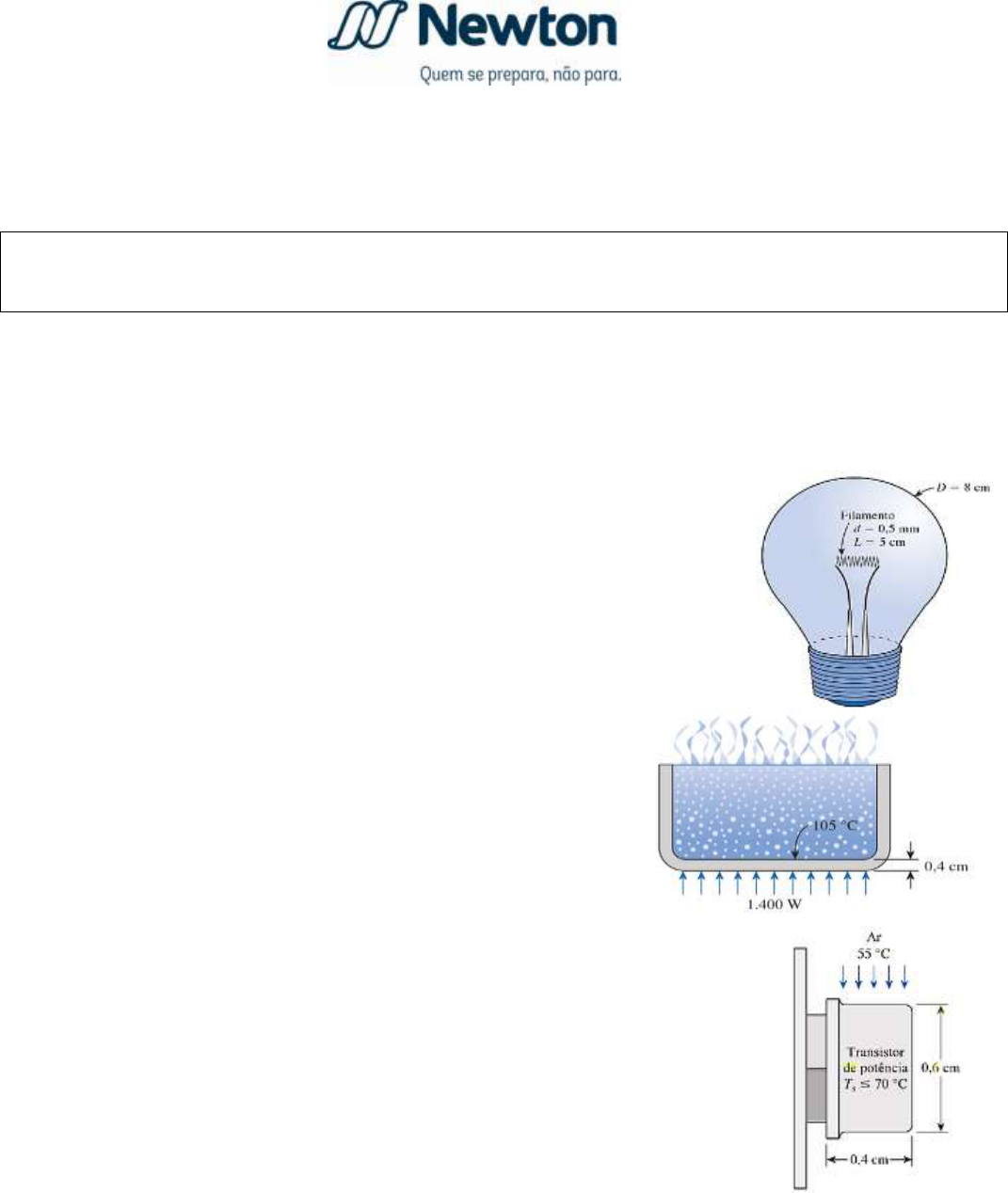 CENTRO UNIVERSITÁRIO NEWTON PAIVA Lista 1 CONSTANTES FÍSICAS UTILIZADAS NESTA LISTA DE EXERCÍCIOS Stefan-Boltzman: = 5,67 × 10-8 W/m2.K4. Calor específico da água (Estado Líquido): cp = 4180 J/kg.K 1 Uma bola de alumínio de 15 cm de diâmetro deve ser aquecida de 80 0C até a temperatura média de 200 0C. Tomando a densidade e o calor específico médios do alumínio nessa gama de temperaturas como sendo = 2700 kg/m3 e cp = 0,90 kJ/kg.K, respectivamente, determine a quantidade de energia que precisa ser transferida para a bola de alumínio. Resposta: 515,3 kJ 2 Considere uma lâmpada incandescente de 150 W. O filamento da lâmpada tem 5 cm de comprimento e tem um diâmetro de 0,5 mm. O diâmetro do bulbo de vidro da lâmpada é de 8 cm. Determine o fluxo de calor, em W/m2, a) na superfície do filamento, b) na superfície do vidro da lâmpada, e c)calcular quanto irá custar por ano para manter a luz acesa oito horas por dia, todos os dias, se o custo unitário da eletricidade é de US$ 0,08/kWh. Resposta: a) 1,91 . 106 W/m2; b) 7460 W/m2 c) 35,04 US$/ano 3 Uma panela de alumínio cuja condutividade térmica é 237 W/m°C tem um fundo chato com diâmetro de 15 cm e espessura de 0,4 cm. O calor é transferido permanentemente através de seu fundo a uma taxa de 1400 W para ferver a água. Se a superfície interna do fundo da panela está a 105°C, determinar a temperatura da superfície externa do fundo da panela. Resposta: T = 106,34 0C 4 Um transistor com altura de 0,4 em e 0,6 em de diâmetro é montado sobre uma placa de circuito, O transistor é resfriado com ar fluindo sobre ele com coeficiente médio de transferência de calor de 30 W /m2. K. Considerando que a temperatura do ar é de 55°C e o valor da temperatura da superfície do transistor não excede 70°C, determine a quantidade de energia que esse transistor pode dissipar de forma segura, desconsidere qualquer transferência de calor da base do transistor. Resposta: 0,047 W 5 Uma corrente elétrica de 5 A passa através de um resistor que tem tensão medida de 6 V. O resistor é cilíndrico, com 2,5 cm de diâmetro e 15 cm de comprimento, e tem temperatura uniforme de 90 oC, enquanto a temperatura do ambiente é 20 oC. assumindo que a troca de calor por radiação é desprezível, determine o coeficiente de troca de calor por convecção. Resposta: Resposta: 36,4 W/m2.K 6 Uma janela de vidro duplo de área 1,2 m x 1,2 m e espessura 6 mm, tem as suas faces interna e externa a 15°C e 9°C, respectivamente. Se há um espaçamento de 6 mm entre os vidros, preenchido com ar estagnante, determine a taxa de transferência de calor através da janela. São dados: Kvidro = 0,7 W/m.K KAr = 0,025 W/m.K. Resposta: 33,6 W 2 7 Considere uma pessoa em pé em uma sala a 18 oC. Determine a taxa total de transferência de calor dessa pessoa, considerando que a sua área de superfície exposta e a temperatura da pele são de 1,7 m2 e 32 °C, respectivamente, e o coeficiente de transferência de calor por convecção é de 5 W/m2.K. Considere a emissividade da pele e das roupas igual a 0,9, e assuma que a temperatura da superfície interior da sala é a mesma do ar. Resposta: 248 W 8 Uma bola esférica de 5 cm de diâmetro, cuja superfície é mantida a uma temperatura de 75 oC, está suspensa no meio de uma sala a 20 °C. Considerando que o coeficiente de transferência de calor por convecção é de 85 W/m2.K e a emissividade da superfície é de 0,8, determine a taxa total de transferência de calor da bola. Resposta: 41,9 W 9 O coeficiente de transferência de calor por convecção natural sobre uma chapa fina vertical aquecida, suspensa no ar em repouso, pode ser determinado através de observações da mudança da temperatura da chapa em função do tempo, enquanto ela se resfria. Supondo que a chapa seja isotérmica e que a troca por radiação com a vizinhança seja desprezível, determine o coeficiente de convecção da chapa para o ar no instante em que a temperatura da chapa é de 225 oC e a sua taxa de variação com o tempo (dT/dt) é de 0,022K/s. A temperatura do ar ambiente é de 25 oC, a chapa mede 0,3 x 0,3 m, possui massa de 3,75kg e um calor específico de 2,770 J/kgK. Resposta: h = 6,4 W/m2K 10 Um procedimento comum para medir a velocidade de correntes de ar envolve a inserção de um fio aquecido eletricamente (chamado de anemômetro de fio quente) no escoamento do ar, com o eixo do fio orientado perpendicularmente à direção do escoamento. Considera-se que a energia elétrica dissipada no fio seja transferida para o ar por convecção forçada. Consequentemente, para uma potência elétrica especificada, a temperatura do fio depende do coeficiente de convecção, o qual, por sua vez, depende da velocidade do ar. Considere um fio com comprimento L = 20mm e diâmetro D = 0,5mm, para o qual foi determinada uma calibração na forma V = 6,25 x 10-5×h2. A velocidade (V) e o coeficiente de convecção (h) têm unidades de (m/s) e (W/m2.k), respectivamente. Em uma aplicação envolvendo ar a uma temperatura T = 25 oC, a temperatura superficial do anemômetro é mantida Ts = 75 0C, com uma diferença de voltagem de 5 V e uma corrente elétrica de 0,1 A. Qual é a velocidade do ar? Resposta: 6,33 m/s 11 A parede de um forno utilizado para tratar peças plásticas possui uma espessura L = 0,05 m e a sua superfície externa está exposta ao ar e a uma grande vizinhança. O ar e a vizinhança encontram-se a 300K. Sendo a temperatura da superfície externa igual a 400K, e o seu coeficiente de transferência de calor por convecção e a sua emissividade iguais a h=20 W/(m2.K) e ε=0,8 respectivamente, qual é a temperatura da superfície interna, se a parede possuir uma condutividade térmica k= 0,7 W/(m.K)? Respostas: T = 600 K 12 Ovos com a massa de 0,15 kg por ovo e calor específico de 3,32 kJ/kg· oC são refrigerados a partir de 32 oC até 10 oC a uma taxa de 200 ovos por minuto. Qual é a taxa de remoção de calor a p