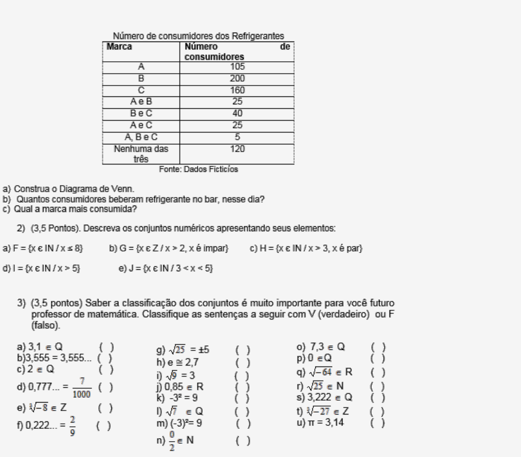 QUESTÃO: 1. (3,0 pontos) 1) As marcas de refrigerante mais consumidas em um bar, num certo dia, foram A, B e C. Os garçons constataram que o consumo se deu de acordo com a tabela a seguir: RESPOSTA ESPERADA: Gabarito
