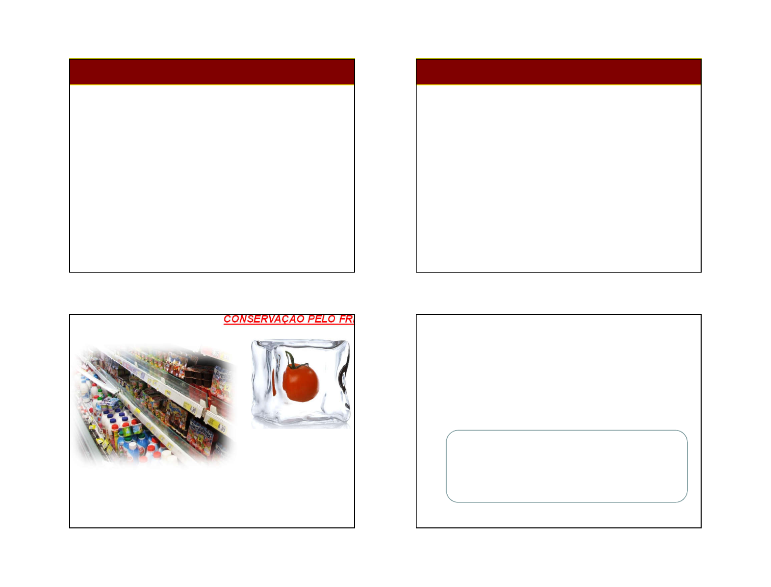 03/09/2018 1 Profª Larissa Lovatto Amorin Gama Métodos de conservação de alimentos Conservação de alimentos pelo emprego do frio CONSERVAÇÃO PELO FRIO Dias Atuais – Grande variedade de produtos são preservados pelo frio com resultados altamente satisfatórios. Aumentou muito a demanda por alimentos congelados, semi-prontos ou prontos para o consumo. Temperatura X Metabolismo O metabolismo de todo tecido vivo ocorre em função da temperatura ambiente. Cada ser vivo, incluindo os microrganismos, têm uma TEMPERATURA ÓTIMA para seu crescimento. psicrófilos - 10oC a 15 oC (Problemas para refrigeração) mesófilos - 25 a 40 oC termófilos - 45 a 65 o C 03/09/2018 2 • Redução da taxa de MO • Redução da taxa de MO Equipamentos Equipamentos Temperaturas (oC) Geladeiras domésticas 8 – 10oC (inferior) 0 - -2oC (superior) -1 - -4oC (congelador) Freezer -14oC - - 18oC Refrigeradores industriais, câmaras frias (ventilação forçada) -40oC 03/09/2018 3 Temperatura X Metabolismo Temperaturas elevadas (acima das temperaturas ótimas): impedem o desenvolvimento microbiano, Temperatura baixas :diminuem o metabolismo. Temperaturas próximas de 0ºC reduzem o ritmo da respiração e o crescimento dos microrganismo. Para cada redução em 10ºC na temperatura, estima-se que a velocidade das reações diminua pela metade ou mais. ↓ temperatura dos alimentos reduz satisfatoriamente a velocidade de crescimento dos mm, mas não interrompe as suas atividades metabólicas. Temperatura X Metabolismo TEMPERATURAS BAIXAS: Retardam ou inibem as reações químicas Retardam o crescimento de microrganismos Diminuem a velocidade da atividade microbiana Retardam ou inibem atividade enzimática Varia de acordo com o mm Temperatura X Metabolismo Congelamento: impede que a maior parte da água presente no alimento seja utilizada → formação de gelo A atividade enzimática CONTINUA ocorrendo, assim como a atividade dos microrganismos, porém, numa velocidade bastante reduzida. QUANTO MENOR A TEMPERATURA DE ARMAZENAMENTO, MENOR SERÁ A ATIVIDADE ENZIMÁTICA Microrganismos psicotrófilos Gênero Temperatura Cladosporium e Sportrichum Suportam até - 7ºC Penicilium e Monilia Suportam até - 4ºC Leveduras -2 ºC a - 4ºC Bactérias Pseudomonas, Achrobacter, Micrococcus -4 ºC a - 7ºC 03/09/2018 4 Temperatura X Metabolismo ASSOCIAÇÃO DE TRATAMENTOS Pasteurização/ refrigeração/ congelamento CADEIA DO FRIO baixas temperaturas desde a produção até o consumo, incluindo o transporte refrigerado Resfriamento Armazenamento refrigerado Congelamento Armazenamento congelado PRINCÍPIOS FUNDAMENTAIS NO EMPREGO DO FRIO: O alimento deve estar saudável, pois o frio não restitui a qualidade perdida. A aplicação do frio deve ser o mais rápido possível após a colheita ou preparo dos alimentos. Durante todo ao tempo, desde a obtenção da matéria prima, a conservação não pode ser interrompida. REFRIGERAÇÃO é empregada para conservação de alimentos a curto prazo, enquanto que o CONGELAMENTO para longo prazo. 03/09/2018 5 Refrigeração Considerado um dos métodos mais “suaves” de conservação Refrigeração Provoca relativamente poucos efeitos adversos sobre o sabor, textura e valor nutritivo dos alimentos Implica apenas na mudança do calor sensível do produto Os alimentos não estão livres do processo de deterioração. Prolonga vida útil dos alimentos por um período limitado: dias ou semanas. Período de conservação depende: características do produto temperatura de armazenamento Refrigeração Exemplo: O armazenamento adequado, sob refrigeração, de frutas e hortaliças é muito importante para a manutenção da qualidade. → Uma fruta armazenada 1(um) dia em temperatura de 28 – 35ºC pode significar 8 a 15 dias numa temperatura de 1 – 2ºC. Esta redução de temperatura pode provocar uma redução na atividade metabólica em até 9 vezes. Alimentos refrigerados: frescos e de boa qualidade. Vida útil de produtos de origem animal e vegetal Alimento Dias de vida útil Diferentes Temperaturas 0ºC 22ºC 38ºC Carne bovina 6-8 1 Menos que 1 Pescado 2-7 1 Menos que 1 Aves 5-18 1 Menos que 1 Carne/Peixe secos 1000 ou mais 350 ou mais 100 ou mais Frutas 2-180 1-20 1-7 Raízes 3-20 1-7 1-3 Tubérculos 90-300 7-50 2-30 03/09/2018 6 Pelo ar em câmaras ou túneis (mais comum) Direto no gelo Em água – aspersão ou imersão À vácuo – Hortaliça recipiente fechado – aspersão – vácuo – água evapora – resfriamento Métodos de resfriamento Velocidade de resfriamento Pela capacidade de refrigeração do sistema Velocidade de circulação do ar Capacidade de transferência de calor dos alimentos Embalagens Velocidade de resfriamento A REFRIGERAÇÃO pode ser empregada como método de conservação padrão para um determinado alimento ou temporária. A REFRIGERAÇÃO é essencial para alimentos classificados como perecíveis. Alguns alimentos não devem ser refrigerados, principalmente aqueles que continuam o amadurecimento pós-colheita. Ex: banana – altera padrões metabólicos Fatores que devem ser considerados na refrigeração TEMPERATURA Depende do tipo de alimento Cada alimento possui T de refrigeração ótima. Tecidos animais, leite e ovos: T mais baixas (-1°C a1°C) Vegetais: maior variação na T de refrigeração Manter T estável durante todo o armazenamento, transporte e comercialização. oA variação não deve ser superior a 1ºC 03/09/2018 7 Fatores que devem ser considerados na refrigeração UMIDADE RELATIVA Deve ser controlada É importante e varia com o tipo de alimento: Câmara com umidade – desidratação do alimento aumenta perda de umidade do produto durante armazenamento, causando perda de peso e de qualidade. Câmara com umidade – facilita desenvolvimento microbiano, principalmente fungos. Favorece rachaduras em algumas frutas Cada alimento tem uma UR ótima e esta não deve oscilar mais de 3 a 5%. •Maioria dos produtos UR = 80 a 9