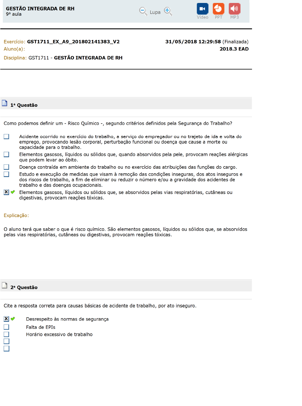 GESTÃO INTEGRADA DE RH 9a aula Lupa Vídeo PPT MP3 Exercício: GST1711_EX_A9_201802141383_V2 31/05/2018 12:29:58 (Finalizada) Aluno(a): 2018.3 EAD Disciplina: GST1711 - GESTÃO INTEGRADA DE RH 1a Questão Como podemos definir um - Risco Químico -, segundo critérios definidos pela Segurança do Trabalho? Acidente ocorrido no exercício do trabalho, a serviço do empregador ou no trajeto de ida e volta do emprego, provocando lesão corporal, perturbação funcional ou doença que cause a morte ou capacidade para o trabalho. Elementos gasosos, líquidos ou sólidos que, quando absorvidos pela pele, provocam reações alérgicas que podem levar ao óbito. Doença contraída em ambiente do trabalho ou no exercício das atribuições das funções do cargo. Estudo e execução de medidas que visam à remoção das condições inseguras, dos atos inseguros e dos riscos de trabalho, a fim de eliminar ou reduzir o número e/ou a gravidade dos acidentes de trabalho e das doenças ocupacionais. Elementos gasosos, líquidos ou sólidos que, se absorvidos pelas vias respiratórias, cutâneas ou digestivas, provocam reações tóxicas. Explicação: O aluno terá que saber o que é risco químico. São elementos gasosos, líquidos ou sólidos que, se absorvidos pelas vias respiratórias, cutâneas ou digestivas, provocam reações tóxicas. 2a Questão Cite a resposta correta para causas básicas de acidente de trabalho, por ato inseguro. Desrespeito às normas de segurança Falta de EPIs Horário excessivo de trabalho instalações inadequadas Ferramentas defeituosas Explicação: O ato inseguro refere-se ao comportamento inadequado do trabalhador que se posiciona contrário a utilização dos equipamentos de segurança que ditam as normas de segurança que devem ser seguidas. O não respeito às normas, coloca em risco a integridade física do trabalhador ou de terceiros, como a não utilização dos EPIs, distrações, imprudências e indisciplinas, para citar alguns. 3a Questão As causas de acidente de trabalho são diversas, algumas delas causadas pela empresa. Analise as situações abaixo e assinale a afirmativa correta em relação a causa considerada por condição insegura. O trabalhador tinha recebido os EPIs adequados, porém não os usou para sua atividade no trabalho, causando um acidente. O trabalhador foi chamado a atenção por seu chefe por não estar usando botas adequadas para sua atividade. O trabalhador não gosta de usar o uniforme que tem objetivo de protegê-lo da baixa temperatura ao entrar no frigorífico, pois acha que parece um "astronauta". O trabalhador chegou para operar a máquina, pediu as luvas ao Técnico de Segurança do Trabalho e este disse que havia acabado do estoque, para operar assim mesmo. O trabalhador pediu outra máscara e outro protetor auricular ao Técnico de Segurança do Trabalho, quando este deu o trabalhador pôs no bolso e não os usou. Explicação: A condição insegura ocorre quando a empresa não dá o que deveria, por exemplo os EPIs adequados, para o Colaborador trabalhar e se proteger. 4a Questão A Comissão Interna de Prevenção de Acidentes ¿ CIPA tem diversos objetivos. Abaixo estão listados vários, EXCETO UM que não faz parte dos objetivos. Qual é? Inspecionar as instalações da empresa Divulgar normas de prevenção de acidentes Recomendar medidas para eliminar, reduzir ou neutralizar os riscos Investigar as causas de acidentes Resolver todas as situações de riscos de acidentes Explicação: O aluno terá que saber quais são os objetivos da Comissão Interna de Prevenção de Acidentes (CIPA) para assinalar a alternativa que está errada. 5a Questão Estuda a interação homem-ambiente de trabalho. Procura adaptar o trabalho às condições psicofisiológicas dos trabalhadores, assegurando-lhes conforto, segurança e desempenho eficiente, e evitando o desgaste prematuro de suas potencialidades profissionais.Estuda os seguintes aspectos das condições de trabalho: Levantamento, transporte e descarga de materiais; mobiliário; equipamentos; condições ambientais do posto de trabalho; organização do trabalho. Estamos conceituando aqui: Ortopedia Saúde Ocupacional Condição insegura LER - Lesao por esforço repetitivo Ergonomia Explicação: A empresa que faz uso da Ergonomia alcança melhores resultados na sua produtividade, visto que ela leva em conta a interação do homem-ambiente de trabaho, porocurando adaptá-lo ao mesmo, evitando o desgaste físico e mental e assegurando conforto e segurança no trabalho dos Colaboradores. 6a Questão ATO INSEGURO Ééo comportamento do trabalhador contrário às normas de segurança, que coloca em risco a sua saúde ou a sua integridade física, ou as de terceiros. O próprio funcionário é quem causa o acidente de trabalho. Podemos considerar um Ato inseguro: máquinas mal protegidas e mal mantidas. horário excessivo de trabalho. desrespeito às normas de segurança. ferramentas defeituosas. instalações inadequadas (construção improvisada, ventilação e iluminação inadequada, falta de limpeza, sanitários deficientes). Explicação: Todas as demais alternativas são condições inseguras, pois são de responsabilidade da empresa e podem causar acidentes. 7a Questão A SIPAT é muito importante acontecer anualmente na empresa. É objetivo da SIPAT. Marque a alternativa correta. Promover, divulgar as questões relativas à segurança do trabalho, a fim de não conscientizar ainda mais o trabalhador. É todo dispositivo de uso individual destinado a proteger a saúde e a integridade física dos trabalhadores. Investigar as causas dos acidentes. Promover, divulgar as questões relativas à segurança do trabalho, a fim de conscientizar os trabalhadores. Permitir a troca e a divulgação de informações, entre os trabalhadores, sobre os riscos a que estão sujeitos no ambiente de trabalho. Explicação: A SIPAT - Semana de Prevenção de Acidentes do Trabalho é muito im