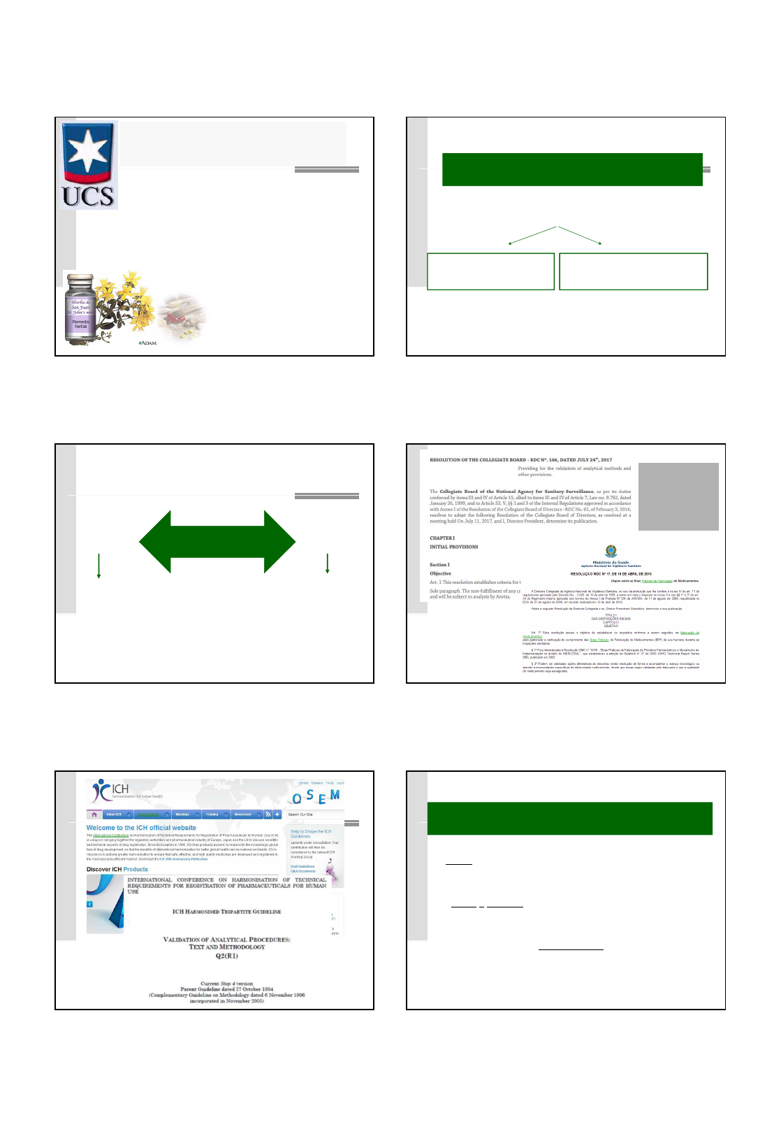 Aula 2 - Análise de qualidade de drogas vegetais - Profª. Melissa Schwanz 1 Análise da qualidade de drogas vegetais Aula 2 Profª. Melissa Schwanz UNIVERSIDADE DE CAXIAS DO SUL ÁREA DO CONHECIMENTO DE CIÊNCIAS DA VIDA CURSO DE FARMÁCIA QUALIDADE � conjunto de critérios que caracterizam a matéria- prima e o produto final para o uso ao qual se destinam. Qualidade do produto final depende: Estabelecimento de parâmetros de qualidade para a matéria-prima Planejamento adequado e controle de processo de produção do medicamento Controle de qualidade de plantas medicinais Farmacopeias Códigos oficiais (ICH, ANVISA) Parâmetros de qualidade e validação de processos Monografias ANVISA: • RDC 166, 2017 • RDC 17, 2010 • RDC 01, 2005 1. Plantio: as condições atuam sobre a biossíntese de metabólitos secundários ou princípios ativos de origem vegetal, levando à diferenças quali e quantitativas na composição das drogas. 2. Coleta e secagem: críticas para a estabilidade dos princípios ativos e uniformidade das drogas. Soluções: cultivo de espécies vegetais geneticamente manipuladas. 3. Armazenamento A produção de fitoterápicos depende de um grande número de fatores e abrange muito mais que o simples controle de qualidade laboratorial: Aula 2 - Análise de qualidade de drogas vegetais - Profª. Melissa Schwanz 2 O cultivo das plantas medicinais é uma alternativa tanto para preservá-las quanto para garantir um fornecimento com qualidade e na quantidade desejada. � AMOSTRAGEM Coleta de amostras levando- se em consideração 3 aspectos: o número de embalagens, o grau de divisão e a quantidade de droga disponível. � DESCRIÇÃO Descreve a droga em relação as partes utilizadas, percentuais mínimos de constituintes ativos ou marcadores. � CARACTERES ORGANOLÉPTICOS Fala do odor, descrevendo-o como aromático, frutoso, rançoso; e do sabor, adocicado, amargo, pungente, acre, persistente, dentre outros. Parâmetros de controle � DESCRIÇÃO MACROSCÓPICA Relaciona-se à descrição visual da droga íntegra, fala da cor, da textura e de caracteres morfo-anatômicos. � DESCRIÇÃO MICROSCÓPICA Referente à histologia vegetal, tecidos estruturas, inclusões celulares que caracterizam a droga vegetal. � ANÁLISE DO PÓ Quando a amostra já está pulverizada faz-se necessária essa análise que visa observar fragmentos de tecidos e estruturas normalmente típicos da droga vegetal. � IDENTIFICAÇÃO Envolve a cromatografia em camada delgada, em alguns casos reações cromáticas e de precipitação características. � ENSAIOS Compreendem os teores de matéria estranha, umidade e cinzas, dentre outros. � TESTES ESPECÍFICOS Normalmente relacionados à quantificação de uma característica conferida por um grupo farmacognóstico específico como as mucilagens e as saponinas. � DOSEAMENTO Visa a quantificação de princípios ativos e/ou marcadores químicos, utilizando-se técnicas como: titulometria, CG, CLAE e espectrofotometria. � CONTROLE MICROBIOLÓGICO Objetiva determinar a carga fúngica e bacteriana presente na droga vegetal. Aula 2 - Análise de qualidade de drogas vegetais - Profª. Melissa Schwanz 3 � MATÉRIA-PRIMA VEGETAL � Planta medicinal fresca; � Droga vegetal; � Derivados de droga vegetal – extrativos vegetais. 1. AMOSTRAGEM Garante a representatividade da tomada de ensaio em relação ao material como um todo. 1. Inspeção das condições de embalagem e dos rótulos 2. Dimensionamento da amostra: número de embalagens, grau de divisão da matéria-prima e a quantidade total de droga Número total de embalagens Número de embalagens a serem amostradas 1 a 10 1 a 3 10 a 25 3 a 5 25 a 50 4 a 6 50 a 75 6 a 8 75 a 100 8 a 10 Mais de 100 5% do total (mínimo = 10) F.B. 5 edição (2010). n = 3 correspondendo a regiões superior, intermediária e inferior do recipiente. Grau de divisão da droga Quantidade disponível Quantidade de amostra <1cm Até 100 kg 250 g >100 kg* Amostrar e por quarteamento obter 250 g >1 cm Até 100 kg 500 g >100 kg* Amostrar e por quarteamento obter 500 g X X * Quarteamento X X Amostra 2. ANÁLISE SENSORIAL OU ORGANOLÉPTICA Análise do aspecto visual da amostra: coloração, consistência, sabor ou odor, por meio de comparação com amostras autênticas. A análise organoléptica ainda permite verificar contaminação por fungos ou odor de material em decomposição. Ex: folhas de hortelã (Mentha sp.) com fraco aroma de mentol flores de macela (Achyrocline satureoides) de coloração marrom-avermelhada. Aula 2 - Análise de qualidade de drogas vegetais - Profª. Melissa Schwanz 4 3. ANÁLISES DE AUTENTICIDADE Caracteres macroscópicos: Ensaios a olho nu ou com auxílio de lupa. Sempre utilizar bibliografias especializadas e ajuda de botânicos. Peumus boldus L. Caracteres microscópicos: Realizada com auxílio de microscópio e preparação de lâminas por cortes histológicos nas drogas e plantas. Constatação da existência de determinados tipos celulares e na sequência de tecidos encontrados em um determinado órgão. Peumus boldus L. Aula 2 - Análise de qualidade de drogas vegetais - Profª. Melissa Schwanz 5 Peumus boldus L. Aula 2 - Análise de qualidade de drogas vegetais - Profª. Melissa Schwanz 6 4. TESTES a) Determinação do conteúdo de materiais estranhos: � Partes do organismo ou organismos dos quais a droga deriva, excetuados aqueles incluídos na definição e descrição da droga. � Quaisquer organismos, porções ou produtos de organismos além daqueles especificados na definição e descrição da droga. Ex. partes de outros vegetais, insetos. � Impurezas de natureza mineral não inerentes à droga, como pedras, areia ou terra. b) Determinação de umidade e substâncias voláteis: O excesso de umidade em matérias-primas vegetais permite a ação de enzimas, podendo acarretar a degradação de constituintes químicos, além de possibilitar o desenvolvimento de fungos e