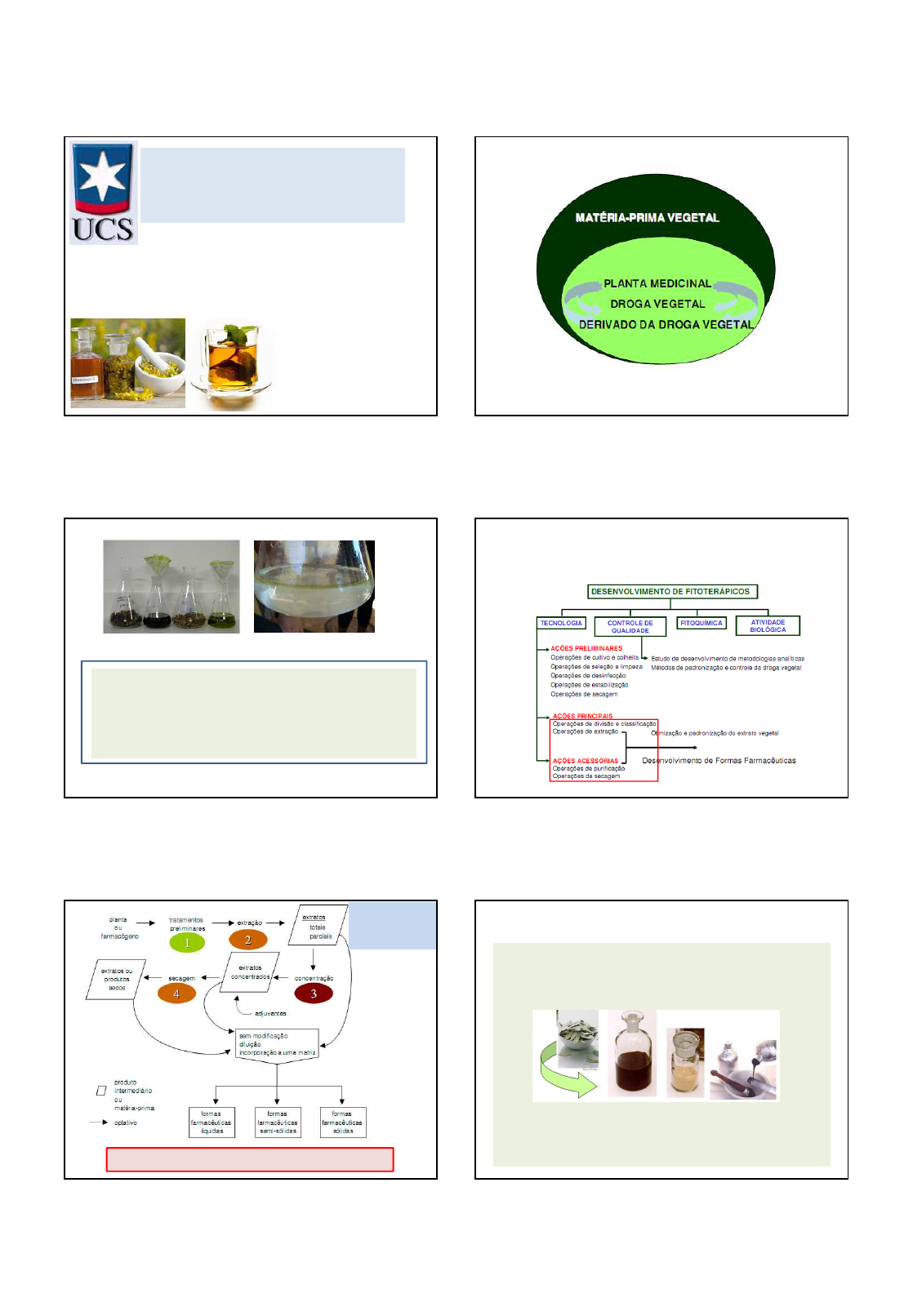 19/03/2018 Aula 3 - Obtenção e CQ de derivados vegetais Profª. Melissa Schwanz 1 Derivados vegetais: métodos de obtenção e controle Aula 3 Profª. Melissa Schwanz UNIVERSIDADE DE CAXIAS DO SUL ÁREA DE CONHECIMENTO DE CIÊNCIAS DA VIDA CURSO DE FARMÁCIA FARMACOGNOSIA II derivado vegetal: produto da extração da planta medicinal fresca ou da droga vegetal, que contenha as substâncias responsáveis pela ação terapêutica, podendo ocorrer na forma de extrato, óleo fixo e volátil, cera, exsudato e outros; 1. DESENVOLVIMENTO DE FITOTERÁPICOS CICLOS TECNOLÓGICOS Constância da segurança e eficácia do medicamento. • EXTRATOS: • São preparações de consistência líquida, sólida ou intermediária, obtidas a partir do material vegetal. Farm. Bras. 2010 • Obtidos por: percolação, maceração ou outro método adequado e validado. • Solventes: etanol, água ou outro solvente adequado. 2. PROCESSOS EXTRATIVOS 19/03/2018 Aula 3 - Obtenção e CQ de derivados vegetais Profª. Melissa Schwanz 2 • EXTRATOS MOLES: • São preparações de consistência pastosa obtidas por evaporação parcial do solvente. Apresentam no mínimo 70% de resíduo seco (p/p). Podem ser adicionados de conservantes. • Solventes: etanol e água. Farm. Bras. 2010 • EXTRATOS SECOS: • São preparações sólidas obtidas por evaporação do solvente. Apresentam no mínimo 95% de resíduo seco (p/p). Podem ser adicionados de materiais inertes adequados. • Solventes: etanol e água. Farm. Bras. 2010 3. MÉTODOS DE EXTRAÇÃO • COM SOLVENTES: • Destilação • Maceração: estática / dinâmica • Percolação ou lixiviação: simples / fracionada / em carrossel / contracorrente • Infusão • Decocção • Digestão • Extração por soxhlet • Extração sob refluxo • Turboextração • SEM SOLVENTES: • Espressão • Exsudatos • Operações de extração parcial (sem esgotamento) – infusão, decocção e a turboextração; • Operações de extração exaustiva (esgotamento da material vegetal) métodos de percolação, extração em contra-corrente, extração em carrossel e a extração com gases supercríticos. • MACERAÇÃO: • A velocidade de obtenção do equilíbrio depende da granulometria, grau de intumescimento das células e das propriedades do solvente, tais como sua viscosidade e polaridade. • MACERAÇÃO: • Vantagem: extração, sem degradação, de substâncias ativas termolábeis. • Desvantagens: baixa permeabilidade do solvente à droga, pouca solubilidade dos ativos a frio, saturação do solvente e lentidão do processo. • Obs.: Para a obtenção de ativo fotossensível – extração ao abrigo da luz. 19/03/2018 Aula 3 - Obtenção e CQ de derivados vegetais Profª. Melissa Schwanz 3 • DIGESTOS - São obtidos pela atuação de um solvente sobre uma droga, durante tempo variável, à temperatura de 35-40ºC. • INFUSOS – São aplicáveis para estruturas brandas constituídas de tecidos moles. Também deverão ser contundidas, cortadas ou grosseiramente pulverizadas. • DIGESTÃO e INFUSÃO: • DECOCTOS - São obtidas fazendo a água atuar à ebulição, durante certo tempo, sobre uma droga dividida grosseiramente, de acordo com a sua textura. • Costuma ser usado para drogas muito compactas e de natureza lenhosa, cujos princípios sejam solúveis unicamente a quente e capazes de suportarem sem alterações, as condições de temperatura. + • DECOCÇÃO: • Vantagens: o aquecimento torna o processo de extração mais rápido e mais eficiente, uma vez que aumenta a solubilidade de alguns ativos. • Desvantagens: perda de ativos voláteis e termolábeis. • PERCOLAÇÃO: • 1° - Pulverização da droga: o grau de tenuidade é variável, e drogas finamente divididas tendem a retardar a velocidade de escoamento do solvente. •2° - Umedecimento: consiste na reidratação do protoplasto da célula vegetal e normalmente é realizado fora do percolador. O solvente mais usado é o álcool (misturas hidroalcoólicas). •3° – Acondicionamento da droga umedecida no percolador: esta é a fase mais delicada do processo de percolação, pois o correto acondicionamento da droga permitirá uma descida vagarosa e regular do solvente ao longo da droga umedecida. Sobre a droga acondicionada, coloca-se um disco perfurado de porcelana, que fará um ligeira pressão sobre a droga, auxiliando a descida do líquido extrator (aumento da pressão hidroestática). •4° - Maceração da droga: é realizada até que se atinja um equilíbrio entre os líquidos extra e intracelular. O tempo de maceração é variável (24-48 hs). •5° - Deslocamento do solvente: o ritmo de deslocamento condicionará a eficiência da percolação, sendo recomendado que a cada 24 hs recolha-se um volume de percolado equivalente a 1 vez e meia o peso da droga introduzida no percolador. A velocidade de escoamento pode ser variada em função da monografia oficial utilizada. Considera-se encerrada a percolação quando o percolado estiver praticamente incolor, sem cheiro e sem sabor da droga. 19/03/2018 Aula 3 - Obtenção e CQ de derivados vegetais Profª. Melissa Schwanz 4 •Vantagens: não ocorre a saturação do solvente, o que torna a extração mais eficiente. •Desvantagens: sofre influência da permeabilidade do solvente na droga vegetal, solubilidade a frio dos ativos e gasto de grandes volumes de solvente. • TURBOEXTRAÇÃO: • Baseia-se na extração com simultânea redução do tamanho de partícula, resultado da aplicação de elevadas forças de cisalhamento, geradas no pequeno espaço compreendido entre o extrator e um rotor de alta velocidade (5.000 a 20.000 rpm). • Vantagens: • Simplicidade • Rapidez • Versatilidade da técnica para pequena e média escala • Desvantagens: • Difícil separação da solução extrativa por filtração • Geração de calor • Limitação para caules raízes ou materiais de elevada dureza • EXTRAÇÃO SOB