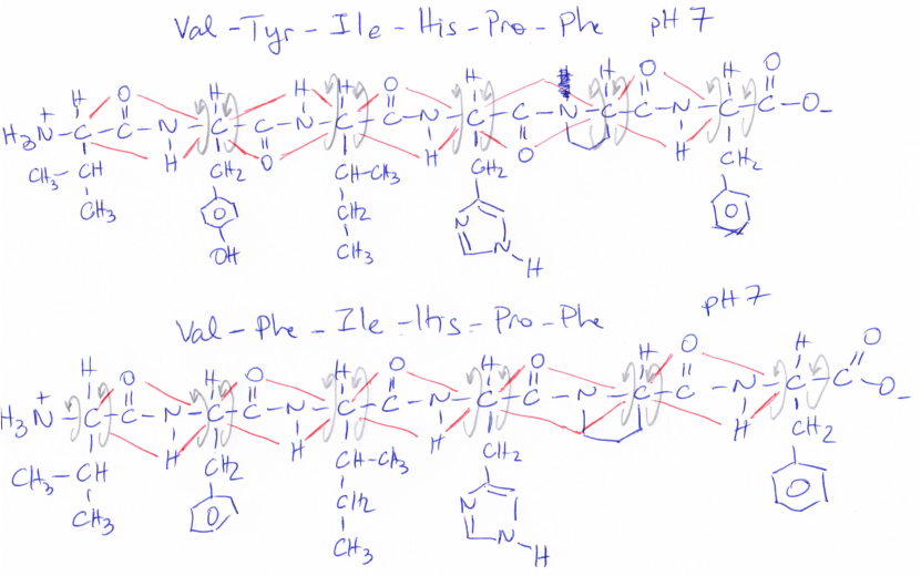 1 QBQ1252 - Bioquímica Metabólica Prova 1 14/10/2016 1) A Angiotensina IV é um hexapeptídeo Val-Tyr-Ile-His-Pro-Phe que por muito tempo foi considerado biologicamente inativo. Depois descobriu-se que a Angiotensina IV tem uma ação inibitória sobre a enzima renina, que age sobre o substrato do sistema renina-angiotensina o qual é responsável pelo controle da pressão arterial. A síntese da Angiotensina IV gera um produto com 86% de pureza, e um subproduto contaminante que possui um resíduo de Phe no lugar da Tyr: Val- Phe -Ile-His-Pro-Phe. a) Desenhe a estrutura primária dos dois peptídeos (a Ang IV e o contaminante) com as cargas adequadas em pH 7. Identifique os átomos que formam o plano da ligação peptídica de cada aminoácido e indique os ângulos diedrais que orientam estes planos um em relação ao outro. b) Qual peptídeo (Ang IV ou subproduto) você espera que seja mais solúvel em água e por quê? A Ang IV, Val-Tyr-Ile-His-Pro-Phe, deve ser um ligeiramente mais solúvel em água do que o subproduto (Val-Phe-Ile-His-Pro-Phe) devido à troca de uma cadeia lateral polar e com um grupo OH capaz de fazer ligações de hidrogênio com a água (a tirosina) por outro hidrofóbico, volumoso e incapaz de fazer ligações de hidrogênio com a água (fenilalanina) 2) Estudos de ressonância magnética nuclear (RMN) mostraram que um peptídeo de poli-Lisina não possui estrutura definida em pH 7 mas assume uma conformação de alfa-hélice quando o pH é aumentado para 10. a) O que pode explicar a dependência da conformação da poli-lisina com o pH? 2 A ionização do grupo amina presente na cadeia lateral da lisina explica a dependência da conformação da poli-lisina com o pH. Em pH abaixo do pKa, estes grupos estão protonados e a repulsão entre as cargas positivas desestabiliza a hélice. Em pH acima do pKa, os grupos estão desprotonados, consequentemente a hélice torna-se mais estável. Lembre-se que o pKa da lisina em um policátion é provavelmente menor que o pKa da lisina isolada em água (~10.8) b) Qual será a dependência da conformação do poli-glutamato com o pH? Explique. Será análoga à dependência observada para a poli-lisina, mas o comportamento é invertido. O poli-glutamato forma uma alfa-hélice em pHs abaixo do pKa. Nesta situação os grupos de ácido carboxílico da cadeia lateral do glutamato estão protonados e consequentemente sem carga. A alfa-hélice será desestabilizada em pHs acima do pKa quando estes grupos estiverem ionizados, consequentemente com carga negativa. A repulsão eletrostática entre as cadeias laterais desestabiliza a hélice. c) Descreva um alfa-hélice Estrutura secundária regular, conformação helicoidal, gira para a direita. As cadeias laterais encontram-se voltadas para fora da hélice, enquanto que os grupos polares do esqueleto polipeptídico encontra-se dentro da hélice. Esta conformação é estabilizada por ligações de hidrogênio entre a CO da cadeia principal do aminoácido “i” e o grupo HN da cadeia principal do aminoácido “i+4”, sendo que a direção das ligações de hidrogênio é aproximadamente paralela ao eixo longo da hélice. Os ângulos diedrais φ e ϕ são aproximadamente -57o e -47o, respectivamente. São necessários aproximadamente 3,6 aminoácidos para completar uma volta, equivalente a uma distância de 5,4 Å ao longo do eixo da hélice 3) A ilustração abaixo mostra várias curvas de dissociação do oxigênio. Suponha que a curva 3 corresponda à hemoglobina com concentrações fisiológicas de CO2 e 2,3- BPG em pH 7. Que curvas representam cada uma das seguintes perturbações? 3 a) Aumento de 2,3-bifosfoglicerato (2,3 BPG) – curva 4, pois o aumento da concentração de 2,3-BPG, um efetor alostérico da hemoglobina, diminui a afinidade pelo oxigênio b) Aumento do pH – curva 2 pois o aumento do pH leva ao aumento da afinidade (efeito Bohr). Este é um mecanismo adaptativo. Em tecidos com alta atividade metabólica, o metabolismo de carboidratos acelerado leva à diminuição do pH e consequentemente à maior liberação de oxigênio pela hemoglobina. O efeito reverso é observado com aumento do pH. c) Perda da estrutura quaternária – curva 1 pois a cooperatividade da hemoglobina depende da interação entre as quatro subunidades (α2β2) 4) a) As velocidades de uma determinada reação enzimática foram determinadas com três diferentes concentrações de enzima. Os gráficos de duplo-recíproco determinados são mostrados abaixo. Qual conjunto de três curvas seria obtido? Explique porque. O único fator que variou entre os três experimentos foi a quantidade total de enzima. Por isso, o conjunto obtido seria o conjunto do meio, pois é o único que indica aumento de Vmax enquanto o KM permanece constante b) Uma dada via metabólica utiliza quatro reações enzimáticas para converter a molécula A em D. As enzimas EA, EB e EC possuem os valores de KM indicados na figura abaixo. Se todos os substratos e produtos estão presentes na mesma concentração (10-4 M), e as quatro enzimas possuem aproximadamente o mesmo Vmax, qual será a etapa determinante do fluxo de metabolitos através da via? Por quê? As enzimas EB e EC estão operando a uma velocidade igual à metade da velocidade máxima, pois a concentração de substrato é igual ao KM. No caso da enzima EA, a concentração de substrato é 100x menor do que o KM, o que indica que ela estaria trabalhando a uma velocidade aproximadamente 100x menor do que a Vmax. Dessa forma, a primeira etapa é a etapa lenta e determinante do fluxo de metabolitos através da via. c) Uma determinada enzima possui um grupo ionizável que deve necessariamente estar carregado negativamente para a ligação do substrato e para a catálise ocorrer. O pKa deste grupo ionizável é 6,0. Um experimento para medir a velocidade da reação catalisada pela enzima foi realizado, sendo que o substrato está carregado positivamente durante to