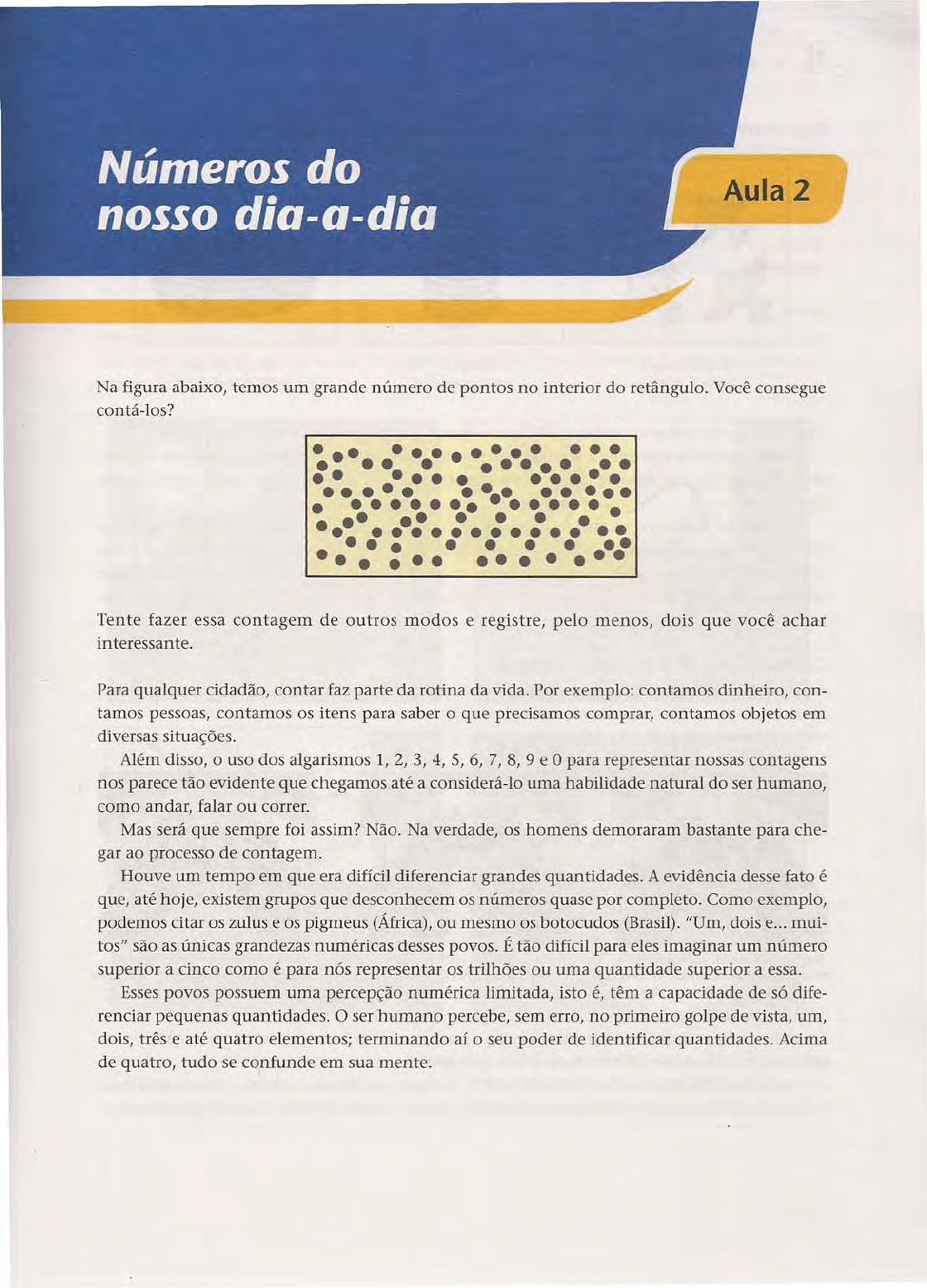 Aula 2 Na figura abaixo, temos um grande número de pontos no interior do retângulo. Você consegue contá-los? ••• • ••••••••••• ••• • ••••••••• •••• • •••••••• • •••••••• •••••••••••••••• •• • • • •••••••••••••••••••• •••••••• ••• • •••••• Tente fazer essa contagem de outros modos e registre, pelo menos, dois que você achar interessante. Para qualquer cidadão, contar faz parte da rotina da vida. Por exemplo: contamos dinheiro, con- tamos pessoas, contamos os itens para saber o que precisamos comprar, contamos objetos em diversas situações. Além disso, o uso dos algarismos 1, 2, 3, 4, S, 6, 7,8,9 e Opara representar nossas contagens nos parece tão evidente que chegamos até a considerá-lo uma habilidade natural do ser humano, como andar, falar ou correr. Mas será que sempre foi assim? Não. Na verdade, os homens demoraram bastante para che- gar ao processo de contagem. Houve um tempo em que era difícil diferenciar grandes quantidades. A evidência desse fato é que, até hoje, existem grupos que desconhecem os números quase por completo. Como exemplo, podemos citar os zulus e os pigmeus (África), ou mesmo os botocudos (Brasil). "Um, dois e ... mui- tos" são as únicas grandezas numéricas desses povos. É tão difícil para eles imaginar um número superior a cinco como é para nós representar os trilhões ou uma quantidade superior a essa. Esses povos possuem uma percepção numérica limitada, isto é, têm a capacidade de só dife- renciar pequenas quantidades. O ser humano percebe, sem erro, no primeiro golpe de vista, um, dois, três 'e até quatro elementos; terminando aí o seu poder de identificar quantidades. Acima de quatro, tudo se confunde em sua mente. Acesse: ☞ http://fuvestibular.com.br/ P/ as outras apostilas de Matemática, Acesse: http://fuvestibular.com.br/telecurso-2000/apostilas/ensino-fundamental/matematica/ 18 AULA2 Experimente. Olhando rapidamente para as figuras abaixo, responda: Há quatro ou seis pássaros voando? Há doze ou treze laranjas nesta cesta? Com exceção do primeiro exemplo, é preciso contar para responder às outras perguntas. Como o homem aprendeu.a contar? Felizmente, o ser humano foi capaz de ampliar sua per- cepção numérica por meio de um recurso: a contagem. Ela permitiu progredir no universo dos números. A invenção dos números está relacionada a situações práticas e úteis de contagem no nosso dia-a-dia. Como exemplos, temos os pastores, que, no fim do dia, quando recolhiam os reba- nhos, precisavam ter certeza de que todos os animais tinham entrado no curral; ou as tribos indígenas, que, ao término de uma guerra, precisavam saber se todos os guerreiros haviam vol- tado para a aldeia. Há quinze ou vinte pratos nesta pilha? Correspondência um a um: o começo Ao pegarmos um ônibus, com exceção do motorista e do cobrador, que ocupam lugares deter- minados, temos dois conjuntos: os assentos e os passageiros. Com uma olhadela rápida pode- mos encontrar três situações diferentes: Todos os passageiros estão sentados e existem lugares desocupados: há menos passageiros do que assentos. Todos os assentos estão ocupados e existem passageiros em pé: há mais passageiros do que assentos. Todos os assentos estão ocupados e não existem passageiros em pé: há tantos passageiros quanto assentos. Ao analisar essas situações, estamos fazendo a correspondência um a um, isto é, a cada passa- geiro relacionamos um assento, sem usar a contagem. Foi sem dúvida graças a esse princípio, isto é, à correspondência um a um, que durante mui- tos anos o ser humano pôde praticar a contagem, antes mesmo de saber o que é um número. Acesse: ☞ http://fuvestibular.com.br/ P/ as outras apostilas de Matemática, Acesse: http://fuvestibular.com.br/telecurso-2000/apostilas/ensino-fundamental/matematica/ MATEMÁTICA 19 A necessidade de registro Vamos ver o exemplo de um pastor que guarda seu rebanho de carneiros todas as noites numa caverna. São SS animais, porém o nosso pastor não sabe contar. Ele só sabe que há "muitos" car- neiros. Mas, à noite, sempre é preciso verificar se o rebanho todo foi recolhido . ..Um dia, ele tem uma idéia. Senta-se à entrada da caverna e faz entrar os animais, um a um. Com uma pedra afiada, faz um entalhe num osso cada vez que um carneiro passa à sua frente. Com a passagem do último animal, ele terá feito exatamente SS entalhes. Agora, sem dificuldade, pode verificar se o rebanho está ou não completo. Toda vez que voltar do pasto, fará os carneiros seguirem um por um, colocando o dedo em um talho de cada vez. Se sobrar algum talho, quando todos os animais tiverem passado, é por- que algum se perdeu; se não sobrar, tudo vai bem. Se nascer algum filhote, bastará fazer um talho a mais no pedaço de osso. Essa situação vivida pelos povos antigos mostra a necessidade que o ser humano tem de registrar, de algum modo, o total de objetos que conta. É claro que, em vez de fazer entalhes em um osso, o pastor poderia registrar sua contagem de outro modo, usando pedrinhas, por exemplo. Acesse: ☞ http://fuvestibular.com.br/ P/ as outras apostilas de Matemática, Acesse: http://fuvestibular.com.br/telecurso-2000/apostilas/ensino-fundamental/matematica/ 20 AULA 2 A organização da contagem É natural usarmos marcas para fazer uma contagem. As civilizações antigas, como a egípcia, a babilônia, a maia e a romana utilizavam traços verticais, círculos, pontos ou outros sinais para registrar as contagens. No início, os povos antigos registravam os nove primeiros números pela repetição de traços verticais, do seguinte modo: ( Mas esse modo foi logo abandonado, pois a repetição de traços verticais para os números maio- res que 4 não facilitava a leitura do reg