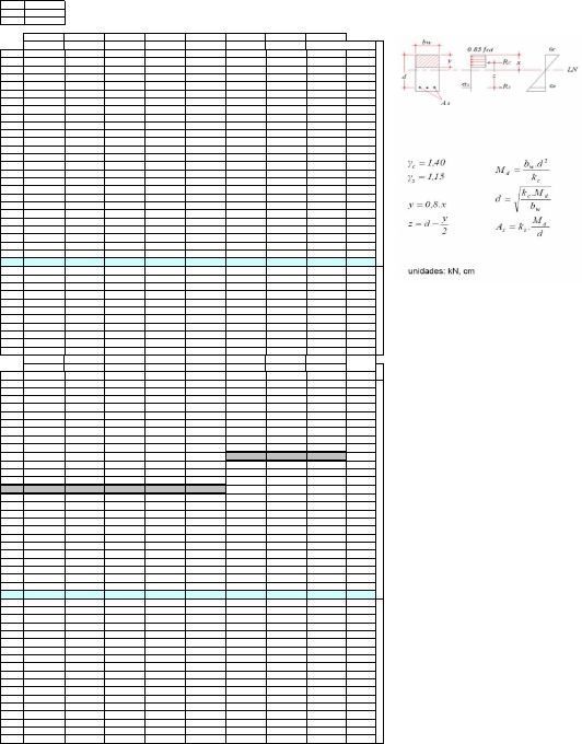 Prof. Carlos Henrique Tabela para o cálculo de seções com armadura simples gf 1,40 CA 50 gc 1,40 fyk (kN/cm²) 50,00 gs 1,15 0,00 fck (MPa) fck (MPa) fck (MPa) fck (MPa) fck (MPa) fck (MPa) fck (MPa) fck (MPa) 15,00 20,00 25,00 30,00 35,00 40,00 45,00 50,00 x/d kc kc kc kc kc kc kc kc ks 0,01 137,81 103,35 82,68 68,90 59,06 51,68 45,94 41,34 0,023 0,02 69,18 51,89 41,51 34,59 29,65 25,94 23,06 20,75 0,023 0,03 46,31 34,73 27,78 23,15 19,85 17,37 15,44 13,89 0,023 0,04 34,87 26,15 20,92 17,44 14,95 13,08 11,62 10,46 0,023 0,05 28,01 21,01 16,81 14,01 12,00 10,50 9,34 8,40 0,023 0,06 23,44 17,58 14,06 11,72 10,05 8,79 7,81 7,03 0,024 0,07 20,17 15,13 12,10 10,09 8,65 7,56 6,72 6,05 0,024 0,08 17,72 13,29 10,63 8,86 7,60 6,65 5,91 5,32 0,024 0,09 15,82 11,87 9,49 7,91 6,78 5,93 5,27 4,75 0,024 0,1 14,30 10,72 8,58 7,15 6,13 5,36 4,77 4,29 0,024 0,11 13,05 9,79 7,83 6,53 5,59 4,89 4,35 3,92 0,024 0,12 12,01 9,01 7,21 6,01 5,15 4,51 4,00 3,60 0,024 0,13 11,14 8,35 6,68 5,57 4,77 4,18 3,71 3,34 0,024 0,14 10,39 7,79 6,23 5,19 4,45 3,89 3,46 3,12 0,024 0,15 9,73 7,30 5,84 4,87 4,17 3,65 3,24 2,92 0,024 0,16 9,16 6,87 5,50 4,58 3,93 3,44 3,05 2,75 0,025 0,17 8,66 6,50 5,20 4,33 3,71 3,25 2,89 2,60 0,025 0,18 8,22 6,16 4,93 4,11 3,52 3,08 2,74 2,47 0,025 0,19 7,82 5,86 4,69 3,91 3,35 2,93 2,61 2,35 0,025 0,2 7,46 5,59 4,48 3,73 3,20 2,80 2,49 2,24 0,025 0,21 7,14 5,35 4,28 3,57 3,06 2,68 2,38 2,14 0,025 0,22 6,84 5,13 4,10 3,42 2,93 2,57 2,28 2,05 0,025 0,23 6,57 4,93 3,94 3,29 2,82 2,46 2,19 1,97 0,025 0,24 6,33 4,74 3,80 3,16 2,71 2,37 2,11 1,90 0,025 0,25 6,10 4,58 3,66 3,05 2,61 2,29 2,03 1,83 0,026 0,259 5,91 4,43 3,55 2,96 2,53 2,22 1,97 1,77 0,026 0,26 5,89 4,42 3,54 2,95 2,53 2,21 1,96 1,77 0,026 0,27 5,70 4,27 3,42 2,85 2,44 2,14 1,90 1,71 0,026 0,28 5,52 4,14 3,31 2,76 2,37 2,07 1,84 1,66 0,026 0,29 5,35 4,02 3,21 2,68 2,29 2,01 1,78 1,61 0,026 0,3 5,20 3,90 3,12 2,60 2,23 1,95 1,73 1,56 0,026 0,31 5,05 3,79 3,03 2,53 2,17 1,90 1,68 1,52 0,026 0,32 4,92 3,69 2,95 2,46 2,11 1,84 1,64 1,48 0,026 0,33 4,79 3,59 2,88 2,40 2,05 1,80 1,60 1,44 0,026 0,34 4,67 3,50 2,80 2,34 2,00 1,75 1,56 1,40 0,027 0,35 4,56 3,42 2,74 2,28 1,95 1,71 1,52 1,37 0,027 0,36 4,45 3,34 2,67 2,23 1,91 1,67 1,48 1,34 0,027 fck (MPa) fck (MPa) fck (MPa) fck (MPa) fck (MPa) fck (MPa) fck (MPa) fck (MPa) 15,00 20,00 25,00 30,00 35,00 40,00 45,00 50,00 x/d kc kc kc kc kc kc kc kc ks 0,37 4,35 3,27 2,61 2,18 1,87 1,63 1,45 1,31 0,027 0,38 4,26 3,19 2,56 2,13 1,83 1,60 1,42 1,28 0,027 0,39 4,17 3,13 2,50 2,08 1,79 1,56 1,39 1,25 0,027 0,4 4,08 3,06 2,45 2,04 1,75 1,53 1,36 1,23 0,027 0,41 4,00 3,00 2,40 2,00 1,72 1,50 1,33 1,20 0,028 0,42 3,93 2,95 2,36 1,96 1,68 1,47 1,31 1,18 0,028 0,43 3,86 2,89 2,31 1,93 1,65 1,45 1,29 1,16 0,028 0,44 3,79 2,84 2,27 1,89 1,62 1,42 1,26 1,14 0,028 0,45 3,72 2,79 2,23 1,86 1,59 1,39 1,24 1,12 0,028 0,46 3,66 2,74 2,19 1,83 1,57 1,37 1,22 1,10 0,028 0,47 3,60 2,70 2,16 1,80 1,54 1,35 1,20 1,08 0,028 0,48 3,54 2,65 2,12 1,77 1,52 1,33 1,18 1,06 0,028 0,49 3,48 2,61 2,09 1,74 1,49 1,31 1,16 1,05 0,029 0,5 3,43 2,57 2,06 1,72 1,47 1,29 1,14 1,03 0,029 0,51 3,38 2,54 2,03 1,69 1,45 1,27 1,13 1,01 0,029 0,52 3,33 2,50 2,00 1,67 1,43 1,25 1,11 1,00 0,029 0,53 3,29 2,46 1,97 1,64 1,41 1,23 1,10 0,99 0,029 0,54 3,24 2,43 1,95 1,62 1,39 1,22 1,08 0,97 0,029 0,55 3,20 2,40 1,92 1,60 1,37 1,20 1,07 0,96 0,029 0,56 3,16 2,37 1,90 1,58 1,35 1,18 1,05 0,95 0,030 0,57 3,12 2,34 1,87 1,56 1,34 1,17 1,04 0,94 0,030 0,58 3,08 2,31 1,85 1,54 1,32 1,16 1,03 0,92 0,030 0,59 3,04 2,28 1,83 1,52 1,30 1,14 1,01 0,91 0,030 0,6 3,01 2,26 1,81 1,50 1,29 1,13 1,00 0,90 0,030 0,61 2,98 2,23 1,79 1,49 1,28 1,12 0,99 0,89 0,030 0,62 2,94 2,21 1,77 1,47 1,26 1,10 0,98 0,88 0,031 0,628 2,92 2,19 1,75 1,46 1,25 1,09 0,97 0,88 0,031 0,63 2,91 2,18 1,75 1,46 1,25 1,09 0,97 0,87 0,031 0,64 2,88 2,16 1,73 1,44 1,24 1,08 0,96 0,86 0,031 0,65 2,85 2,14 1,71 1,43 1,22 1,07 0,95 0,86 0,031 0,66 2,83 2,12 1,70 1,41 1,21 1,06 0,94 0,85 0,031 0,67 2,80 2,10 1,68 1,40 1,20 1,05 0,93 0,84 0,031 0,68 2,77 2,08 1,66 1,39 1,19 1,04 0,92 0,83 0,032 0,69 2,75 2,06 1,65 1,37 1,18 1,03 0,92 0,82 0,032 0,7 2,72 2,04 1,63 1,36 1,17 1,02 0,91 0,82 0,032 0,71 2,70 2,02 1,62 1,35 1,16 1,01 0,90 0,81 0,032 0,72 2,68 2,01 1,61 1,34 1,15 1,00 0,89 0,80 0,032 0,73 2,66 1,99 1,59 1,33 1,14 1,00 0,89 0,80 0,032 0,74 2,63 1,98 1,58 1,32 1,13 0,99 0,88 0,79 0,033 0,75 2,61 1,96 1,57 1,31 1,12 0,98 0,87 0,78 0,033 0,76 2,59 1,95 1,56 1,30 1,11 0,97 0,86 0,78 0,033 0,77 2,58 1,93 1,55 1,29 1,10 0,97 0,86 0,77 0,033 0,78 2,56 1,92 1,53 1,28 1,10 0,96 0,85 0,77 0,033 0,79 2,54 1,91 1,52 1,27 1,09 0,95 0,85 0,76 0,034 0,8 2,52 1,89 1,51 1,26 1,08 0,95 0,84 0,76 0,034 D O M ÍN IO I II D O M ÍN IO I V D O M ÍN IO I I D O M ÍN IO I II