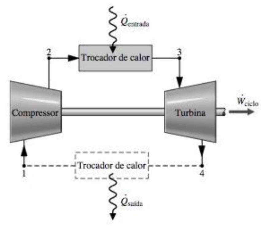 Ciclo Brayton de Ar Padrão Um diagrama esquemático do ar padrão com turbina a gás. As direções das principais transferências de calor são indicadas na figura por setas. De acordo com as considerações da análise do ar padrão, o aumento de temperatura que seria atingido no processo de combustão é alcançado por uma transferência de calor para o fluído de trabalho para uma fonte externa e o fluído de trabalho é o ar considerado como um gás ideal. Com as idealizações do ar padrão, o ar seria então direcionado ao compressor no estado 1, a partir da vizinhança, e depois retornaria à vizinhança, e depois retornaria a vizinhança no estado 4 com uma temperatura maior do que a temperatura ambiente. Após a interação com a vizinhança, cada unidade de massa de ar descarregado iria finalmente retornar ao mesmo estado do ar que entra no corredor, de forma que podemos pensar no ar que passa através dos componentes da turbina a gás como se ocorresse um ciclo termodinâmico. Uma representação simplificada dos estador percorridos pelo ar em tal ciclo pode ser imaginada considerando-se que o ar que sai da turbina retorna ao estado de entrada do ar compressor passando através de um trocador de calor onde ocorre a rejeição de calor para a vizinhança. O ciclo que resulta com essa nova idealização é chamado ciclo Brayton padrão. CALCULANDO AS TRANSFERÊNCIAS DE CALOR E TRABALHO PRINCIPAIS Considerando que a turbina opere adiabaticamente e desprezando os efeitos de energia cinética e potencial, o trabalho desenvolvido por unidade de massa é: �̇�𝑡 �̇� = ℎ3 − ℎ4 Onde: �̇� designa a vazão mássica. Com as mesmas hipóteses, o trabalho do compressor por unidade de massa é �̇�𝑐 �̇� = ℎ2 − ℎ1 O símbolo �̇�𝑐 representa a entrada de trabalho e assume um valor positivo. O calor adicionado ao ciclo por unidade de massa é �̇�𝑒𝑛𝑡𝑟𝑎𝑑𝑎 �̇� = ℎ3 − ℎ2 O calor rejeitado por unidade de massa é �̇�𝑠𝑎í𝑑𝑎 �̇� = ℎ4 − ℎ1 Onde �̇�𝑠𝑎í𝑑𝑎 tem valor positivo A eficiência térmica do ciclo é 𝜂 = ( �̇�𝑐 �̇� ) ( �̇�𝑒𝑛𝑡𝑟𝑎𝑑𝑎 �̇� ) = ℎ2 − ℎ1 ℎ3 − ℎ4 O trabalho reverso (bwr) para o ciclo é 𝑏𝑤𝑟 = ( �̇�𝑐 �̇� ) ( �̇�𝑡 �̇� ) = ℎ2 − ℎ1 ℎ3 − ℎ4 Para o mesmo aumento de pressão, um compressor de turbina a gás precisaria de uma entrada de trabalho por unidade de fluxo de massa muito maior do que uma bomba de uma instalação de potência a vapor, porque o volume específico médio do gás, escoando através do compressor, é muitas vezes maior do que o do líquido passando através da bomba. Logo, uma parte relativamente grande do trabalho desenvolvido pela turbina é necessária para acionar o compressor. Taxas típicas de trabalho reverso variam de 40% a 80%. Em comparação, as taxas de trabalho reverso de instalações de potência a vapor são normalmente 1 ou 2% apenas. Se as temperaturas nos estados numerador do ciclo forem conhecidas, as entalpias específicas necessárias para as equações anteriores são prontamente obtidas da tabela de gás ideal para o ar. De forma alternativa, com perda de alguma precisão, a variação dos calores específicos com a temperatura pode ser desprezada e os calores específicos podem ser considerados constantes. A análise de ar padrão é então denominada análise de ar frio padrão. CICLO BRAYTON IDEAL DE AR PADRÃO Desprezando as irreversibilidades à medida que o ar circula através de vários componentes de ciclo Brayton, não há quedas de pressão por atrito e o ar escoa a pressão constante através dos trocadores de calor, Se transferências de calor acidentais para a vizinhança também forem desprezadas, os processos através da turbina e do compressor serão isentrópicos. O ciclo ideal mostrado nos diagramas p-v e T-s está de acordo com essas idealizações. As áreas dos diagramas T-s e p-v podem ser interpretadas como calor e trabalho, respectivamente, por unidade de massa escoando. No diagrama T-s, a área 2-3-a-b-2 representa o calor adicionado por unidade de massa e a área 1-4-a-b-1 é o calor rejeitado por unidade de massa. No diagrama p-v, a área 1-2-a-b-1 representa o trabalho de entrada do compressor por unidade de massa e a área 3-4-b-a-3 é o trabalho de saída da turbina por unidade de massa. A área em cada figura pode ser interpretada como o trabalho líquido de saída ou, de forma equivalente, o calor líquido adicionado. Com os dados da tabela de ar utilizados para conduzir uma análise envolvendo o ciclo Brayton ideal, as relações a seguir, se aplicam aos processos isentrópicos 1-2 e 3-4. 𝑝𝑟2 = 𝑝𝑟1 𝑝2 𝑝1 𝑝𝑟4 = 𝑝𝑟3 𝑝4 𝑝3 = 𝑝𝑟3 𝑝1 𝑝2 Lembre-se de que pr é tabelado versus a temperatura. Uma vez que o ar escoa através dos trocadores de calor do ciclo ideal a pressão constante, resulta p4/p3 = p1/p2. Quando um ciclo Brayton ideal é analisado com base no ar frio padrão, os calores específicos são tomados como constantes. Logo: 𝑇2 = 𝑇1( 𝑃2 𝑃1 )(𝑘−1)/𝑘 𝑇4 = 𝑇3( 𝑃4 𝑃3 )(𝑘−1)/𝑘 = 𝑇3( 𝑃1 𝑃2 )(𝑘−1)/𝑘 Onde k é a razão dos calores específicos, k=cp/cv.