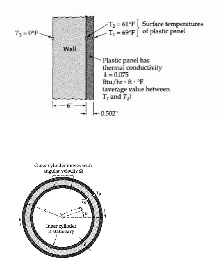 Lista 4 Capítulos 9 e 10 – Bird 1) O poder isolante de uma pared epode ser medido por meio de um arranjo como mostrado na figura. Coloca-se um painel plástico contra a parede. No painel montam- se dois termopares sobre as superfícies do painel. A condutividade térmica e a espessura do painel são conhecidas. Da medida das temperaturas no regime permanente mostrada na figura, calcule: a) O fluxo térmico permanente através da parede (e do painel) b) A resistência térmica (espessura da parede dividida pela condutividade térmica) OBS: Resolver no S.I.. k = 0,13 W/mK 2) Determine o perfil da temperatura para o problema de aquecimento viscoso, para as seguintes condições de contorno: em x=0, T=T0; em x=b, qx=0. (Feito em aula) 3) Reformule o problema da questão 2 (e também discutido na seção 10.4) para um polímero fundido, cuja viscosidade pode ser adequadamente descrita por um modelo de lei de potência. Mostre que a distribuição de temperatura é a mesma que ( 𝑇 − 𝑇0 𝑇𝑏 − 𝑇0 ) = 1 2 𝐵𝑟 𝑥 𝑏 (1 − 𝑥 𝑏 ) + 𝑥 𝑏 , mas com o número de Brinkman dado por, 𝐵𝑟𝑛 = [ 𝑚𝑣𝑏 𝑛+1 𝑏𝑛−1𝑘(𝑇𝑏 − 𝑇0) ] 4) Pastas e suspensões muito grossas podem se mover em canais como se fossem um pistão sólido. Podemos então aproximar a constante v0 em toda seção do escoamento. Reformule o problema da convecção forçada para escoamento empistonado em um tubo circular de raio R. Mostre que a distribuição de temperatura análoga à Θ(𝜀, 𝜁) = 4𝜁 + 𝜀2 − 1 4 𝜀4 − 7 24 é, Θ(𝜀, 𝜁) = 2𝜁 − 1 2 𝜀2 − 1 4 Em que 𝜁 = 𝑘𝑧 𝜌𝐶�̂�𝑣0𝑅2 e Θ e 𝜀 são definidos como, Θ = T−T1 𝑞0𝑅 𝑘 e 𝜀 = 𝑟 𝑅 5) Um fluido viscoso com propriedades físicas independentes da temperatura está em escoamento laminar plenamente desenvolvido entre duas superfícies planas separadas pela distância 2B. Para z<0, a temperatura do fluido é T=T1. Para z>0, calor é adicionado a um fluxo constante q0 em ambas as paredes. Determine a distribuição de temperatura T(x,z) para altos valores de z. a) Faça um balanço de energia para obter a equação diferencial T(x,z). Então descarte o termo de dissipação viscosa e o termo de condução axial. b) Reformule o problema em termos das quantidades adimensionais. Θ = T−T1 𝑞0𝐵/𝑘 , 𝜎 = 𝑥/𝐵 e 𝜁 = 𝑘𝑧/𝜌𝐶�̂�𝑣𝑧𝑚𝑎𝑥𝐵 2 c) Obtenha a solução assintótica para altos valores de z. 6) Um fio elétrico de 5 mm de diâmetro e 4,5 m de comprimento apresenta uma queda de voltagem de 0,6 volt. Determine a temperatura máxima no fio se o ar ambiente está a 25ºC e o coeficiente de transferência de calor h é 32 W/m²K. Compare as quedas de temperatura através do fio e do ar em torno do fio. 7) Uma parede de fornalha consiste em três camadas: (i) uma camada de tijolo refratário ou resistente ao calor, (ii) uma camada de tijolo isolante, e (iii) uma placa de aço com espessura de 63 cm para proteção mecânica. Calcule a espessura de cada camada de tijolo para a espessura total mínima se a perda de calor através da parede deve ser de 15700 W/m², supondo que as camadas têm contato térmico excelente. A seguinte informação está disponível: Temperatura máxima permitida Condutividade térmica (W/mK) Material ºC A 37,7ºC A 1093 ºC Tijolo refratário 1427 3,12 6,23 Tijolo isolante 1093 1,56 3,12 Aço - 45,17 Ti jo lo r e fr at ár io Ti jo lo is o la n te Placa de aço 37,7ºC 1371ºC
