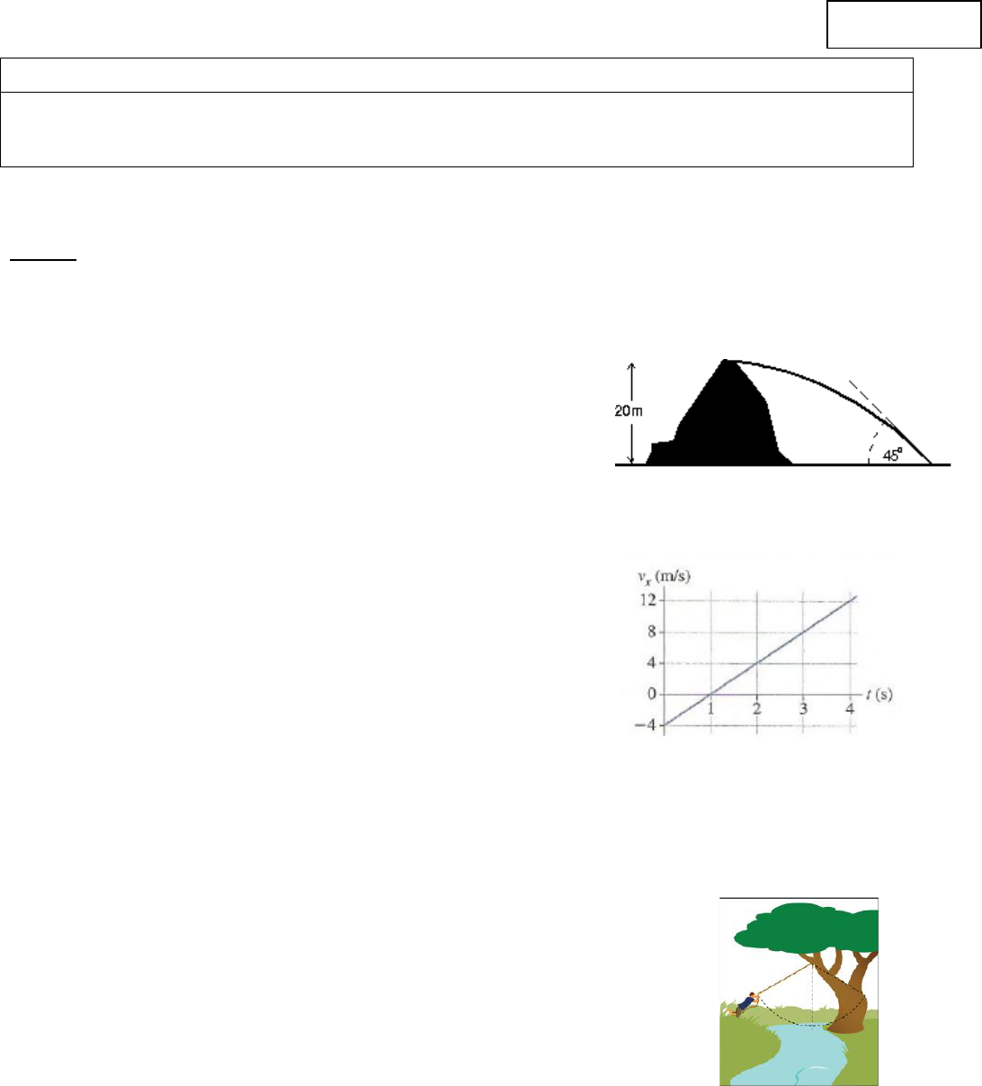 Física I – V.S. – 21/06/2014 NOME_____________________________________________________________________________________________ MATRÍCULA________________________TURMA______________PROF.___________________________________ A prova consta de 20 questões de múltipla escolha. Utilize: g = 9,80 m/s2; 1) Uma bola é lançada horizontalmente do topo de uma colina com 20 m de altura. A bola atinge o solo sob um ângulo de 450 com a horizontal. Com que velocidade foi lançada? A) 14 m/s B) 20 m/s C) 28 m/s D) 32 m/s E) 40 m/s 2) Uma partícula parte de xo = 10 m em to = 0 s e move-se no eixo x de acordo com o gráfico da velocidade. Qual das afirmações é correta? A) O vetor aceleração aponta sempre para X-positivo. B) Entre 0 e 4s, a partícula se move ao longo do eixo X positivo. C) A partícula se encontra em x = 0 no instante t = 1s. D) A aceleração entre 0 e 2 s é de 2 m/s2. 3) Uma brincadeira de criança que mora perto de um riacho é atravessá-lo usando uma corda amarrada a uma árvore perto da margem. Dependendo da resistência da corda, essa travessia pode não se concretizar. Para avaliar o perigo da travessia, pode-se usar como modelo o movimento do pêndulo, e calcular a tensão máxima que a corda pode suportar. Considerando que a corda faz, inicialmente, um ângulo de 600 com a vertical, qual é a tensão máxima a ser suportada pela corda para que uma criança de 30 kg atravesse o riacho? A) 5,9 x 102 N B) 2,9 x 102 N C) 2,0 x 102 N D) 8,8 x 102 N E) 1,2 x 102 N 4) Um elevador de 2,8 x 103 kg é puxado para cima por um cabo. Qual é a tração no cabo quando o elevador acelera para baixo a 1,2 m/s2? A) 31 x 103N B) 28 x 103N C) 24 x 103N D) 12 x 103N E) 51 x 103N 5) Uma caixa está em repouso sobre uma superfície horizontal cujos coeficientes de atrito estático e cinético são respectivamente 0,50 e 0,40. Uma força horizontal constante é aplicada com intensidade suficiente para iniciar o movimento e mantida durante o movimento. A aceleração da caixa é: Nota A) 8,9 m/s2 B) 4,5 m/s2 C) 3,3 m/s2 D) 0,98 m/s2 E) 0 6) A figura ilustra os movimentos de várias partículas em círculos horizontais sobre uma mesa sem atrito. Todas elas se movem com o mesmo módulo de velocidade. Ordenar em sequência decrescente os valores de Ta a Td das tensões nos barbantes. A) Ta > Tb = Tc > Td B) Tc >Ta = Td > Tb C) Td >Ta = Tc > Tb D) Ta = Td > Tb=Tc 7) Uma bola de beisebol de 0,140 kg é lançada com uma velocidade de 26,2 m/s e ao ser golpeada por um bastão exercendo uma força média de 5000 N, sua velocidade passa para 37,0 m/s em sentido oposto. Qual o tempo de contato do bastão com a bola? A) 3,02 x 10-4 s B) 1,26 x 10-2 s C) 1,77 x 10-3 s D) 4,25 x 10-3 s 8) É realizado um trabalho de 4,00 x 105 J sobre um carro de 1110 kg enquanto este acelera de 10,0 m/s até uma velocidade final. Qual é esta velocidade final? A) 31,5 m/s B) 22,9 m/s C) 25,7 m/s D) 28,6 m/s 9) Um bloco de 33,0 kg parte do repouso no topo de um plano inclinado de 31,00 em relação a horizontal. O bloco desliza sem atrito e colide com uma mola de constante elástica 3,4 kN/m fixada neste plano comprimindo-a de 37,0 cm. Qual a distância percorrida pelo bloco antes de colidir com a mola? A) 137 cm B) 82,6 cm C) 74 m D) 1,4 m E) 1,0 m 10) Todos estes blocos de 50 kg estão em repouso. A tensão na corda 2 é, em relação à corda 1, A) igual. B) metade. C) maior. D) nenhuma das anteriores, pois a tensão na corda 2 é nula. 11) Uma esfera maciça homogênea de massa 2,0 kg e raio 1,7 m desce rolando sem deslizar, a partir do repouso, sobre um plano inclinado. Qual a velocidade angular da esfera quando o seu centro de massa desceu uma altura de 7,0 m? Dado: ICM = 2mr 2 / 5 A) 11,0 rad/s B) 9,9 rad/s C) 7,0 rad/s D) 5,8 rad/s 12) Encontre o torque resultante sobre o corpo composto em relação ao eixo que passa por O, considerando a = 10,0 cm e b = 25,0 cm. A) 3,55 N m; anti-horário B) 7,10 N m; horário C) 3,55 N m; horário D) 2,10 N m; horário E) 7,10 N m; anti-horário 13) Uma bola rola sem escorregar pela rampa A abaixo, a partir do repouso. Simultaneamente e da mesma altura, uma caixa sai do repouso e desliza pela rampa B, idêntica a A, mas sem atrito. Qual corpo chega antes à base? Dado: ICM = 2mr 2 / 5 A) A bola. B) A caixa. C) Ambos chegam ao mesmo tempo. D) É impossível determinar. 14) Uma roda com momento de inércia 2,4 kgm2 gira a 40,0 rpm em torno de seu eixo sem atrito. Um artesão deixa cair sobre a roda uma pequena massa M sobre a roda, que adere a 1,2 m do eixo de rotação. Se a velocidade da roda com a massa M passou para 32 rpm, qual o valor de M? A) 0,42 kg B) 0,28 kg C) 0,37 kg D) 0,46 kg 15) Um carrossel gira livremente quando uma menina move-se rapidamente e radialmente da borda para o centro do carrossel. Qual a afirmativa correta? A) O momento de inércia do sistema aumenta e a velocidade angular diminui. B) O momento de inércia do sistema diminui e diminui a velocidade angular. C) O momento de inércia do sistema diminui e a velocidade angular continua igual. D) O momento de inércia do sistema e a velocidade angular aumentam. E) O momento de inércia do sistema diminui e aumenta a velocidade angular. 16) Um objeto descreve um movimento harmônico simples de amplitude igual a 5,3 m e frequência angular de 1,6 rad/s. Se no instante t = 0 s o objeto está em x = 5,3 m qual a sua posição no instante 3,5 s? A) 2,7 m B) 3,2 m C) 4,1 m D) 4,8 m 17) O gráfico mostra a aceleração de um objeto em função do tempo. Qual o período, a amplitude e a constante de fase do movimento de oscilação? A) 0,40 s; 6/(16 m; 3 rad. B) 0,25 s; 3/(16 m; 0 rad. C) 0,20 s; 3/(32 m; rad. D) 0,30 s; 6/(64 m; 3 rad. 18) Seja g a aceleração da gravidade na superfície da Terra. Em um planeta fictício cuja massa é o triplo da massa da Terra e cujo raio também é igual a três vezes o raio terrestre, o valor da aceleração da gravidade na superfície deste planeta será: A) 3g B) 2g C) g