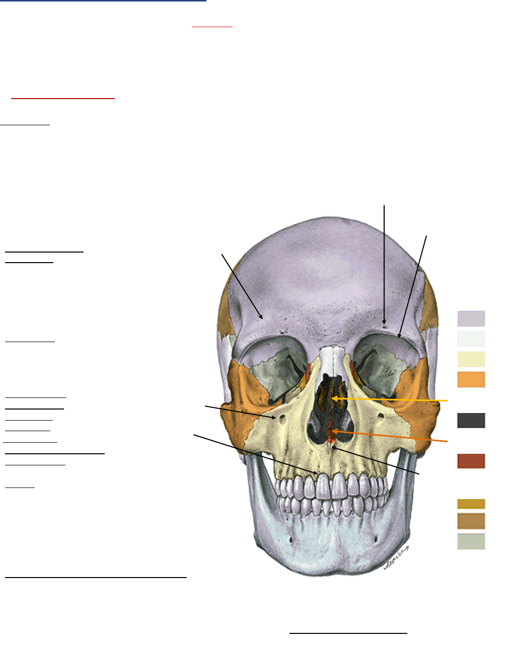UNIDADE 3 OSSOS DO ESQUELETO AXIAL ROTEIRO DE AULA PRÁTICA ATENÇÃO: Este roteiro é um auxílio para seu estudo em aulas práticas e teóricas. Ele de modo algum é uma lista de assuntos que possam ser cobrados em provas teóricas ou práticas. Desta forma, o aluno não deve limitar seu estudo a este roteiro ou aos assuntos nele tratados. É indispensável consulta à bibliografia recomendada e a freqüência às aulas. I-OSSOS DO CRÂNIO OBJETIVOS: - Definir quais são os ossos componentes; - Conceituar neurocrânio e viscerocrânio; - Localizar alguns pontos craniométricos: bregma, lambda, ptério, astério, glabela; - Identificar as fossas cranianas e seus conteúdos; - Identificar os principais acidentes anatômicos e suas respectivas funções; - Identificar os ossos formadores das órbitas; - Conhecer os ossículos auditivos e o osso hióide (pescoço); VISTA ANTERIOR - Identificar os Ossos - Osso frontal: - Margem supra-orbital; - Forame (ou incisura) supra-orbital; - Seio frontal; - Arco superciliar; - Glabela; - Sutura metópica (inconstante). - Osso maxilar (Maxilas): - Processo alveolar; - Forame infra orbital; - Espinha nasal anterior; - Seio maxilar. - Osso zigomático - Osso Mandíbula - Ossos nasais - Osso Vômer - Osso Etmoide - Conchas Nasais Inferiores - Ossos Lacrimais - Órbitas: visualizar em seu interior: -Partes orbitais do frontal, zigomático e maxilar; - Asa maior do esfenoide; -Osso lacrimal; etmoide; palatino. -Fissura orbital superior e inferior; - Canal óptico; - Canal nasolacrimal; - Identificar a abertura piriforme e seu conteúdo: - septo nasal (Etmoide e Vômer) - conchas nasais; - lâmina perpendicular do etmoide; Figura 1: Vista anterior do crânio (Original: Sobotta. Atlas de Anatomia Humana, Ed. Guanabara Koogan). VISTA LATERAL - Identificar os Ossos - Osso parietal: - Linha temporal superior e inferior - Sulcos arteriais (visão interna). - Osso esfenoide: - Asa maior. - Osso temporal: - Porção escamosa, mastoidea e timpânica; - Processo mastoide e estiloide; - Meato acústico externo; - Tubérculo articular; - Fossa mandibular. - Osso Occipital: - Protuberância Occipital Externa; - Osso Frontal; - Osso Nasal; - Osso Maxilar; - Osso Mandíbula; - Osso Zigomático; - Osso lacrimal; - Identificar o arco zigomático e sua composição. - Identificar a sutura escamosa; - Identificar a fossa temporal, infratemporal e pterigopalatina e a fissura pterigomaxilar. - Identificar o astério e o ptério; Figura 2: Vista lateral do crânio (Original: Sobotta. Atlas de Anatomia Humana, Ed. Guanabara Koogan). VISTA VERTICAL (CALOTA CRANIANA) - Identificar os Ossos: Frontal, Parietal e Occipital; - Forames parietais; - Bregma e lambda; - Suturas sagital, coronal e lambdoide; Figura 3 e 4 - Calvária de um neonato e de um adulto VISTA POSTERIOR - Identificar os ossos; - Osso occipital: - Protuberância occipital externa - Linhas nucais superior e inferior - Ossos Parietais; - Ossos Temporais; - Sutura lambdóide e sagital; Figura 5 - Vista Posterior VISTA INFERIOR DA BASE DO CRÂNIO - Definir quais os ossos identificados nesta posição: - Osso Vômer; - Ossos Maxilares, Palatinos e Zigomático; - Osso Esfenoide: - Asa maior; - Processo pterigoide do osso esfenoide (lâmina medial e lateral); - Fossa Pterigoidea; - Osso Temporal: - Fossa mandibular; - Processo mastoide e estiloide; - Canal carotídeo e forame jugular; - Forame estilo mastoide (n. facial) - Osso occipital: - Porção basilar; - Côndilos occipitais - Canal do Hipoglosso - Forame Magno - Visualizar as seguintes estruturas: - Palato ósseo: Maxilas e Palatinos - Processos alveolares; - Processo palatino da maxila; - Fossa e Forame incisivo. - Forame palatino maior; - Lâmina horizontal do osso palatino; - Espinha nasal posterior. - Coánas; Figura 6: Vista inferior da base do crânio (Original: Sobotta. Atlas de Anatomia Humana, Ed. Guanabara Koogan). VISTA SUPERIOR DA BASE DO CRÂNIO A- FOSSA CRANIANA ANTERIOR: - Osso frontal: - Seio frontal; - Osso etmoide: - Crista galli; - Lâmina e forames crivosos - Osso esfenoide: - Asa menor do esfenoide; - Processos clinóides anteriores. B- FOSSA CRANIANA MÉDIA: - Osso esfenóide: - Asa menor do esfenoide; - Asa maior do esfenoide; - Forames redondo, oval e espinhoso; - Canal óptico; - Fissura orbital superior; - Sela túrcica: - Tubérculo e dorso da sela; - Processos clinóides posteriores - Fossa hipofisária; - Osso temporal: - Porção escamosa e petrosa do osso temporal; - Canal carótico; - Forame lácero. C- FOSSA CRANIANA POSTERIOR: - Osso temporal: - Parte petrosa; - Meato acústico interno; - Forame jugular; - Osso occipital: - Porção basilar do osso occipital; - Forame magno; - Canal do hipoglosso. VISUALIZAR OS SEGUINTES ORIFÍCIOS (FORAMES OU CANAIS) - Forame oval; - Forame Redondo - Forame espinhoso; - Forame lácero; - Canal carótico; - Fossa e forame jugular; - Forame estilo mastoide; - Fossa e canal condilar; - Canal do hipoglosso; - Canal óptico; - Fossa Incisiva; - Canal nasolacrimal; - Forame magno CORTE SAGITAL - Sulcos dos vasos meníngeos; - Septo nasal: - Lâmina perpendicular do etmoide; - Vômer; - Cavidade nasal: - Concha nasal superior e média (etmoide); - Concha nasal inferior; - Osso esfenoide: - Seio esfenoidal; - Sela túrcica - Osso Maxilar: - Seio Maxilar ESTUDO DA MANDÍBULA - Ramo, ângulo e corpo da mandíbula; - Processos condilar e coronóide; - Incisura mandibular; - Processo alveolar; - Forame Mentoniano (ou Mentual); - Forame, Canal e Língula Mandibulares; - Tuberosidade massetérica; - Fossa Submandibular e sublingual; - Sulco e Linha milo-hióidea - Linha obliqua; FACE MEDIAL DO RAMO E DO CORPO EXERCÍCIOS DE FIXAÇÃO OSSOS DO CRÂNIO ATENÇÃO: O exercício de fixação é mais um instrumento de estudo, não substituindo os livros didáticos e nem a dedicação ao anatômico. Um acadêmico tem que se dedicar à leitura de artigos científicos e outros títulos relevantes. As questões relacionada