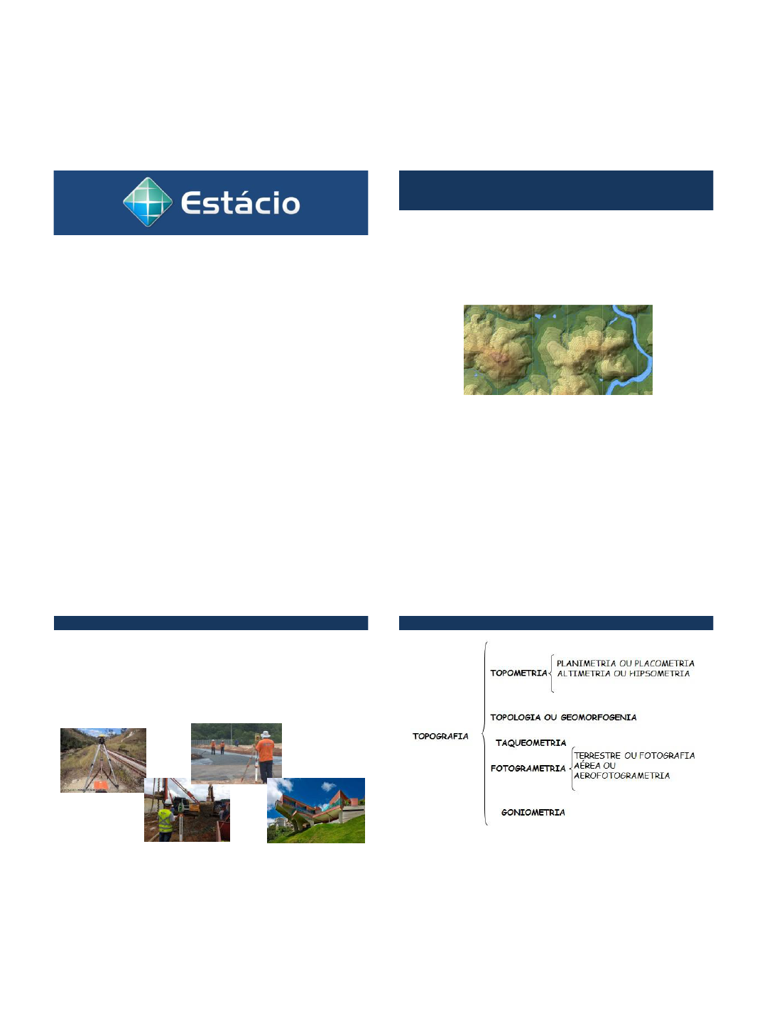 14/03/2018 1 CCE0381- TOPOGRAFIA INTRODUÇÃO A TOPOGRAFIA PROF. RANGEL DEFINIÇÃO A palavra "Topografia" deriva das palavras gregas "topos" (lugar) e "graphen" (descrever), o que significa, a descrição exata e minuciosa de um lugar. TOPOGRAFIA IMPORTÂNCIA É a base de qualquer projeto e de qualquer obra realizada por engenheiros ou arquitetos. TOPOGRAFIA 14/03/2018 2 TOPOMETRIA Técnicas e procedimentos para obtenção de medidas (ângulos e distâncias) para determinar posições relativas na superfície terrestre. PLANIMETRIA • Posição planimétrica dos pontos (coordenadas X e Y); ALTIMETRIA • Determinação da cota ou altitude (coordenada Z); • Curvas de nível; PLANIALTIMETRIA • Planimétrico + Altimétrico TOQUEOMETRIA • Medidas calculadas por trigonometria; • Triângulo retângulo; TOPOLOGIA • Interpretação da superfície externa; • Descrição das formas do relevo. FOTOGRAMETRIA • Obtenção de medidas: observação e interpretação fotografias; • Tamanho de áreas, características físicas do terreno; • Reconhecimento de áreas em grandes projetos. 14/03/2018 3 SISTEMA DE COORDENADAS Coordenadas Cartesianas: • Sistema de eixos com duas retas perpendiculares, com início na origem (ponto 0); • (abscissa, ordenada) = (X,Y) QUAL É A COORDENADA DO PONTO A? SISTEMA DE COORDENADAS Esboçe os gráficos a seguir. • 1) A (1,5); B (2,3); C (3,2); D (4,3); E (5,5) • 2) A (1,1); B (1,3); C (3,3); D (3,4); E (4,5); F (4,1) • Agora calcule a área do polígono obtido. • 3) A (10,10); B (10,30); C (20,30); D (40,60); E (40,30); F (50,30); G (50,10). • Agora calcule a área do polígono obtido MOVIMENTO E POSIÇÃO DA TERRA – ROTAÇÃO – TRANSLAÇÃO – LATITUDE – LONGITUDE TEORIA DOS ERROS Segundo (Correa, Iran. C. S.) 5, todas as observações topográficas se reduzem na medida de uma distância, de um ângulo ou de uma diferença de nível as quais podem ser afetadas de erros ocasionados pelos aparelhos, pelas condições exteriores e pelo observador. Os erros podem ser classificados em duas grandes categorias: sistemáticos e acidentais. 14/03/2018 4 Condições Ambientais: • Variações vento, temperatura; Instrumentais: • Imperfeição no ajuste dos equipamentos; • Falta de calibração Pessoais: • Falta de atenção; • Cansaço; • Executar mais de uma leitura. TEORIA DOS ERROS ERROS DE OBSERVAÇÃO Condições Ambientais: • Variações vento, temperatura; Instrumentais: • Imperfeição no ajuste dos equipamentos; • Falta de calibração Pessoais: • Falta de atenção; • Cansaço; • Executar mais de uma leitura. TEORIA DOS ERROS TEORIA DOS ERROS Erros grosseiros: • Engano na medição, leitura errada, identificação alvo; • Desatenção do observador, falha do equipamento; • Erros de anotação, contagem de lances. Erros sistemáticos: • Efeito da temperatura; • Medição com medidor eletrônico de distâncias. Erros acidentais: • Erros permanecem com a correção dos outros; • Tendem a neutralizar quanto maiores forem amostras; • Inclinação da baliza; • Erro na hora da mira. TEORIA DOS ERROS Erros grosseiros: • Engano na medição, leitura errada, identificação alvo; • Desatenção do observador, falha do equipamento; • Erros de anotação, contagem de lances. Erros sistemáticos: • Efeito da temperatura; • Medição com medidor eletrônico de distâncias. Erros acidentais: • Erros permanecem com a correção dos outros; • Tendem a neutralizar quanto maiores forem amostras; • Inclinação da baliza; • Erro na hora da mira. 14/03/2018 5 TEORIA DOS ERROS QUAIS CUIDADOS DEVEM SER TOMADOS A escolha de métodos e instrumentos depende: • Do grau de precisão de cada instrumento; • Do método empregado e do conhecimento dos limites permissíveis; • Dos erros encontrados. PRECISÃO E ACURÁCIA Precisão: • Ligado a repetição das medidas; Acurácia: • Ligada ao grau de aderência das observações em relação ao seu valor verdadeiro. É PRECISO SABER.... • Unidades de medida; • Relações trigonométricas • Relações do triângulo retângulo; PRATICAR BASTANTE UNIDADE DE MEDIDA Medida de Comprimento: • Metro: Unidade básica do Sistema Internacional 14/03/2018 6 UNIDADE DE MEDIDA Medida de Angular: • Radiano: • Unidade Sexagesimal (graus): • Unidade decimal (grado); UNIDADE DE MEDIDA CÁLCULOS COM ÂNGULOS • Ângulos (GMS) → Frações decimais a) 32º28’59’’ = 32,48305556º 1’=60’’ então (28’x60’’ + 59)/3600= 0,48305556 b) 17º34’18,3’’ = c) 125º59’57’’ = UNIDADE DE MEDIDA • Frações decimais → Ângulos (GMS) a) 32,48305556º = 32º28’59’’ 0,4830556 x 60’ = 28,9833336 0,9833336 x 60’’ = 59 b) 48,75587890º = c) 35,21478469º = UNIDADE DE MEDIDA Soma e subtração de ângulos a) 30º20’ + 20º52’ = 51º12’ b) 28º41’ + 39º39’ = c) 42º30’ – 20º40’ = d) 25º12’45’’ + 74º51’27’’ = e) 34º48’59’’ + 98º58’04’’ = f) 124º37’40’’ – 84º48’50’’ = 14/03/2018 7 TRIGONOMETRIA PLANA RELAÇÕES TRIGONOMÉTRICAS TRIÂNGULO RETÂNGULO TRIGONOMETRIA PLANA PRATIQUEM!!! TRIGONOMETRIA PLANA PRATIQUEM!!! TRIGONOMETRIA PLANA 14/03/2018 8 TRIGONOMETRIA PLANA TRIGONOMETRIA PLANA TRIÂNGULO QUALQUER Lei dos Senos Lei dos Cossenos a2 = b2 + c2 – 2.b.c.cos A TRIGONOMETRIA PLANA ESCALAS A NBR 8196 (Emprego de escalas em desenho técnico: procedimentos) define escala como sendo a relação da dimensão linear de um elemento e/ou um objeto apresentado no desenho original para a dimensão real do mesmo e/ou do próprio objeto. “Relação entre o valor da distância medida no desenho e sua correspondente no terreno” 14/03/2018 9 ESCALAS Representação em papel da superfície terrestre; Distância desenho: 5cm; distância terreno 0,5 km; Qual a escala:? ESCALAS PRINCIPAIS ESCALAS E APLICAÇÕES ESCALAS Principais escalas: • 1:100; 1:250; 1:500; 1:1.000; 1:2.000; Tam