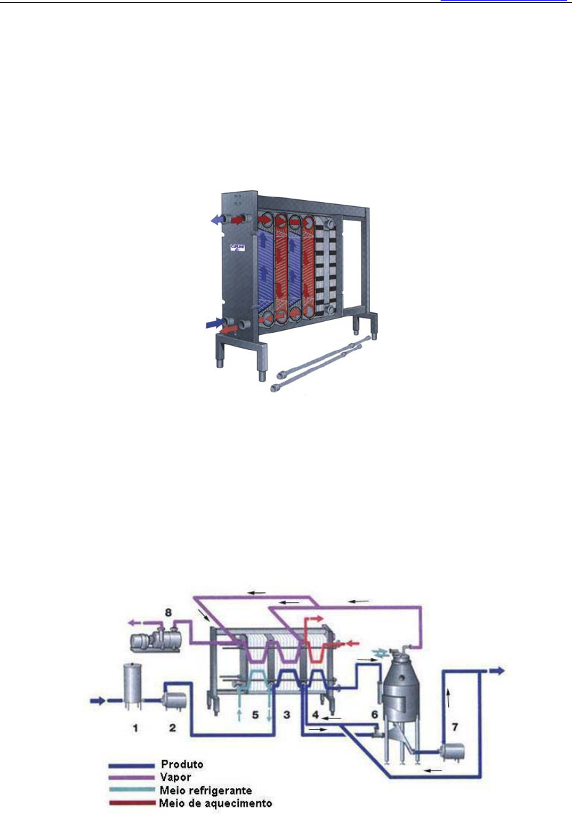 UFES - Universidade Federal do Espírito Santo CCA - Centro de Ciências Agrárias - ERU - Departamento de Engenharia Rural ENG O5212 Tecnologia de Produtos de Origem Animal I – I/2008 – Prof. Luis César – Website: http://www.agais.com/tpoa1 72 Entende-se por operações unitárias na indústria de alimentos, os procedimentos que imprime algum tipo de transformação da matéria prima em processamento. Estes procedimentos podem implicar no emprego de mão-de-obra, maquinários específicos e fontes de energia como a elétrica e a calorífica. Normalmente, os maquinários são construídos considerando fundamentos físicos, químicos e de engenharia, como também as características físico-químicas das matérias primas. Por exemplo, na Figura 7 é apresentado o esquema básico de um trocador de calor tipo placa, princípio este empregado em equipamentos como pasteurizadores e evaporadores. Figura 7 – Desenho esquemático de um trocador de calor de placas Conforme a Figura 6 tem-se que pelas placas justapostas circulam dois tipos de substâncias a temperaturas diferenciadas. Estas substâncias podem ser, por exemplo, (i) água gelada e leite aquecido; ou (ii) vapor superaquecido e leite cru. Assim por meio das placas é promovida a troca de calor. O tempo de exposição ao processo de troca de calor irá depender fundamentalmente da velocidade que as substancias circulam pela placa. Os pasteurizadores industriais, Figura 8, são projetados tendo por fundamento o trocador de calor apresentado na Figura 7. 1. Deposito 5. Seção de resfriamento 2. Bomba 6. Desareador 3. Seção de pré-aquecimento 7. Bomba 4. Seção de aquecimento Figura 8 – Fluxograma básico de um pasteurizador de leite UFES - Universidade Federal do Espírito Santo CCA - Centro de Ciências Agrárias - ERU - Departamento de Engenharia Rural ENG O5212 Tecnologia de Produtos de Origem Animal I – I/2008 – Prof. Luis César – Website: http://www.agais.com/tpoa1 73 Normalmente, conforme representado na Figura 8, os pasteurizadores de leite são divididos em três seções 3, 4 e 5. Na seção 3 o leite cru é pré-aquecido, aproveitando o calor a ser retirado do leite pasteurizado proveniente da seção 4. Nesta seção é aquecido a temperatura de 72 a 75 oC por um período de tempo de 15 a 20 segundos. Para promover o aquecimento pode ser empregado vapor super aquecido, representado na Figura 8 como meio de aquecimento. O leite aquecido pode ser conduzido ao aerador, que é um equipamento dispensável em pequenas instalações. Neste equipamento o leite é turbilhonado de tal forma que substâncias voláteis que conferem odor ao leite sejam retiradas. O leite que sai do aerador retorna ao corpo do pasteurizador para ter a sua temperatura reduzida a 4 oC para então ser armazenado ou acondicionado em embalagens. Na seção 3 o leite aquecido cede calor ao leite cru. Isto é uma forma de reaproveitamento de calor. Na seção 5 por meio das placas o leite aquecido tem contato com água a temperatura próxima de 0oC, assim o leite atinge a temperatura desejada. Caso o leite venha a ser utilizado em algum processo industrial, por exemplo, fabricação de iogurte ou queijo, necessariamente, a sua temperatura não precisa ser reduzida 4 oC. Conforme as normas vigentes “o pasteurizador, Figura 9, deve ser de placas e possuir painel de controle, termo-registrador automático, termômetros e válvula automática de desvio de fluxo, bomba positiva ou homogeneizador, sendo que a refrigeração a 4°C (quatro graus Celsius) máximos após a pasteurização deve ser feita igualmente em seção de placas” (Instrução Normativa Nº 51, De 18 De Setembro De 2002). Figura 9 – Pasteurizador de leite e ao fundo o equipamento de envasamento. Na Figura 10 é apresentado o fluxograma de uma linha de beneficiamento de leite em equipada com aerador e homogeneizador. O emprego de homogeneizador é obrigatório se a validade do produto for superior a 24 h (vinte e quatro horas). A função básica desse equipamento é promover a redução dos tamanhos dos glóbulos de gordura promovendo a melhor distribuição deste constituinte por toda a solução. UFES - Universidade Federal do Espírito Santo CCA - Centro de Ciências Agrárias - ERU - Departamento de Engenharia Rural ENG O5212 Tecnologia de Produtos de Origem Animal I – I/2008 – Prof. Luis César – Website: http://www.agais.com/tpoa1 74 1. Pasteurizador 6. Homogeneizador 2. Desareador 7. Tubo de retenção 3. Controlador de fluxo 8. Bomba secundária 4. Separador (centrífuga) 9. Bomba de vácuo 5. Unidade de padronização Figura 10 - Fluxograma de uma linha de beneficiamento de leite equipada com aerador e homogeneizador. Na Figura 11 é apresentado o conjunto de equipamentos convencionais aplicados a produção de queijo. O tanque de coagulação é o local em que é promovida a coagulação do leite por meio do coalho ou outras enzimas coagulantes apropriadas. Os agitadores são empregados para nos momentos iniciais promover a homogeneização da mistura leite e substância coagulante. Como também após o corte da massa por meio das liras de corte. O tanque dispõe de dreno para o escoamento do soro e caso necessário pode ser empregado uma bomba para conduzir o soro a uma outra seção do laticínio. O exemplo de tanque apresentado na Figura 11 pode ser confeccionado em aço inoxidável ou metal pintando com tinta esmalte. Porém estes tanques podem ser construídos em alvenaria e revestidos com azulejos, respeitando as normas especificadas pelo Ministério Da Agricultura, Pecuária e Abastecimento. É importante ser ressaltado que alguns tanques podem ser dotados de tubulações para introduzir vapor a massa em coagulação para acelerar e otimizar o processo. Neste caso o vapor terá contato direto com o produto. Portanto, a água utilizada na caldeira deve possuir qualidade sob aspecto microbiológico. Na Figura 12 é apresentado o atomizador, equipamento