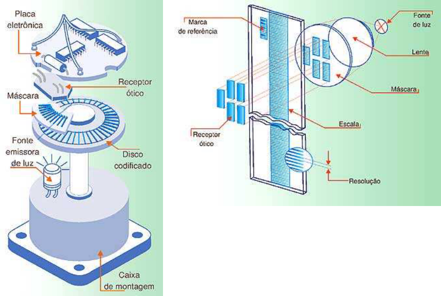 1 ENCODERS Juliano Matias Este é sem dúvida nenhuma um dos equipamentos mais usados em Automação Industrial e Mecatrônica, pois com ele conseguimos converter movimentos angulares e lineares em informações úteis à nossa máquina ou processo. Neste artigo pretendemos abordar os mais diversos tipos de encoders, seu princípio de funcionamento e suas aplicações. O encoder é um transdutor que converte um movimento angular ou linear em uma série de pulsos digitais elétricos. Esses pulsos gerados podem ser usados para determinar velocidade, taxa de aceleração, distância, rotação, posição ou direção. As principais aplicações dos encoders são: - em eixos de Máquinas Ferramentas NC e CNC; - em eixos de Robôs; - controle de velocidade e posicionamento de motores elétricos; - posicionamento de antenas parabólicas, telescópios e radares; - mesas rotativas; e - medição das grandezas acima mencionadas de forma direta ou indireta. O sistema de leitura é baseado em um disco (encoder rotativo), formado por janelas radiais transparentes e opacas alternadas. Este é iluminado perpendicularmente por uma fonte de luz infravermelha, quando então, as imagens das janelas transparentes são projetadas no receptor. O receptor converte essas janelas de luz em pulsos elétricos conforme os desenho das figuras 1 e 2. Os encoders podem ser divididos em encoders incrementais e absolutos. Fig 1 - Princípio de funcionamento de um encoder rotativo. Fig. 2 - Princípio de funcionamento de um encoder linear. 2 ENCODERS INCREMENTAIS O encoder incremental fornece normalmente dois pulsos quadrados defasados em 90º, que são chamados usualmente de canal A e canal B. A leitura de somente um canal fornece apenas a velocidade, enquanto que a leitura dos dois canais fornece também o sentido do movimento. Um outro sinal chamado de Z ou zero também está disponível e ele dá a posição absoluta "zero" do encoder. Este sinal é um pulso quadrado em que a fase e a largura são as mesmas do canal A. Veja um exemplo na figura 3. Figura 3 - Representação gráfica dos sinais A, B e Z de um encoder incremental. A resolução do encoder incremental é dada por pulsos/revolução (normalmente chamado de PPR), isto é, o encoder gera uma certa quantidade de pulsos elétricos por uma revolução dele próprio (no caso de um encoder rotativo). Para determinar a resolução basta dividir o número de pulsos por 360º, por exemplo, um encoder fornecendo 1024 pulsos/ revolução, geraria um pulso elétrico a cada 0,35º mecânicos. A precisão do encoder incremental depende de fatores mecânicos, elétricos e ambientais, que são: erros na escala das janelas do disco, excentricidade do disco, excentricidade das janelas, erro introduzido na leitura eletrônica dos sinais, temperatura de operação e nos próprios componentes transmissores e receptores de luz. Normalmente, nos encoders incrementais são disponibilizados além dos sinais A, B e Z, também os sinais complementares, /A, /B e /Z . Encoder Incremental ENCODERS ABSOLUTOS O princípio de funcionamento de um encoder absoluto e de um encoder incremental é bastante similar, isto é, ambos utilizam o princípio das janelas transparentes e opacas, com estas interrompendo um feixe de luz e transformando pulsos luminosos em pulsos elétricos. 3 Encoder Absoluto O encoder absoluto possui um importante diferencial em relação ao encoder incremental: a posição do encoder incremental é dada por pulsos a partir do pulso zero, enquanto a posição do encoder absoluto é determinada pela leitura de um código e este é único para cada posição do seu curso; conseqüentemente os encoders absolutos não perdem a real posição no caso de uma eventual queda da tensão de alimentação (até mesmo se deslocados). Quando voltar a energia ao sistema, a posição é atualizada e disponibilizada para o mesmo (graças ao código gravado no disco do encoder) e, com isso, não se precisa ir até a posição zero do encoder para saber a sua localização como é o caso do incremental. O código de saída é utilizado para definir a posição absoluta do encoder. O código mais empregado é o binário, pois este é facilmente manipulado por um circuito relativamente simples e, com isso, não se faz necessário nenhum tipo de conversão para se obter a posição real do encoder. O código é extraído diretamente do disco (que está em rotação). O sincronismo e a aquisição da posição no momento da variação entre dois códigos tornam-se muito difíceis. Se nós pegarmos como exemplo dois códigos consecutivos binários como 7 (01112) e 8 (10002), notaremos que a variação de zero para um e um para zero ocorre em todos os bits, e uma leitura feita no momento da transição pode resultar em um valor completamente errado (figura 4). Figura 4 - Zona de Múltiplas comutações em um encoder absoluto. Para solucionar esse problema é utilizado um código binário chamado "Código Gray", que tem a particularidade de na comutação de um número para outro somente um bit ser alterado como podemos verificar na tabela abaixo. 4 Vemos também na figura 5 dois discos óticos um com código binário e outro em código Gray. Figura 5 - Diferença construtiva dos discos ópticos utilizando código binário e código Gray (2 bits). O código Gray pode ser convertido facilmente em código binário pelo simples circuito de lógica combinacional da figura 6. 5 Figura 6 - Circuito de conversão de código Gray para código binário. A resolução do encoder absoluto é dada por contagem/revolução, isto é, se ele tiver no seu disco (encoder rotativo) 12 faixas para o código Gray, então terá 212 combinações possíveis perfazendo um total de 4096 combinações. Fazendo algumas contas, concluiremos que o encoder gera uma combinação de códigos a cada 0,0879º ou 0º8m79s. Podemos verificar outras resoluções para encoders absolutos na tabela abaixo. 6 Os encoders absolutos 