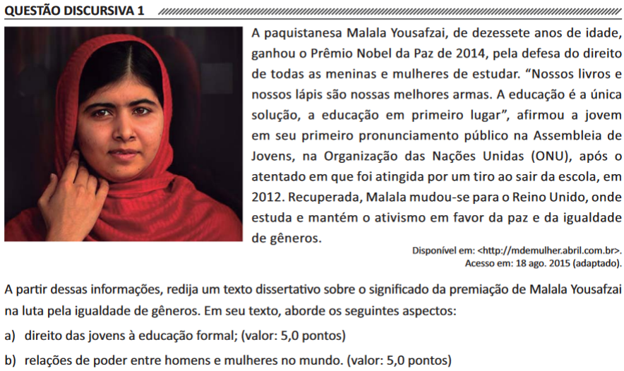 Formação Geral PADRÃO DE RESPOSTA O estudante deve elaborar um texto dissertativo que contemple alguns dos seguintes argumentos e exemplos possíveis: Item a: Caminhos para condução das respostas a respeito do Direito das meninas/jovens/mulheres: Todo cidadão tem o direito à educação com base no texto da Constituição Brasileira; Direito à educação apoiado no Estatuto da Criança e do Adolescente; Direito à educação apoiado na Declaração dos Direitos Humanos; Universalização de direitos; Educação como ponte para o aprimoramento de ideias; Reflexões críticas a respeito de situações em que se observa obstáculo ao livre acesso à educação; Vinculação entre educação e paz social. Item b: Caminhos para condução das respostas a respeito das relações de poder entre homens e mulheres: Violência física e psicológica contra a mulher, incluindo a Lei Maria da Penha, no caso específico do Brasil; Tolerância/intolerância a vestimentas, trajes, comportamentos socialmente estereotipados; Aspectos socioculturais que impõem à mulher uma condição de submissão na sociedade, tais como: mutilação, impossibilidade de manifestar seus desejos e posicionamentos em algumas culturas, entre outros; Igualdade/desigualdade de gênero, por exemplo, no mercado de trabalho, em relação à desigualdade salarial; Ideais de Liberdade, Igualdade e Fraternidade: referência a esses ideais como possibilidade de equilibrar as relações de poder entre homens e mulheres. PADRÃO DE RESPOSTA O estudante deve elaborar um texto dissertativo que aborde os seguintes aspectos: 1) reconhecer o caráter dinâmico da cultura, trazendo elementos dos textos 1 e 2 (padrão de resposta), e com base nesses textos posicionar-se a respeito do reconhecimento do funk como legítima manifestação artística e cultural da sociedade brasileira (enunciado da questão); 2) situar o funk dentro das reflexões do segundo texto (Laraia, 2008), abordando aspectos como mudança, preconceito, diferença, relações interculturais; 3) clareza na exposição das ideias. Obs.: As notas serão atribuídas de acordo com o preenchimento dos critérios citados acima e considerando três correntes interpretativas que podem estar presentes nas respostas: a favor, contra e intermediária em relação ao reconhecimento do funk como legítima manifestação artística e cultural da sociedade brasileira. Psicologia PADRÃO DE RESPOSTA a) O estudante deve apresentar objetivamente um problema de pesquisa relacionado ao assunto apresentado, por exemplo: as mudanças no mundo do trabalho. as políticas públicas na área, como as de enfrentamento do desemprego, da discriminação etc. b) O estudante deve descrever, em linhas gerais, as etapas de sua pesquisa, incluindo o desenho da pesquisa, instrumentos e procedimentos. O plano deve conter as informações metodológicas essenciais, de modo coerente com o problema de pesquisa proposto. PADRÃO DE RESPOSTA a) O estudante deve indicar dois determinantes do problema escolhido, citando fatores sociais, estruturais, econômicos, políticos etc., relacionados aos determinantes do problema. b) O estudante deve propor uma ação coletiva articulada a uma perspectiva teórica da Psicologia ou a uma política pública que permita embasar objetivos e procedimentos para uma intervenção adequada, justificando minimamente sua escolha. Deve estar explícita em sua resposta a função do psicólogo. PADRÃO DE RESPOSTA a) O estudante deve identificar uma abordagem psicológica e utilizá-la para sustentar teoricamente uma intervenção terapêutica para o caso exposto no texto base. b) O estudante deve citar dois cuidados éticos na condução do caso.