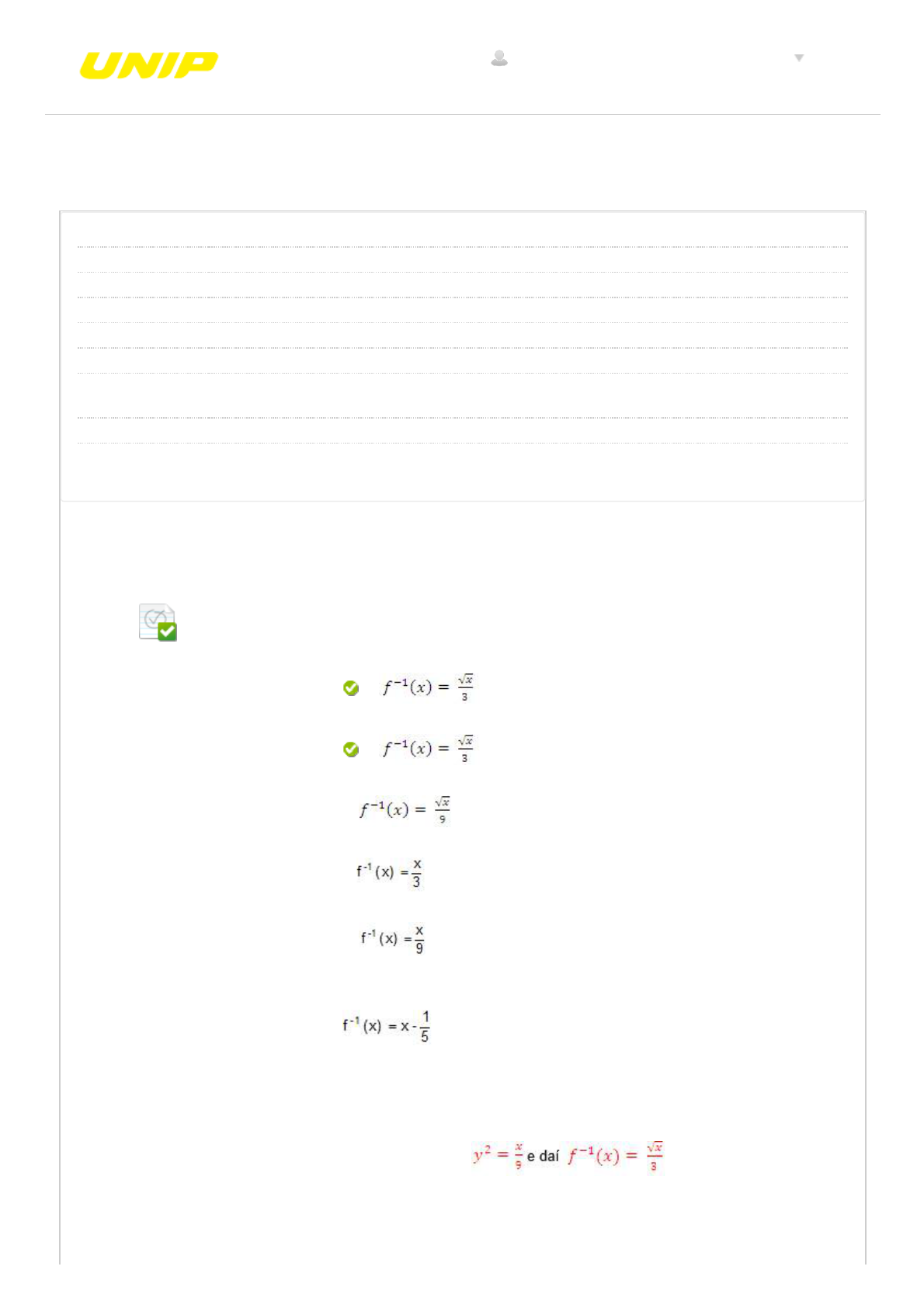 19/10/2018 Revisar envio do teste: QUESTIONÁRIO UNIDADE I – 6147-60... https://ava.ead.unip.br/webapps/assessment/review/review.jsp?attempt_id=_9394614_1&course_id=_28208_1&content_id=_433583_1&return_c… 1/6 Revisar envio do teste: QUESTIONÁRIO UNIDADE I CÁLCULO DIFERENCIAL DE UMA VARIÁVEL 6147-60_15402_R_20182 CONTEÚDO Usuário mariane.dezogo @unipinterativa.edu.br Curso CÁLCULO DIFERENCIAL DE UMA VARIÁVEL Teste QUESTIONÁRIO UNIDADE I Iniciado 13/10/18 10:53 Enviado 19/10/18 16:43 Status Completada Resultado da tentativa 2,7 em 3 pontos Tempo decorrido 149 horas, 49 minutos Resultados exibidos Todas as respostas, Respostas enviadas, Respostas corretas, Comentários, Perguntas respondidas incorretamente Pergunta 1 Resposta Selecionada: a. Respostas: a. b. c. d. e. Feedback da resposta: A inversa da função f(x) = 9 x2 é: . . . . . . Resposta correta: alternativa A. Resolução: Para determinar a inversa, inicialmente vamos trocar as letras x e y, assim temos x = 9y2, isolando y �camos com CONTEÚDOS ACADÊMICOS BIBLIOTECAS MURAL DO ALUNO TUTORIAISUNIP EAD 0,3 em 0,3 pontos mariane.dezogo @unipinterativa.edu.br 16 19/10/2018 Revisar envio do teste: QUESTIONÁRIO UNIDADE I – 6147-60... https://ava.ead.unip.br/webapps/assessment/review/review.jsp?attempt_id=_9394614_1&course_id=_28208_1&content_id=_433583_1&return_c… 2/6 Pergunta 2 Resposta Selecionada: d. Respostas: a. b. c. d. e. Feedback da resposta: Considere a função y = x2 – 9 então y < 0 no intervalo: ] -3, 3 [ ] -∞, 3 [ ] 3, +∞ [ ] -3, 0 [ ] -3, 3 [ ] -∞, -9 [ Resposta correta: alternativa D. Resolução: Para determinar os sinais da função, podemos fazer o grá�co de f ou encontrar as raízes e daí fazer o estudo de sinais. Determinando as raízes de f, isto é, x2 - 9 = 0, temos x = 3 e x = - 3, e daí Logo, y < 0 se -3 < x < 3, isto é, no intervalo ]-3,3[. Pergunta 3 Resposta Selecionada: d. Respostas: a. b. c. d. e. Feedback da resposta: Das alternativas a seguir, a única correta é: f(x) = 4x é função linear. f(x) = 2x – 1 é decrescente. f(x) = - x + 1 é crescente. f(x) = 3x + 2 é função linear. f(x) = 4x é função linear. f(x) = x + 1 é função constante. Resposta correta: alternativa D. Resolução: a) (F) Pois a = 2 > 0, função crescente. b) (F) Pois a = -1 < 0, função decrescente. c) (F) Pois para ser linear devemos ter f(x) = a x, isto é, b = 0 e neste caso b = 2 ≠ 0. d) (V) É linear, pois b = 0. e) (F) Pois a função constante deve ter a = 0 e neste caso a = 1. 0,3 em 0,3 pontos 0,3 em 0,3 pontos 19/10/2018 Revisar envio do teste: QUESTIONÁRIO UNIDADE I – 6147-60... https://ava.ead.unip.br/webapps/assessment/review/review.jsp?attempt_id=_9394614_1&course_id=_28208_1&content_id=_433583_1&return_c… 3/6 Pergunta 4 Resposta Selecionada: e. Respostas: a. b. c. d. e. Feedback da resposta: O domínio da função é: IR Resposta correta: alternativa E. Resolução: Para existir a fração, o denominador deve ser diferente de zero, assim, devemos ter: 5x + 15 ≠0 e daí, resolvendo a equação, temos x ≠ -3 Pergunta 5 Resposta Selecionada: c. Respostas: a. b. c. d. e. Feedback da resposta: O domínio da função f(x) = é: IR Resposta correta: alternativa C. Resolução: Para existir a raiz quadrada de um número, ele deve ser positivo, assim, devemos ter: 2x – 8 ≥ 0 e daí, resolvendo a inequação, temos x ≥ 4 Pergunta 6 Resposta Selecionada: a. Respostas: a. Sendo A = {a, b, c} e B = {1, 2}, o conjunto que representa o produto cartesiano A x B é: A x B = { (a,1), (b,2), (c,2) } A x B = { (a,1), (b,2), (c,2) } 0,3 em 0,3 pontos 0,3 em 0,3 pontos 0 em 0,3 pontos 19/10/2018 Revisar envio do teste: QUESTIONÁRIO UNIDADE I – 6147-60... https://ava.ead.unip.br/webapps/assessment/review/review.jsp?attempt_id=_9394614_1&course_id=_28208_1&content_id=_433583_1&return_c… 4/6 b. c. d. e. A x B = { (a,1), (b,1), (c,1), (a,2), (b,2), (c,2) } A x B = { (1,a), (1,b), (1,c), (2,a), (2,b), (2,c) } A x B = { (a,1), (b,2) } A x B = { (a,1), (b,1), (c,1) } Pergunta 7 Resposta Selecionada: d. Respostas: a. b. c. d. e. Feedback da resposta: Sendo f(x) = 2 x + 5 e g(x) = x2–3 x +1então (2 f+g) (x) é: x2 + x + 11 - x2+ x+ 11 x2+7x+ 11 x2 + 2x+ 5 x2 + x + 11 - x2 - 2x+ 5 Resposta correta: alternativa D. Resolução: (2 f + g) (x) = 2 f (x) + g(x) = 2 (2x + 5) + ( x2 – 3 x +1)= 4 x + 10 + x2 – 3 x +1= =x2 + x + 11 Pergunta 8 Resposta Selecionada: e. Respostas: a. b. c. d. e. Feedback da resposta: Sendo f(x) = x2 + 2 x e g(x) = x - 5 então (f o g) (x) é: x2 – 8 x + 15 x2 + 12x + 4 x2 + 12 x + 15 x2-8x 3 x2 + 2 x2 – 8 x + 15 Resposta correta: alternativa E. Resolução: 0,3 em 0,3 pontos 0,3 em 0,3 pontos 19/10/2018 Revisar envio do teste: QUESTIONÁRIO UNIDADE I – 6147-60... https://ava.ead.unip.br/webapps/assessment/review/review.jsp?attempt_id=_9394614_1&course_id=_28208_1&content_id=_433583_1&return_c… 5/6 (f o g)(x) = f ( g(x)) = f( x – 5 ) = ( x – 5 )2 + 2. (x – 5)= x2 – 10 x + 25 + 2x – 10 = =x2 – 8 x + 15 Pergunta 9 Resposta Selecionada: c. Respostas: a. b. c. d. e. Feedback da resposta: Sendo f(x) =- x2 + x - 2 e g(x) = 3 x – 2, então a imagem de x = 2 pela função (f o g) (x) é: - 14 4 14 - 14 2 - 8 Resposta correta: alternativa C. Resolução: (f o g)(x) = f ( g(x)) = f( 3x – 2 ) = - ( 3x – 2 )2 + (3x – 2) - 2 = = - (9 x2 – 12 x + 4) + 3x – 2 - 2 = - 9 x2+12 x – 4 + 3x – 4 = = - 9 x2+15 x – 8 No ponto x = 2 temos (f o g) (2) = - 9 . 22+15. 2– 8= - 36 + 30 – 8 = - 14 Pergunta 10 Resposta Selecionada: d. Respostas: a. b. c. d. e. Feedback da resposta: Uma função é ímpar se f(-x) = - f(x), das funções a seguir, a única que é ímpar é: f(x) = 2 x f(x) = x3+ 1 f(x) = x + 3 f(x) = x2 f(x) = 2 x f(x) = x2 + 3 Resposta correta: alternativa D. Resolução: Devemos calcular f(-x) e – f(x) para cada uma das alternativas e comparar os resultados, assim: 0,3 em 0,3 pontos 0,3 em 0,3 pontos 19/10/2018 Revisar envio