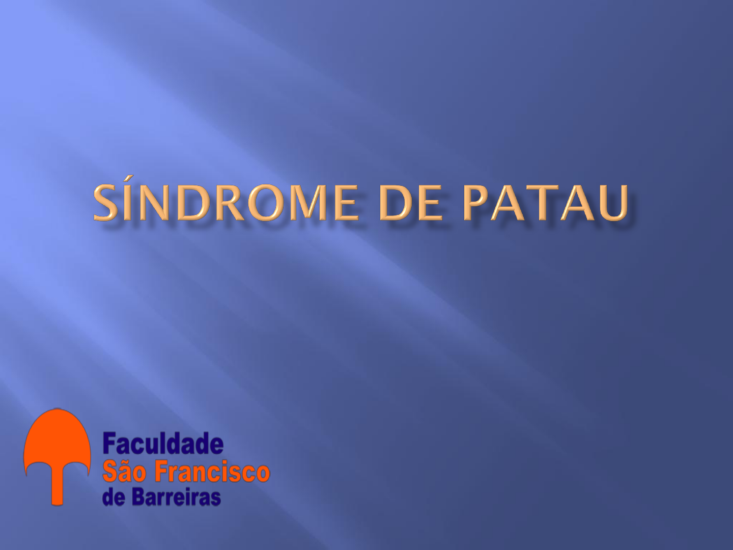 Fisioterapia aplicada à condições pediátricas Docente: Maria Carolina 6° semestre, fisioterapia A síndrome de Patau é uma doença genética causada pela trissomia do cromossomo 13. Se caracteriza por um vasto quadro clínico, a qual atinge diversos órgãos e sistemas. Ricardo, et all, 2008. Descrita por Klaus Patau, no ano de 1960, a qual observou casos de má formações múltiplas em neonato, que apresentavam trissomia do cromossomo 13. Esta síndrome foi nomeada de síndrome Bartholin-Patau, pois Thomas Bartholin, um dinamarquês, referiu anteriormente à Patau, no ano de 1956, as manifestações clínicas de crianças que apresentavam tal deficiência. Manica, et al, 2000. A trissomia do cromossomo 13 se define como uma desordem cromossomal resultando em uma síndrome, a qual é caracterizada especificamente por anormalidades morfológicas e má formações de órgãos. Acontece quando além do par normal do cromossomo 13 é acrescentado um a mais no genótipo de um recém – nascido. Tem como causa a não disjunção dos cromossomos durante a anáfase 1, originando gametas com 24 cromátides. Mânica, et al, 2000; A trissomia se origina do óvulo feminino, pois a mulher matura comumente apenas um ovócito, ao contrário do homem, que matura milhões de espermatozoides. Gametas masculinos alterados na numeração cromossômica, tem menos chances que gametas normais, sendo mínimas as possibilidades de um gameta masculino com 24 cromátides fecundar um ovócito. Mânica, et al, 2000; Tipos de Síndromes de Patau: Trissomia Livre: - Origem no óvulo feminino; - Alteração cromossômica numérica na qual um cromossoma possui três cópias em vez de duas habituais. Translocações: -20% das ocorrências; -Sendo 3/4 das translocações esporádicas, e 1/4 são herdados; Mosaicismo (46, XX ou XY/47, XX ou XY, +13); -5% das ocorrências ; -Menos afetado -Paciente chaga a idade adulta, mesmo manifestando o fenótipo; Sugayama, et al, 1999 Incide na variação de 1/4.000–10.000 crianças que nascem, levando ao óbito normalmente no primeiro mês da doença, isso, quando estas nascem vivas, já que a cada 7000 nascidos 1 nascem com vida. O rico umenta quando a gravidez acontece de forma tardia (>37 anos). Ultrassonografia Translucência Nucal Testes Sorológicos: -Níveis séricos de beta-HCG livre (gonadotrofina coriônica) - Proteína plasmática A (PAPP-A) Testes específicos: - Amniocentese, cordocentese - Coleta de amostras de vilosidades coriônicas (CAVC) ( Manica, et al, 2000) Confirmado através de exame cromossômico, o diagnóstico clínico da Síndrome de Patau é realizado investigando os sinais mais comuns após o nascimento: holoprosencefalia, agenesia pré maxilar, microftalmia, defeitos cardíacos congênitos, e polidactilia pós-axial, holoprosencefalia, defeitos cardíacos .. Nos casos em que estudos citogenéticos são normais ou não são realizados, a consangüinidade entre os pais deve levantar suspeita para esse diagnóstico. Mânica, et al, 2000; O prognóstico vital grave; Problemas cardio-respiratórios; A sobrevivência média é de 12 meses de vida, oscilando entre 4 meses em homens e 20 meses em mulheres. (Another, 2008) Retardo psicomotor é grave; O quoeficiente de Inteligência média é grave, e tende a diminuir com o passar o tempo; Apesar de tudo, a maioria conseguem ser capazes de aprender coisas ao longo da sua vida, e mesmo alguns pacientes conseguem adquirir funções como caminhar ou pedir as suas necessidades. (Another, 2008) A sobrevida média é de 130 dias. O prognóstico é melhor nos pacientes que apresentam trissomia 13 por translocação ou mosaicismo. Somente 12% dos pacientes com trissomia 13 livre sobrevivem até um ano de idade, diferentemente dos casos de mosaicismo em que mais de 30% conseguem ultrapassar esse período10,20. Sugayama, et al, 1999. SNC: - Holoprosencefalia (80%); - Arrinencefalia; - Abalos motores (Hipsarritimias); - Crise de apnéia; - Atraso neuropsicomotor grave. - Microcefalia - Hipotonia/Hipertonia Mânica, et al, 2000; Malformações Faciais ÁREA CRANIOFACIAL: - Fronte inclinada; - Anomalias Oculares( colobama da íris, microftalmia); - Displasia de retina; - Catarata; - Luxação de cristalino; - Tecido cartilaginoso na retina; - Ouvidos malformados (surdez); - Hemogiaomas capilares; - Fissura labiopalatina; Mânica, et al, 2000; CRESCIMENTO - Retado no crescimento pré e pós-natal PESCOÇO - Pescoço curto; - Excesso de pele no pescoço; Mânica, et al, 2000; SISTEMA CARDIOVASCULAR - Persistência do canal atrial; - Comunicação interventricular; - Comunicação interatrial; - Dextrocardia; - Anomalias valvulares; - Estreitamento ao longo da Aorta. Mânica, et al, 2000; EXTREMIDADES - Polidactilia; - Dedos em flexão e sobrepostos; - Unhas hiperconvexas e estreitas; - Calcâneo proeminente; TRATO GENITOURINÁRIO - Criptoquidia (homem); - Útero bicorno (mulheres) - Hidronefrose; - Rim policístico; - Hipoplasia de ovário. Mânica, et al, 2000; Os pacientes com a síndrome precisam de uma assistência médica rigorosa (equipe multidisciplinar), a qual este consiste desde o seu nascimento até após a alta hospitalar, no entanto ainda não existe um tratamento generalizado e viável, o que pode ser feito são cirurgias para correções ou melhoras de algumas irregularidades. Dr. Nassas, 2012. A presença do fisioterapeuta na equipe multidisciplinar tem o objetivo de amenizar a dor, o sofrimento dos familiares, e prevenir novas complicações, contribuindo para uma melhor qualidade de vida, interferindo diretamentos nos aspectos motor e respiratório. O tratamento da cardiopatia congênita visa, portanto, a melhora da qualidade de vida e da expectativa de vida. Minha filha nasceu com lábios leoporino, fenda palatina,sem visão, problemas neurológicos, cardiopatia congénita, polidaquitilia ( seis dedos), e com previsão médica de 3 dias de vida, mas deus colocou um anjo na pessoa da pediatra que acom