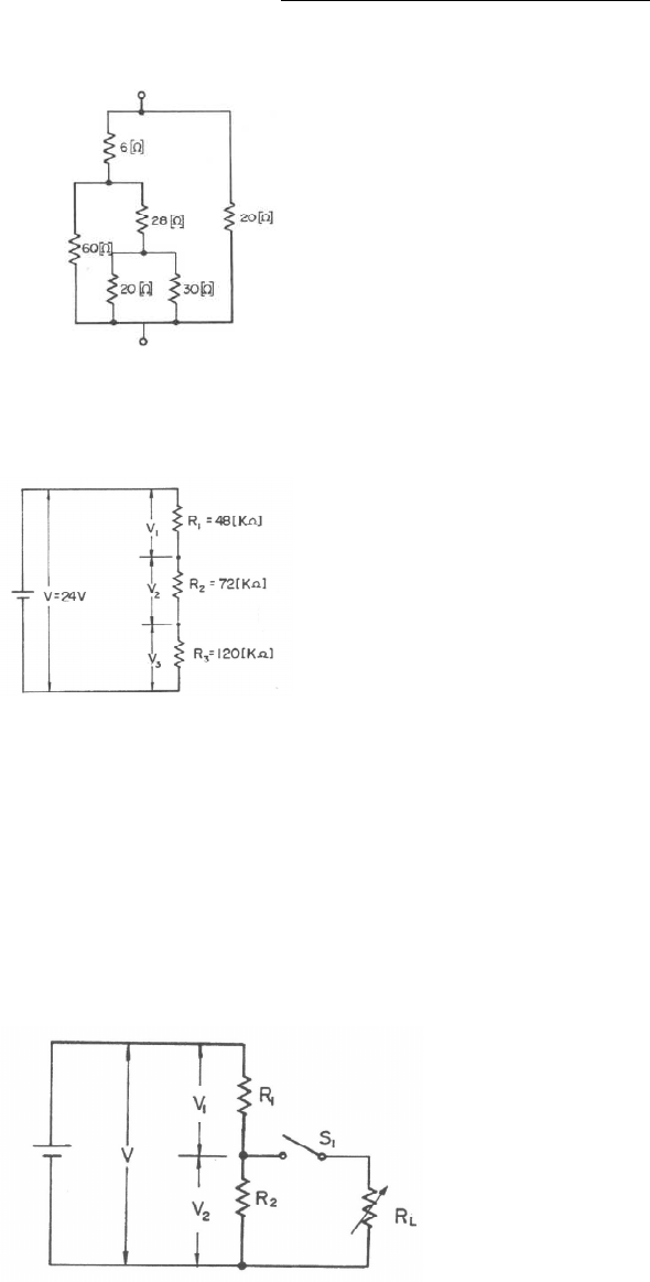 Lista de Exercício I - Circuitos CC 1 - Determine a resistência da associação: Resp: 12 Ω 2 - Dado o circuito determine as quedas de tensão, V1, V2 e V3 de cada resistor: Resp: V1 = 4,8 V; V2 = 7,2 V; V3 = 12 V 3 - Determinar as tensões V1 e V2, considerando: a) A chave S1 aberta. Resp: V1 = 7,8 V ; V2 = 10,8 V b) A chave S1 fechada e RL ajustada em 450 Ω. Resp: V1 = 16,12 V ; V2 = 2,48 V c) A chave S1 fechada e RL ajustada em 61,2 kΩ. Resp: V1=8,06 V; V2=10,54 V Dados: R1= 2,6 kΩ R2 = 3,6 kΩ V= 18,6V 4 - Determine as correntes em cada resistor: Resp: I1 = 12A ; I2 = 8A; I3 = 6A 5 - Determinar as correntes que passam em cada ramo do circuito. Resp: I1 = 3,9A ; I2= 4,2A ; I3 = -0,3 A 6 - Determinar a corrente total e a resistência do circuito abaixo: Resp: I = 10 A ; Rtotal = 22Ω 7 - Na associação de resistores abaixo, determine os valores de I e R: Resp: I = 8A R = 5Ω 8 - Determine a resistência total entre os pontos A e B: Resp: R=3,3Ω 9- Dado o circuito abaixo, considerando V = 90 V, calcule: a ) Corrente em R1. Resp: 3A b ) Corrente na Bateria. Resp: 9 A 10 - Uma bateria de f.e.m. de 1,5 V foi ligada a um resistor de 0,10Ω de resistência, notando-se neste uma dissipação de potência de 10W. Qual a resistência interna da bateria? Resp: 0,05Ω 11 - Podemos ligar uma lâmpada incandescente (comum) de 6,0V e 18W a rede de 120 V, se lhe associarmos em série um resistor conveniente. Para que a lâmpada funcione com suas características indicadas, determine: a) o valor da resistência desse resistor; R = 38 Ω b) a potência que dissipará esse resistor. P = 342 W 12 - Determine a corrente no resistor de 10 Ω Resp: 1,22 A 13 - Determine as correntes nos resistores, indicando seu sentido: Resp: IR1 = 1,445 mA ; IR2 =8,513mA; IR3 = 9,958 mA