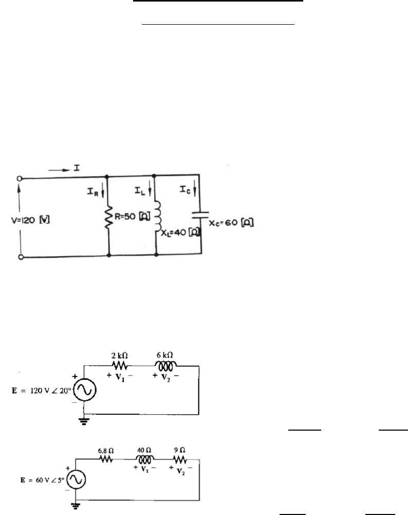 Lista de Exercício II - Circuitos CA PARTE 1 - Circuitos Monofásicos 1 - Dado um circuito em paralelo, com um resistor R = 50 [ Ω ], um indutor com XL= 40 [Ω] e um capacitor com Xc = 60 [ Ω ], alimentado por uma tensão alternada senoidal V = 120 [V] determinar: a) A corrente através do resistor. Resp: 2,4 A b) A corrente através do indutor. Resp: 3 A c) A corrente através do capacitor. Resp: 2 A d) A corrente total. Resp: 2,6 A e) A impedância. Resp: 46,15 Ω g) O diagrama vetorial das correntes. 2 - Calcule as tensões V1 e V2 nos circuitos abaixo: Resp: V1 = 37,94 |-51,5º V V2 = 113,8|38,4º V Resp: V1 = 55,8 |26,5º V V2 = 12,5 |-63,4º V 3 - Uma carga elétrica tem um fator de potência de 0,8 atrasado. Ela dissipa 8 kW quando a tensão é 200 V. Sabendo que o fator de potência é atrasado, calcule a impedância da carga. Resp: Z = 3,2 + j2,4 Ω 4 - Calcule as correntes I1 e I2 nos circuitos abaixo: 5 - Para o circuito abaixo determine: a) ZT b) I c) I2 e I3 d) VL 6 - Calcule I1, V1 e a Potencia fornecida pela fonte. 7 - Para o conjunto de lâmpadas (puramente resistivas), determine: a ) Potência total ativa, reativa e aparente. b) Corrente Is; c) Resistência de cada lâmpada; d) Correntes I1 e I2; 8 - Para o circuito abaixo, determine: a) Potencia ativa de cada elemento. b) Potencia reativa de cada elemento. c) Potencia aparente de cada elemento b) Potencia ativa, reativa, aparente fator de potência do sistema. c) Desenhe o triângulo de potências. d) Calcule Is. 9 – Calcule a impedância equivalente do circuito abaixo: Resp: Zeq = 5,10 |11,31° Ω 10 – Dado o circuito abaixo: a) Calcule a impedância equivalente do circuito Resp: Zeq = 273,34 |69,77° Ω b) Se for conectada aos terminais do circuito uma fonte de tensão alternada ( v(t) = 179,61sen(wt) ), qual o valor da corrente em cada ramo, como também a corrente entregue pelo circuito? Calcule a potência consumida pela instalação como também seu fator de potência. Se o fator de potência da instalação for menor que 0,92, como proceder para corrigir o fator de potência?