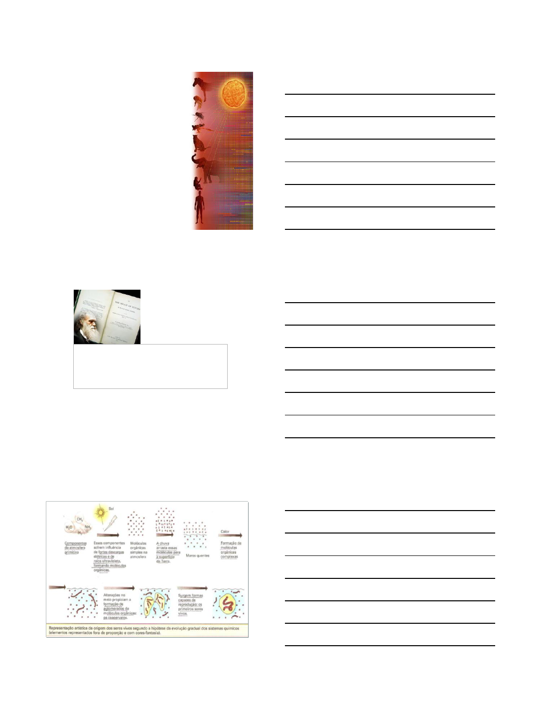 30/09/2018 1 Profª Drª Jacqueline Braga Evolução da célula: um tempo curto para uma experiência bem-sucedida. Profª Drª Jacqueline Braga “...em algum lago, pequeno e quente, com todo tipo de amônia e sais fosfóricos, luz, calor, eletricidade, etc. presentes,(…) um composto protéico foi formado quimicamente, pronto para sofrer mudanças mais complexas.” Charles Darwin Profª Drª Jacqueline Braga Evolução Biológica 30/09/2018 2 Profª Drª Jacqueline Braga Evolução Biológica Profª Drª Jacqueline Braga O estudo das células: Schleiden e Schwann 5 • 1837: Teoria Celular 1. Todos os organismos são constituídos de células. 2. A célula é a unidade morfológica e fisiológica dos seres vivos. 3. Toda célula é originada de outra célula preexistente Profª Drª Jacqueline Braga Origem das células 6 • Evolução das moléculas à célula – Formação dos compostos orgânicos – Origem do metabolismo – Origem da membrana celular “Independente da diversidade, todos os sistemas biológicos são constituídos pelos mesmos tipos de moléculas que se organizam em células” 30/09/2018 3 Profª Drª Jacqueline Braga Origem da vida Profª Drª Jacqueline Braga 3.8 bi anos Origem da vida Profª Drª Jacqueline Braga Protocélula: - Compartimentalização: membrana lipídica - Permeabilidade seletiva: troca com o meio. - Composição química: moléculas orgânicas em meio aquoso: moléculas energéticas (ATP); moléculas catalisadoras (enzimas) e armazenadoras de informação (RNA) - Armazenamento de informação herdável (RNA) sob efeitos da seleção natural. - Metabolismo: reações químicas relacionadas à sobrevivência A definição de vida (Muller 1966): “Entidades vivas teriam as propriedades de multiplicação, variação e hereditariedade.” 30/09/2018 4 Profª Drª Jacqueline Braga “Retrato falado” da primeira célula • Aquática • Procariótica • Anaeróbica • Heterótrofa • Assexuada • Evolução na obtenção de energia: fermentação, quimiossíntese, fotossíntese e respiração aeróbica Profª Drª Jacqueline Braga Estruturas similares a células em formações rochosas antigas (~ 3,5 bilhões de anos) - África do Sul e Austrália. Estromatólitos (colônias de cianobactérias ) Evidências das primeiras formas de vida na Terra Profª Drª Jacqueline Braga 30/09/2018 5 Profª Drª Jacqueline Braga Células Procarióticas – Do grego pro (primitivo) e karya (núcleo); – Ausência de carioteca; – Presença de parede celular; – Ausência de organelas membranosas; – Citosol não compartimentalizado; – Um único cromossomo circular; – Procariotos são unicelulares; – Representadas por bactérias e cianobactérias. 13 Profª Drª Jacqueline Braga Profª Drª Jacqueline Braga Células Eucarióticas – Do grego eu (verdadeiro) e karya (núcleo); – DNA associado a histonas; – Presença de sistema de endomembranas (compartimentalização funcional); – Presença de organelas membranosas; – Podem ser unicelulares ou pluricelulares; – Células animais, vegetais, fungos, protozoários e muitas algas. 15 30/09/2018 6 Profª Drª Jacqueline Braga PRESENÇA DE CENTRÍOLOS, AUSÊNCIA DE CLOROPLASTOS, PAREDE CELULAR E GRANDES VACÚOLOS Célula eucariótica animal Profª Drª Jacqueline Braga AUSÊNCIA DE CENTRÍOLOS, PRESENÇA DE CLOROPLASTOS, PAREDE CELULAR E GRANDES VACÚOLOS Célula eucariótica vegetal Profª Drª Jacqueline Braga Linn Margullis Do Procarionte ao Eucarionte: estudos • 1905- Mereschkowsky observou que os cloroplastos se dividiam de modo similar às cianobactérias; • 1922- Wallin propôs que as mitocôndrias teriam uma origem endossimbiótica; • 1970-Margulis publicou o livro “ Origin of Eukaryotic cel”, que popularizou a Teoria Endossimbiótica 30/09/2018 7 Profª Drª Jacqueline Braga Do Procarionte ao Eucarionte: hipóteses complementares • Hipótese Autogênica ou da Endoinvaginação • A célula procariótica teria sofrido sucessivas invaginações da membrana plasmática com posterior especialização. • Hipótese Endossimbiótica • A célula eucariótica terá surgido de uma associação simbiótica entre diversas células procarióticas. Profª Drª Jacqueline Braga Hipótese Autogênica ou da Endoinvaginação Profª Drª Jacqueline Braga Hipótese da Endossimbiose sequencial Assista ao vídeo : https://youtu.be/Maf_v-37nlM 30/09/2018 8 Profª Drª Jacqueline Braga Profª Drª Jacqueline Braga Associação das hipóteses Profª Drª Jacqueline Braga • Existência de um genoma mitocondrial; • Presença de dupla membrana na mitocôndria (evidência de fagocitose); • Genoma com poucas sequências regulatórias; • A transcrição contínua do genoma; • Ribossomos e síntese protéica similares à procariotos; • Sensibilidade à antibióticos similar a procariotos; • DNA circular desprovido de histonas; • Genes nucleares que codificam genes mitocondriais e de cloroplastos semelhantes aos bacterianos; • Divisão por fissão binária. Evidências da hipótese Endossimbiótica 30/09/2018 9 Profª Drª Jacqueline Braga Origem endossimbiótica do cloroplasto Profª Drª Jacqueline Braga De prisioneiro a escravo Endosymbiotic gene transfer: organelle genomes forge eukaryotic chromosomes J. N. TIMMIS et al.Nature Reviews Genetics 5, 123; February , 2004 Profª Drª Jacqueline Braga De prisioneiro a escravo A transferência de DNA das organelas para o núcleo ocorre numa frequência muito maior que imaginávamos. Isso traz consequências evolucionárias. Endosymbiotic gene transfer: organelle genomes forge eukaryotic chromosomes J. N. TIMMIS et al.Nature Reviews Genetics 5, 123; February , 2004 30/09/2018 10 Profª Drª Jacqueline Braga Células procariontes Células eucariontes Envoltório nuclear Ausente Presente DNA Desnudo Combinado com proteínas Cromossomas Únicos Múltiplos Nucléolos Ausentes Presentes Divisão Fusão binária Mitose e meiose Ribossomas 7