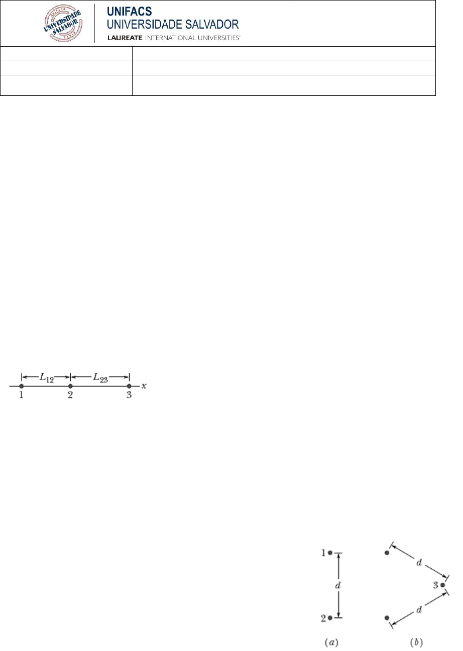 EETI – Escola de Engenharia e TI Disciplina: Física – Eletricidade Professor: Rafael Doria Aluno (a): Lista 1 (Força elétrica, Campo elétrico) 1) Uma partícula com uma carga de +3,00 × 10–6 C está a 12,0 cm de distância de uma segunda partícula com uma carga de –1,50 × 10–6 C. Calcule o módulo da força eletrostática entre as partículas. 2) Duas partículas de mesma carga são colocadas a 3,2 × 10–3 m de distância uma da outra e liberadas a partir do repouso. A aceleração inicial da primeira partícula é 7,0 m/s2 e a da segunda é 9,0 m/s2. Se a massa da primeira partícula é 6,3 × 10–7 kg, determine (a) a massa da segunda partícula e (b) o módulo da carga das partículas. 3) Na figura, três partículas carregadas estão em um eixo x. As partículas 1 e 2 são mantidas fixas. A partícula 3 está livre para se mover, mas a força eletrostática exercida sobre ela pelas partículas 1 e 2 é zero. Se L23 = L12, qual é o valor da razão q1/q2? 4) As cargas e coordenadas de duas partículas mantidas fixas no plano xy são q1 = +3,0 μC, x1 = 3,5 cm, y1 = 0,50 cm e q2 = –4,0 μC, x2 = –2,0 cm, y2 = 1,5 cm. Determine (a) o módulo e (b) a direção da força eletrostática que a partícula 1 exerce sobre a partícula 2. Determine também (c) a coordenada x e (d) a coordenada y de uma terceira partícula de carga q3 = +4,0 μC para que a força exercida sobre ela pelas partículas 1 e 2 seja nula. 5) Na figura - a, as partículas 1 e 2 têm carga de 20,0 μC cada uma e estão separadas por uma distância d = 1,50 m. (a) Qual é o módulo da força eletrostática que a partícula 2 exerce sobre a partícula 1? Na figura - b, a partícula 3, com carga de 20,0 μC, é posicionada de modo a completar um triângulo equilátero. (b) Qual é o módulo da força eletrostática a que a partícula 1 é submetida devido à presença das partículas 2 e 3? 6) Quantos elétrons é preciso remover de uma moeda para deixá-la com uma carga de +1,0 × 10–7 C? 7) Na figura a seguir, três esferas condutoras iguais são dispostas de modo a formarem um triângulo equilátero de lado d = 20,0 cm. Os raios das esferas são muito menores que d. As cargas das esferas são qA = –2,00 nC, qB = –4,00 nC e qC = +8,00 nC. (a) Qual é o módulo da força eletrostática entre as esferas A e C? Em seguida, é executado o seguinte procedimento: A e B são ligadas por um fio fino, que depois é removido; B é ligada à terra pelo fio, que depois é removido; B e C são ligadas pelo fio, que depois é removido. Determine o novo valor (b) do módulo da força eletrostática entre as esferas A e C; (c) do módulo da força eletrostática entre as esferas B e C. 8) Na figura seguinte, determine (a) o módulo e (b) a direção da força eletrostática total a que está submetida a partícula 4. Todas as partículas são mantidas fixas no plano xy; q1 = –3,20 × 10 –19 C; q2 = +3,20 × 10 –19 C; q3 = +6,40 × 10 –19 C; q4 = +3,20 × 10 –19 C; θ1 = 35,0 o; d1 = 3,00 cm; d2 = d3 = 2,00 cm. 9) Três cargas puntiformes negativas estão posicionadas ao longa de uma linha, como indica a figura. Determine o módulo, a direção e o sentido do campo elétrico que esse conjunto de cargas produz no ponto P, que está a 6,0 cm da carga –2,0 C, medida perpendicularmente à linha que conecta as três cargas. 10) Um elétron é liberado do repouso em um campo elétrico uniforme. O elétron acelera verticalmente de baixo para cima, percorrendo 4,50 m nos primeiros 3,0 s após ser liberado. Quais são o módulo, a direção e sentido do campo elétrico? 11) A distância entre duas cargas puntiformes é de 25,0 cm. Determine o campo elétrico líquido que essas cargas produzem (a) no ponto A e (b) no ponto B. (c) Escreva o vetor força elétrica que esse conjunto de cargas produziria sobre um próton no ponto A. 12) na figura, uma carga positiva q = 7,81 pC está distribuída uniformemente em uma barra fina, isolante, de comprimento L = 14,5 cm. Determine (a) o módulo e (b) a orientação (em relação ao semieixo x positivo) do campo elétrico produzido no ponto P, situado na mediatriz da barra, a uma distância R= 6,00 cm da barra. 13) Uma pequena bola de plástico de 2,00 g é suspensa por um fio de 20,0 cm de comprimento em um campo elétrico uniforme, como mostrado na figura. Se a bola estiver em equilíbrio quando um fio fizer um ângulo de 15,0° com a vertical, qual será a carga líquida da bola? 14) Cargas pontuais de +6,0 C e – 4 C são mantidas fixas sobre o eixo dos x nos pontos x = 8,0 m e x = 16 , respectivamente. Que carga deve ser colocada no ponto x = 24 m para que a força eletrostática total sobre uma carga colocada na origem seja nula? 15) Duas cargas puntiformes q1 e q2 são mantidas fixas a uma distância de 4,50 cm. Outra carga puntiforme Q = –1,75 C, de massa igual a 5,0 g, está inicialmente localizada a 3,0 cm de cada uma dessas cargas (ver figura) e é liberada do repouso. Você verifica que a aceleração inicial de Q é 324 m/s² de baixo para cima, paralela à linha que liga as duas cargas puntiformes. Ache q1 e q2.