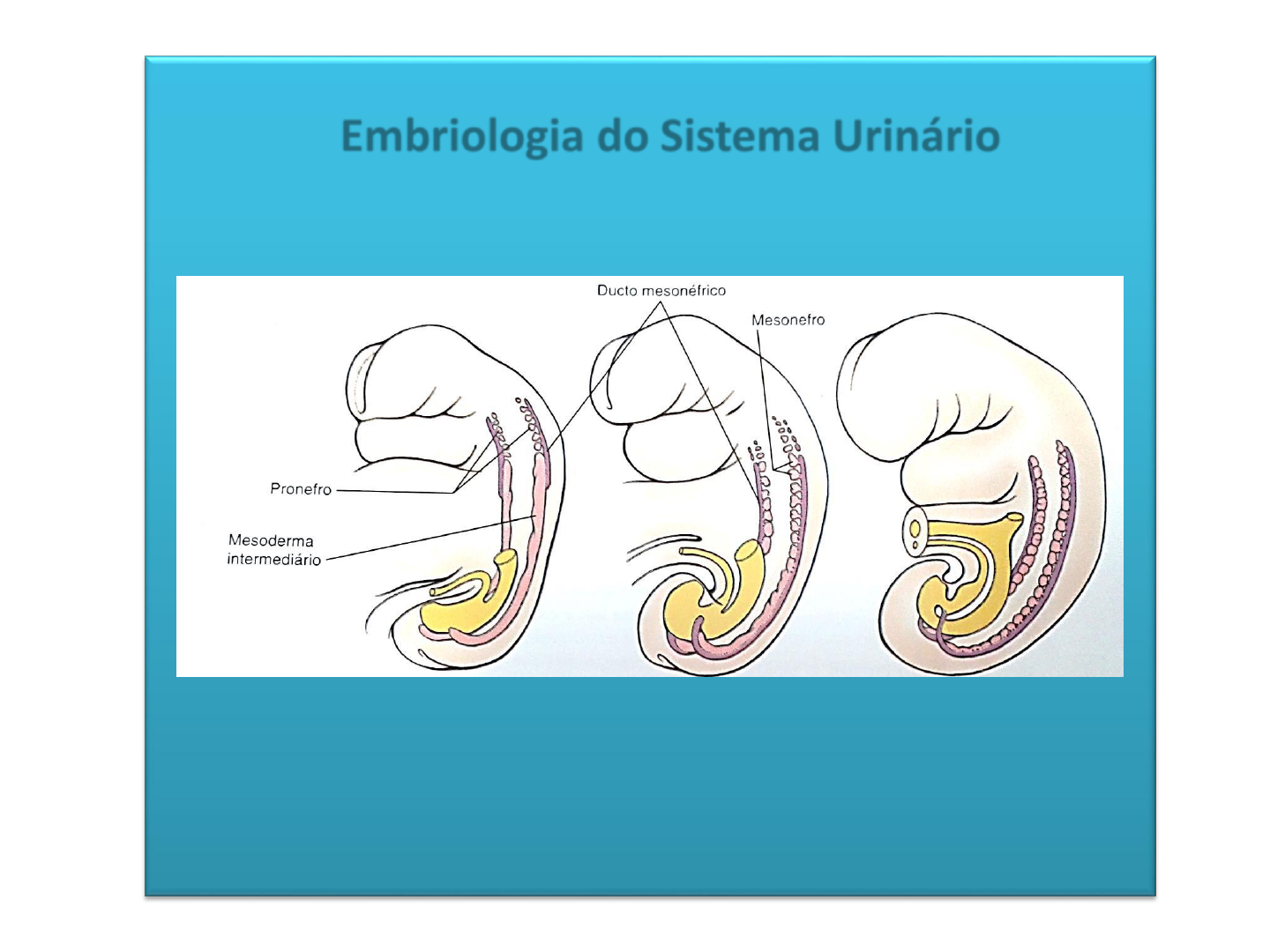 Embriologia do Sistema Urinário Embriologia do Sistema Urinário 1) Origem embrionária das estruturas do sistema urinário 2) Desenvolvimento do Sistema Urinário: pronefro, mesonefro e metanefro 3) Posicionamento dos rins verdadeiros 4) Formação da bexiga e uretra 1) Origem embrionária das estruturas do sistema urinário O sistema urinário tem origem mesodérmica e endodérmica 1) Origem embrionária das estruturas do sistema urinário : mesoderma intermedíário 4a semana 3a semana 4a semana Cordão nefrogênico Crista urogenital 4-5a semana O mesoderma intermediário: Se organiza formando um par de cordões nefrogênicos no inicio da 4a semana (embrião ainda se fechando) para originar o sistema renal primitivo. Cordão nefrogênico Desenvolvimento inicial 2) Desenvolvimento do Sistema Urinário: pronefro, mesonefro e metanefro -da 4a até 9a semana: os cordões nefrogênicos formam os rins primitivos Pronefro Mesonefro Metanefro Ducto pronéfrico em degeneração Pronefro Túbulos mesonéfricos Cordão nefrogênico Ducto mesonéfrico Divertículo metanéfrico ou broto uretérico Alantóide -O pronefro (rins cervicais) aparece no início da 4a semana e se degenera; -O mesonefro (rins torácicos, abdominais e lombares) aparece ao fim da 4a semana e funciona até que os rins permanentes se formem. Degenera ao final do 1o trimestre; -O metanefro é o primórdio dos rins permanentes e começa a se formar no início da 5a semana . 4a semana Os rins permanentes se formam a partir de 2 fontes: -divertículo metanéfrico: brotamento a partir do ducto mesonéfrico caudal -massa metanéfrica de mesoderma: células de mesoderma adjacente Divertrículo metanéfrico Massa metanéfrica de mesoderma Primórdio dos rins permanentes Cordão nefrogênico Ducto mesonéfrico Mesonefro Pronefro em degeneração 5a semana Desenvolvimento dos rins permanentes 5a semana Divertículo metanéfrico Massa metanéfrica de mesoderma (mesenquima) Primórdio dos rins permanentes Ducto mesonéfrico Massa metanéfrica de mesoderma Divertículo metanéfrico Pedículo do divertículo metanéfrico Pelve renal Cálice maior Cálice menor Sulcos entre os lobos Pelve renal Massa metanéfrica de mesoderma Ducto coletor retoDucto coletor arqueado Origem do uretér, pelve renal, cálices e ductos coletores. Desenvolvimento dos Néfrons: unidade funcional dos rins Ducto coletor reto Ducto coletor arqueado Ducto coletor reto Ducto coletor arqueado Massa metanéfrica de mesoderma Vesículas metanéfricas Vesículas metanéfricas Túbulo coletor arqueado Alça de Henle em formação Túbulo coletor reto Túbulo contorcido distal Túbulo contorcido proximal Ramos descendentes e ascendentes da alça de Henle Glomérulo Cápsula glomerular Túbulo coletor arqueado Ramo da artéria renal -O divertículo metanéfrico se ramifica até a 32a semana, produzindo de 1 a 3 milhões de ductos coletores (retos e arqueados), que entram cada vez mais em contato com a massa metanéfrica de mesoderma. -Este contato faz com que esse último tecido comece a formar as vesículas metanéfricas que se desenvolvem em túbulos contorcidos, conectando-se aos ductos coletores. -Estes novos túbulos, crescem, se espiralam, e entram em contato com ramos vasculares (artéria renal). Túbulos contorcidos Desenvolvimento do sistema coletor do rim e néfrons Capuz de massa metanéfrica de mesoderma Genes envolvidos com a diferenciação Renal -Wnt1 é expresso pelo mesoderma adjacente: permite que este responda aos estímulos do Diverticulo metanéfrico. -GDNF e HGF secretados por esse mesoderma adjacente: induz o divertículo metanefrico a secretar BMP7 e FGF2 que agem de volta neste mesoderma adjacente, que prolifera. -Num segundo momento, o divertículo metanefrico passa a secretar Wnt4 e expressa Pax2 que induz o mesoderma adjacente a se diferenciar em estruturas vesiculares, que vai ser essencial para formação dos ductos coletores renais Especificação molecular do divertículo metanéfrico A estruturação anatômica e tecidual renal definitiva do metanefro (rins verdadeiros) já é visível por volta da 10a semana, entretanto ainda se forma até o final do período gestacional A partir do divertículo metanéfrico: região coletora, cálices, pelve e ureter A partir da massa metanéfrica de mesoderma: região medular e córtex renal (néfrons) 3) Deslocamento dos rins verdadeiros -Cedo no desenvolvimento os rins primitivos estão próximos um do outro na pelve; -Conforme o abdomen e a parte caudal do embrião crescem, os rins se afastam um do outro e assumem posições mais craniais (sobem). A partir da 6a semana; -Conforme os rins sobem eles fazem uma rotação medial de 90 graus: hilo renal de anterior fica medial; -Após a 10a semana os rins já são órgãos retroperitoneais: aderidos à parede abdominal posterior. Ascenção normal e anormal dos rins 4) Formação da bexiga e uretra -Origem endodérmica A cloaca (parte mais caudal do intestino primitivo) é dividida em 2 regiões -seio urogenital -reto cloaca Septo urorretal Intestino posterior Intestino médio alantóide Septo urorretal membrana cloacal Reto Seio urogenital membrana urogenital Seio urogenital proctodeu Septo urorretal Reto e canal anal O seio urogenital apresenta 3 partes: -parte vesical: forma a maior parte da bexiga -parte pélvica: conexão com os uretéres no colo da bexiga -parte fálica: forma os primórdios a uretra 5a semana O sistema urinário tem origem mesodérmica e endodérmica