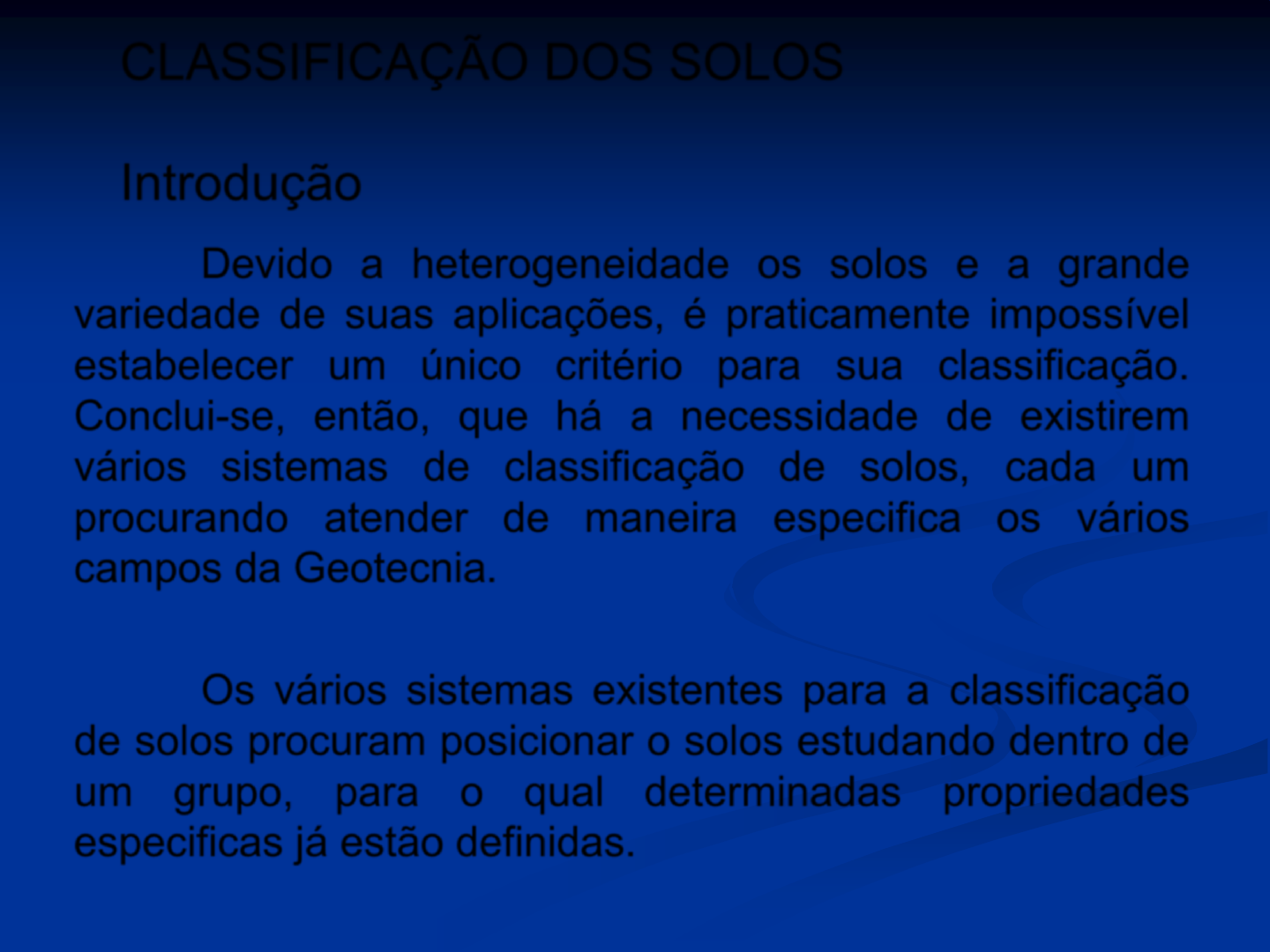 CLASSIFICAÇÃO DOS SOLOS Introdução Devido a heterogeneidade os solos e a grande variedade de suas aplicações, é praticamente impossível estabelecer um único critério para sua classificação. Conclui-se, então, que há a necessidade de existirem vários sistemas de classificação de solos, cada um procurando atender de maneira especifica os vários campos da Geotecnia. Os vários sistemas existentes para a classificação de solos procuram posicionar o solos estudando dentro de um grupo, para o qual determinadas propriedades especificas já estão definidas. Um sistema de classificação dos solos deve obedecer aos seguintes requisitos: a) ser simples, facilmente memorizável e permitir uma rápida determinação do grupo a que o solo pertence, permitindo a classificação por meio de processos simples de análise visual - táctil; b) ser flexível, para tornar-se geral ou particular, quando o caso exigir; c)ser capaz de permitir uma expansão posterior, permitindo subdivisões. Entre os vários sistemas de classificação existentes, temos: - Classificação por tipo de solo; - Classificação Genética Geral; - Classificação Granulométrica; - Classificação Unificada; (U.S. Corps of Engineers); e - Classificação HRB (Highway Research Board)visões. Classificação por Tipo de Solo É um sistema de classificação descritivo em que o reconhecimento a que determinado grupo pertence é baseado em análise visual – táctil. Baseado em tipos de solos: - areias e solos arenosos; - areias finas, siltes, areias siltosos ou pouco argilosos; - argilas e solos argilosos; e - turfas e solos turfosos orgánicos. Classificação Genética Geral É um sistema de classificação também de maneira descritiva, sendo necessário para a sua utilização, um conhecimento da gênese dos solos, ou de uma forma que seja mais simples, fazer uma análise da sua macro estrutura, da cor e da posição de coleta da amostra no perfil do subsolo. Divide o solo em 3 categorias: a) SOLO SUPERFICIAL - Solo que constitui o horizonte superficial normalmente contendo matéria orgánica. Nesse horizonte concentra-se o campo de estudo da pedologia. Possui estrutura, cor e constituição mineralógica diferentes das camadas inferiores. A espessura varia de alguns centímetros a metros. b) SOLO DE ALTERAÇÃO - Solo proveniente de decomposição das rochas graças aos processos de intemperismo. Em condições normais, acha-se subjacente ao solo superficial. É um solo residual e pode atingir até dezenas de metros. São solos de granulometria crescente com a profundidade. c) SOLOS TRANSPORTADO - Solo originado do transporte e deposição de material. A granulometria é mais ou menos uniforme de acordo com o agente transportador. Em condições normais pode constituir as camadas aflorantes ou estar subjacente ao solo superficial. Classificação Granulométrica Uma das maneiras de se classificar um solo é através da sua curva de distribuição granulométrica. Essa distribuição é representada por uma curva que indica, para cada "diâmetro" de grão, qual é a sua porcentagem do solo que possui grãos menores ou maiores. A curva de distribuição granulométrica é apresentada em gráfico semi - logarítmico, onde nas abscissas, contam os logaritmos dos tamanhos das partículas e, nas ordenadas, a porcentagem acumulada do solo que têm seus grãos menores do que um dado diâmetro. Classificação Granulométrica ◼ Curva A – solo bem graduado (granulação contínua) ◼ Curva B – solo de graduação aberta ◼ Curva C – solo de granulação uniforme Da curva granulométrica podemos obter os seguintes parâmetros: Peneiras Classificação Granulométrica Jogos de Peneiras PoI. mm N° mm 3" 76.2 04 4.8 2" 50.8 08 2.4 1 1/2" 38.1 10 2.0 1” 25.4 16 1.2 3/4" 19.1 30 0.6 3/8" 9.5 40 042 1/4 6.4 50 0.30 80 0.18 100 0.15 200 0.074 Abaixo desta medida as peneiras são colocados no vibrador onde serão deixadas por 10 minutos. Granulometria por Sedimentação Para os solos finos, siltes e argilas, com partículas menores que 0,074mm (#200), o cálculo dos diâmetros equivalentes será feito a partir dos resultados obtidos durante a sedimentação de certa quantidade de sólidos em um meio líquido. A base teórica para o cálculo do diâmetro equivalente vem da lei de Stokes, que afirma que a velocidade de queda de uma partícula esférica, de peso específico conhecido, em um meio líquido rapidamente atinge um valor constante que é proporcional ao quadrado do diâmetro da partícula. O estabelecimento da função, velocidade de queda - diâmetro de partícula, se faz a partir do equilíbrio das forças atuantes (força peso) e resistentes (resistência viscosa) sobre a esfera, resultando: ◼ A equação anterior foi obtida para o caso de uma esfera de peso específico bem definido caindo em um meio liquido indefinido, e certamente estas não são as condições existentes no ensaio de sedimentação. As partículas não são esféricas e o número delas é grande, o peso específico dos sólidos não é único e o espaço utilizado é limitado, podendo ocorrer influência das paredes do recipiente, bem como de uma partícula sobre as outras. Ensaio de granulometria por sedimentação 1- Adiciona-se a amostra de solo, cerca de 50g de solo (para arenoso 100g), que passa na peneira 0.074 mm, um defloculante, 125 ml de hexametafosfato de sódio (concentração de 45.79 do sal por litro de solução), agitando-se até que todo o material fique perfeitamente molhado, e deixa-se em repouso no mínimo 12 horas. 2- Leva-se essa solução a um dispersor por 5 minutos. 3- Terminada essa operação verte-se toda a solução em uma proveta graduada para 1.000 cm³. 4- Leva-se a proveta para um banho com temperatura constante, até atingir a constância de temperatura entre o banho e a proveta. Para acelerar podemos mexer com uma baqueta. 5- Após o equilíbrio retiramos a proveta e tampando-se a sua com a mão,