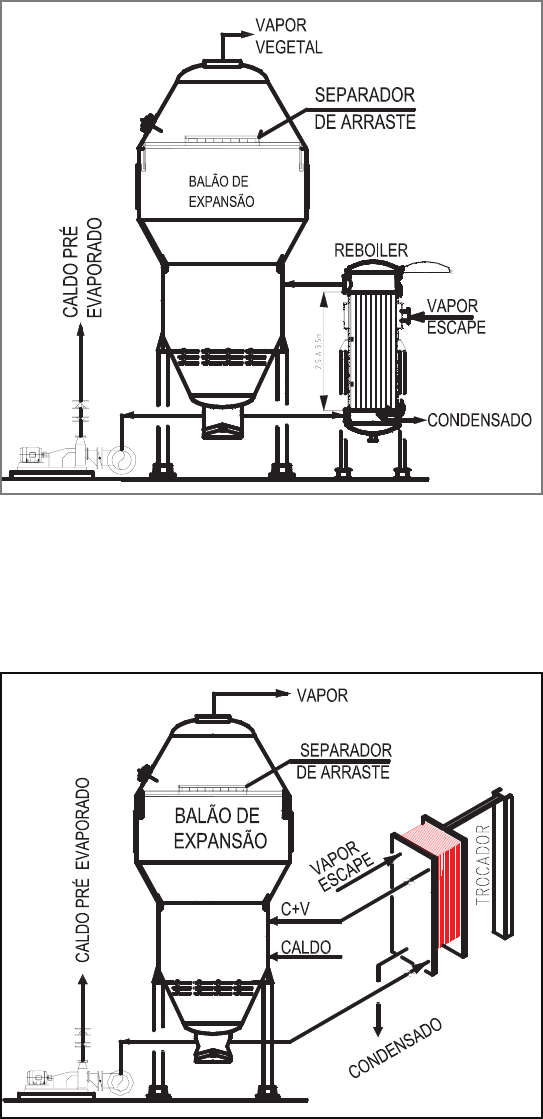 61 Figura 5.3 - Pré-aquecedor de caldo com reboiler. Figura 5.4 - Pré-aquecedor de placas 62 Limite superior e inferior da temperatura na evaporação: • Temperatura crítica: o açúcar do caldo se carameliza, provocando perda de sacarose e uma coloração que subsiste até nos cristais de açúcar. Para caldos de cana, alguns técnicos recomendam uma temperatura máxima do vapor na calandra entre 127 e 130ºC, o que corresponde a uma temperatura de cerca de 125ºC no caldo. • O vapor de aquecimento entra na calandra do 1º efeito numa temperatura entre 125ºC (1,3 kgf/cm2) a 130ºC (1,7 kgf/cm2). • O limite inferior da temperatura em que funciona um múltiplo-efeito é a temperatura de ebulição correspondente ao vácuo existente no último corpo. Um vácuo de 64 cm de Hg (25,2 in de Hg, 55ºC) são os parâmetros indicados para o último efeito, mas existem algumas oscilações nestes valores. Assim a evaporação acontece numa faixa de temperatura de 125 a 55ºC. Na indústria açucareira os múltiplos efeitos são formados de 3, 4 ou 5 corpos, sendo denominados tríplice, quádruplos ou quíntuplos efeitos, respectivamente. Todos os evaporadores (corpos) são iguais em forma, constituição, capacidade, mas podem ter alturas dos tubos decrescente do primeiro ao último corpo. Os evaporadores constam de: calandra, situada no fundo do evaporador e é constituído de duas placas perfuradas (Figura 5.5), uma superior e uma inferior denominadas espelhos, os quais são interligados pelos tubos. Existe na calandra um tubo central de diâmetro maior que os tubos periféricos. Desta maneira, durante a evaporação existem duas correntes de circulação de caldo, uma ascendente nos tubos periféricos e da periferia para o centro e uma segunda descendente pelo tubo central. As águas condensadas depositam-se sobre o espelho inferior e devem ser retiradas da calandras. A partir do 2º corpo há formação de gases incondensáveis, os quais se acumulam sob o espelho superior, formando zonas inativas, dificultando a transferência de calor do vapor em condensação para os tubos. Tais gases devem ser removidos (Figura 5.6) através de tubos, às vezes denominados tubos amoniacais. Figura 5.5 – Espelho Superior da Calandra 63 Figura 5.6 – Retira dos Gases Incondensáveis Tubos de evaporadores Roberts Material de construção: aço carbono, latão ou aço inox. Comprimento: 1,60 a 4,5 m. Os tubos são mandrilados nos espelhos e desgastam-se principalmente nas extremidades, próximo aos espelhos. Para substituição de tubos, aqueles retirados dos primeiros evaporadores são utilizados nos posteriores, pois em geral estes são menores. Diâmetro interno: 27 a 46 mm; Espessura: 1,0 a 2,65 mm. É importante adotar, para a usina toda, um diâmetro padrão para tubos e empregá-lo tanto nos aquecedores, como nos múltiplos efeitos. Quanto mais estreitos são os tubos, mais facilitam a subida do caldo, porque esta subida depende da proporção entre a superfície de aquecimento do tubo e sua seção interna. Disposição dos tubos nos evaporadores Os tubos são dispostos em quincôncio nos espelhos dos evaporadores. Esta disposição permite colocar um número maior de tubos por unidade de superfície dos espelhos, com uma mesma distância entre os tubos. Os tubos são alinhados segundo três direções diferentes a 120º (ou os centros de três tubos vizinhos formam um triângulo eqüilátero). 64 O vapor entra na calandra por uma, duas ou mais entradas: Altura de tubo< 3 m, uma entrada de vapor; Altura de tubo >3 m, duas entradas de vapor; Altura de tubo >>3 m, quatro entradas. Como exemplo de um quádruplo efeito sem pré-evaporador, tem-se: 1º Efeito: Pressão na calandra: 1,63 kgf/cm2 Temperatura na calandra: 114 ºC Pressão na câmara de gases: 1,24 kgf/cm2 Temperatura na câmara de gases: 106 ºC Brix de entrada: 16; Brix de saida: 19,3 2º Efeito: Pressão na calandra: 1,24 kgf/cm2 Temperatura na calandra: 106 ºC Vácuo na câmara de gases: 10,16 cm Hg Temperatura na câmara de gases: 96 ºC Brix de entrada: 19,3; Brix de saida: 25 3º Efeito: Vácuo na calandra: 10,16 cm Hg Temperatura na calandra: 86 ºC Vácuo na câmara de gases: 38,5 cm Hg Temperatura na câmara de gases: 80,5ºC Brix de entrada: 25; Brix de saída: 36,5 4º Efeito: Vácuo na calandra: 38,5 cm Hg Temperatura na calandra: 80,5 ºC Vácuo na câmara de gases: 66 cm Hg Temperatura na câmara de gases: 52ºC. Brix de entrada: 36,5; Brix de saida: 60 5.1.1 - Causas de Operação Deficiente • Temperatura baixa caldo clarificado alimentando os prés (<105 ºC); • Tubos incrustados, furados ou soltos; • Remoção de condensados deficiente; • Remoção de gases incondensáveis deficiente; • Tubos operando com nível incorreto de caldo; • Baixo vácuo no último efeito; • Baixa pressão do vapor de escape das turbinas; • Partidas e paradas freqüentes; • Variações na vazão de caldo; • Vazão de caldo acima do projetado (embebição elevada na moagem, moagem elevada). 65 5.1.2 – Conseqüências das Falhas na Evaporação • Redução na extração das moendas; • Redução na produção; • Perdas de álcool na vinhaça; • Geração de energia reduzida (Falta bagaço); • Água desmineralizada insuficiente, devido à falta de condensado de escape. • Filtro rotativo com perdas na torta devido volume baixo de água para embebição. 5.1.3 – Fatores que influenciam na eficiência dos pré e evaporadores 1. Incrustação A formação de incrustações nos evaporadores, aquelas pertinentes à parte interna dos tubos, se deve, principalmente a uma crescente redução de água no caldo em concentração, redução esta que permite aos não-açúcares atingirem, com mais intensidade, nos últimos vasos, a condição de supersaturação e precipitarem. Entretanto não só o efeito da concentração, mas também o efeito da temperatura pode provocar precipitações de alguns sais. Concorrem para