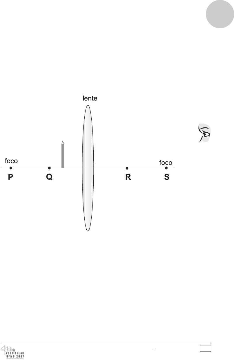 1PROVA DE FÍSICA - 1a Etapa - Caderno 1 1 PROVA DE FÍSICA QUESTÃO 01 Tânia observa um lápis com o auxílio de uma lente, como representado nesta figura: Essa lente é mais fina nas bordas que no meio e a posição de cada um de seus focos está indicada na figura. Considerando-se essas informações, é CORRETO afirmar que o ponto que melhor representa a posição da imagem vista por Tânia é o A) P . B) Q . C) R . D) S . PROVA DE FÍSICA - 1a Etapa - Caderno 12 QUESTÃO 02 Dois barcos – I e II – movem-se, em um lago, com velocidade constante, de mesmo módulo, como representado nesta figura: Em relação à água, a direção do movimento do barco I é perpendicular à do barco II e as linhas tracejadas indicam o sentido do deslocamento dos barcos. Considerando-se essas informações, é CORRETO afirmar que a velocidade do barco II, medida por uma pessoa que está no barco I, é mais bem representada pelo vetor A) P . B) Q . C) R . D) S . 3PROVA DE FÍSICA - 1a Etapa - Caderno 1 1 QUESTÃO 03 Um ímã e um bloco de ferro são mantidos fixos numa superfície horizontal, como mostrado nesta figura: Em determinado instante, ambos são soltos e movimentam-se um em direção ao outro, devido à força de atração magnética. Despreze qualquer tipo de atrito e considere que a massa m do ímã é igual à metade da massa do bloco de ferro. Sejam ai o módulo da aceleração e Fi o módulo da resultante das forças sobre o ímã. Para o bloco de ferro, essas grandezas são, respectivamente, a f e Ff . Com base nessas informações, é CORRETO afirmar que A) Fi = Ff e ai = a f . B) Fi = Ff e ai = 2a f . C) Fi = 2Ff e ai = 2a f . D) Fi = 2Ff e ai = a f . PROVA DE FÍSICA - 1a Etapa - Caderno 14 QUESTÃO 04 Antônio precisa elevar um bloco até uma altura h. Para isso, ele dispõe de uma roldana e de uma corda e imagina duas maneiras para realizar a tarefa, como mostrado nestas figuras: Despreze a massa da corda e a da roldana e considere que o bloco se move com velocidade constante. Sejam FI o módulo da força necessária para elevar o bloco e TI o trabalho realizado por essa força na situação mostrada na Figura I. Na situação mostrada na Figura II, essas grandezas são, respectivamente, FII e TII . Com base nessas informações, é CORRETO afirmar que A) 2FI = FII e TI = TII . B) FI = 2FII e TI = TII . C) 2FI = FII e 2TI = TII . D) FI = 2FII e TI = 2TII . 5PROVA DE FÍSICA - 1a Etapa - Caderno 1 1 QUESTÃO 05 Nos diodos emissores de luz, conhecidos como LEDs, a emissão de luz ocorre quando elétrons passam de um nível de maior energia para um outro de menor energia. Dois tipos comuns de LEDs são o que emite luz vermelha e o que emite luz verde. Sabe-se que a freqüência da luz vermelha é menor que a da luz verde. Sejam λverde o comprimento de onda da luz emitida pelo LED verde e Everde a diferença de energia entre os níveis desse mesmo LED. Para o LED vermelho, essas grandezas são, respectivamente, λvermelho e Evermelho . Considerando-se essas informações, é CORRETO afirmar que A) Everde > Evermelho e λverde > λvermelho . B) Everde > Evermelho e λverde < λvermelho . C) Everde < Evermelho e λverde > λvermelho . D) Everde < Evermelho e λverde < λvermelho . PROVA DE FÍSICA - 1a Etapa - Caderno 16 QUESTÃO 06 Um reservatório de água é constituído de duas partes cilíndricas, interligadas, como mostrado nesta figura: A área da seção reta do cilindro inferior é maior que a do cilindro superior. Inicialmente, esse reservatório está vazio. Em certo instante, começa-se a enchê-lo com água, mantendo-se uma vazão constante. Assinale a alternativa cujo gráfico melhor representa a pressão, no fundo do reservatório, em função do tempo, desde o instante em que se começa a enchê-lo até o instante em que ele começa a transbordar. A) B) C) D) 7PROVA DE FÍSICA - 1a Etapa - Caderno 1 1 QUESTÃO 07 Três satélites – I, II e III – movem-se em órbitas circulares ao redor da Terra. O satélite I tem massa m e os satélites II e III têm, cada um, massa 2m . Os satélites I e II estão em uma mesma órbita de raio r e o raio da órbita do satélite III é 2 r . Nesta figura (fora de escala), está representada a posição de cada um desses três satélites: Sejam FI , FII e FIII os módulos das forças gravitacionais da Terra sobre, respectivamente, os satélites I, II e III . Considerando-se essas informações, é CORRETO afirmar que A) FI = FII < FIII . B) FI = FII > FIII . C) FI < FII < FIII . D) FI < FII = FIII . PROVA DE FÍSICA - 1a Etapa - Caderno 18 QUESTÃO 08 Uma caminhonete move-se, com aceleração constante, ao longo de uma estrada plana e reta, como representado nesta figura: A seta indica o sentido da velocidade e o da aceleração dessa caminhonete. Ao passar pelo ponto P, indicado na figura, um passageiro, na carroceria do veículo, lança uma bola para cima, verticalmente em relação a ele. Despreze a resistência do ar. Considere que, nas alternativas abaixo, a caminhonete está representada em dois instantes consecutivos. Assinale a alternativa em que está mais bem representada a trajetória da bola vista por uma pessoa, parada, no acostamento da estrada. A) B) C) D) 9PROVA DE FÍSICA - 1a Etapa - Caderno 1 1 QUESTÃO 09 Numa aula de Física, o Professor Carlos Heitor apresenta a seus alunos esta experiência: dois blocos – um de alumínio e outro de ferro –, de mesma massa e, inicialmente, à temperatura ambiente, recebem a mesma quantidade de calor, em determinado processo de aquecimento. O calor específico do alumínio e o do ferro são, respectivamente, 0,90 J / (g oC) e 0,46 J / (g oC). Questionados quanto ao que ocorreria em seguida, dois dos alunos, Alexandre e Lorena, fazem, cada um deles, um comentário: • Alexandre: “Ao final desse processo de aquecimento, os blocos estarão à mesma temperatura.” • Lorena: “Após esse processo de aquecimento, ao se colocarem os dois blocos em contato, fluirá calor do bl
