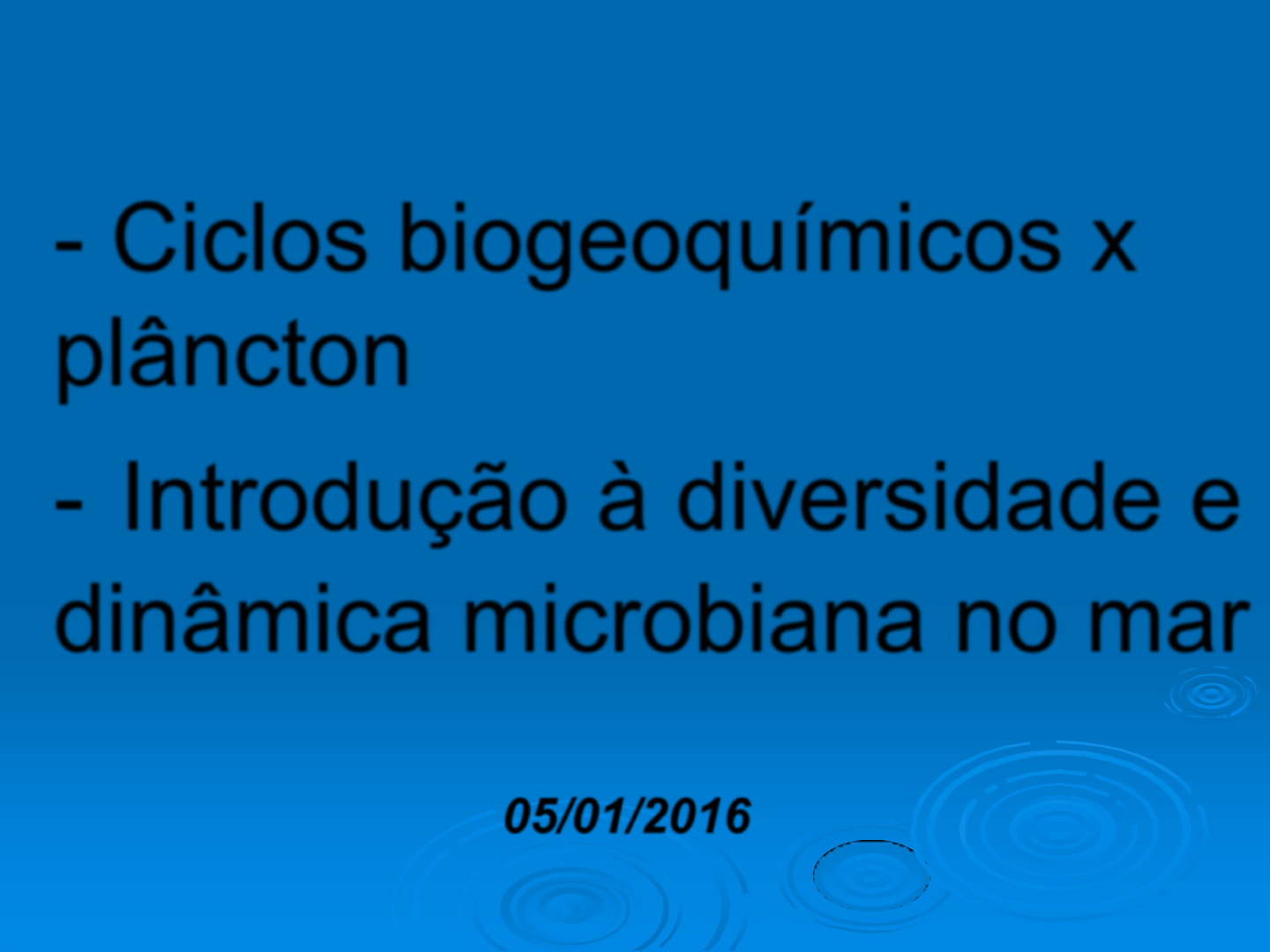 * - Ciclos biogeoquímicos x plâncton - Introdução à diversidade e dinâmica microbiana no mar 05/01/2016 * Ciclos biogeoquímicos x plâncton marinho * Ciclos biogeoquímicos Os ciclos biogeoquímicos descrevem o movimento de elementos químicos (ou moléculas simples) através dos compartimentos gigantescos que constituem a Terra: litosfera, hidrosfera, atmosfera e biosfera Seres vivos contêm uma pequena fração do suprimento total de elementos existentes na Terra, mas exercem grande influência sobre os movimentos de vários de seus elementos constituintes pela natureza Os ciclos biogeoquímicos podem ser entendidos como sistemas fechados de grandes dimensões, baseados nas trocas entre os componentes que fazem parte deles, uma vez que a entrada de novos montantes de elementos químicos é virtualmente nula Representação do ciclo hidrológico. Adaptado de GSFC/NASA (2007). * Ciclos biogeoquímicos Nas porções mais rasas dos oceanos tropicais e temperados, átomos e moléculas circulam nos corpos de organismos diversos, sofrendo ciclagem através da ação de predadores, presas, comedores de cadáveres e decompositores Os processos são acelerados e intensificados pela ação da camada superficial de mistura, que afeta fortemente a distribuição dos organismos (sobretudo os planctônicos) e os recursos disponíveis Apesar da atividade biológica intensa, pequenas frações de matéria (ex.: cadáveres de diversos portes, fragmentos de corpos, pelotas fecais etc.) escapam das teias tróficas de águas rasas e tendem a afundar Representação esquemática do caráter cíclico de circulação de constituintes elementares e do fluxo de energia pelas cadeias alimentares em ecossistemas marinhos. Não estão representados os componentes que formam a chamada alça microbiana nem a presença de matéria orgânica dissolvida na água do mar. Adaptado de Lalli & Parsons (1997). * Ciclos biogeoquímicos Se tais porções de matéria orgânica atravessarem a termoclina, elas tornam-se ainda mais isoladas da atividade biológica intensa da superfície Abaixo da termoclina, diminuem as chances de que um dado fragmento pequeno de matéria orgânica seja levado de volta a águas rasas, pois a biomassa e a densidade de organismos vivos são menores e as teias tróficas são mais simples, com menos componentes O plâncton tem um papel crucial na configuração de todos os processo que envolvem a circulação da matéria e o fluxo de energia pelo mar * Ciclo do carbono Por muito tempo, o ciclo do carbono era considerado pouco relevante no mar, onde o elemento nunca é limitante. O panorama começou a mudar há quatro décadas, quando a preocupação com a poluição marinha ganhou relevância. A importância atribuída ao ciclo do carbono aumentou ainda mais com o conhecimento sobre o aqueciomento global e, mais recentemente, com o reconhecimento da acidificação dos oceanos. O Painel Intergovernamental sobre Mudança Climática IPCC) tem contribuído para colocar mais foco no ciclo do carbono. Na imagem ao lado, um sumário do 5º. Relatório do IPCC, divulgado no final de setembro de 2013. * Ciclo do carbono O maior de todos os ciclos biogeoquímicos é o do carbono A rigor, o maior reservatório de carbono ocorre em rochas e sedimentos da litosfera (calcário, dolomita, mármore, giz etc.), da ordem de pelo menos 7 x 106 Gt, mas estes são indisponíveis para a grande maioria dos organismos Para fins práticos, considera-se que os oceanos se constituiriam no maior reservatório de carbono, pois neles ocorrem formas efetivamente disponíveis aos organismos Representação do ciclo biogeoquímico do carbono. Os números indicam os volumes envolvidos em cada compartimento, em gigatoneladas. Adaptado de UNEP (2006) * Ciclo do carbono A atmosfera, os oceanos, a biosfera e as rochas/sedimentos são os quatro reservatórios/compartimentos fundamentais do ciclo do carbono No mar, o sistema CO32- – HCO3- – H2CO3 (carbonato – bicarbonato – ácido carbônico) envolve uma massa de 40.000 Gt de carbono A forma de CO2 na atmosfera corresponde a uma fração bem menor, de apenas 750 Gt, os solos compreendem 2.000 Gt e as reservas de combustíveis fósseis totalizam 4.000 Gt O carbono entra na atmosfera através da respiração de organismos vivos (como CO2), de erupções vulcânicas que liberam carbono de rochas profundas da crosta terrestre, de decomposição de matéria viva por bactérias e fungos (gerando CO2 em presença de oxigênio e CH4 na ausência do gás), de reações químicas envolvendo minerais ricos em carbonato, além de outros processos menores * O plâncton envolve os principais componentes que formam a chamada bomba biológica. Conceitualmente, a bomba biológica (biological pump) é uma expressão que engloba todos os processos realizados nos oceanos e que, mediados direta ou indiretamente por seres vivos, levam ao transporte de carbono zona eufótica para águas profundas. * Ciclo do carbono O volume de carbono na atmosfera corresponde a apenas cerca de 0,04% dos gases presentes, mas atualmente há consenso de que estes níveis estão aumentando devido à ação antrópica. O homem vem proporcionando a entrada de CO2 na atmosfera principalmente por meio da queima de combustíveis fósseis, de atividades industriais e de queimadas de florestas O fitoplâncton tem uma capacidade limitada para absorver o excesso de carbono atmosférico que entra no mar Variações das concentrações de CO2 atmosférico, em gigatoneladas, de 1870 a 2000. As medidas mais antigas, anteriores a 1930, podem ser estimadas através da análise de gases aprisionados em gelo de ambientes polares. As medidas mais recentes são tomadas diretamente da atmosfera. Adaptado de UNEP (2006). * Dados de Mauna Loa Série temporal de medidas de CO2 em Mauna Loa, Havaí, EUA (em partes por milhão por volume, ppmv; vermelho), pressão parcial do CO2 (pCO2) nas águas superficiais do oceano (expresso em microatmos