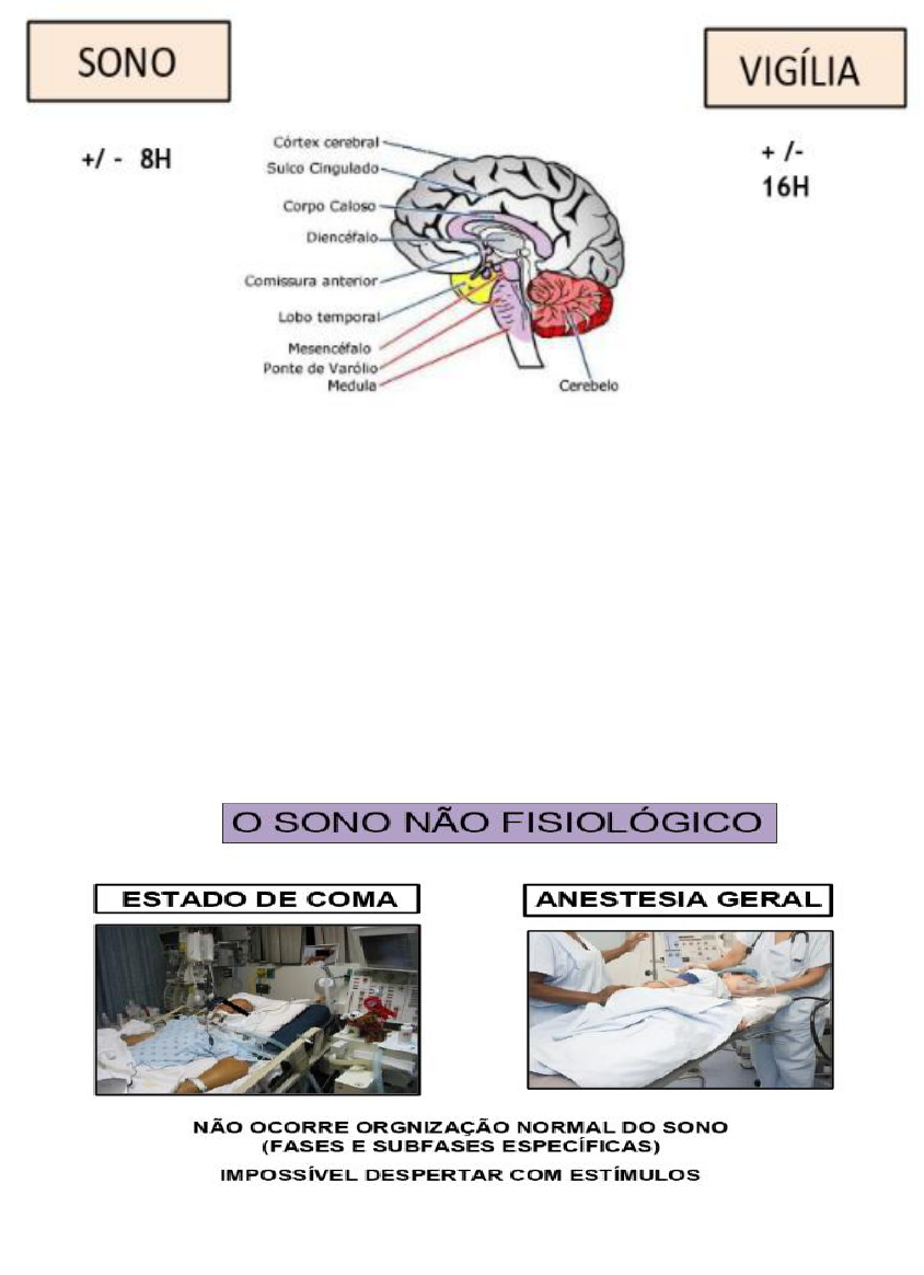 Fisiologia do Sono Sono Vigília ALTERNÂNCIA CIRCADIANA – CICLA EM 24 HORAS – DIA E NOITE TERRESTRES Conceito Sono Fisiológico . Estado de consciência onde há aumento de excitabilidade cortical e importante redução de interações como meio externo. . Facilmente revertido por estímulos. . Obedece a uma arquitetura organizacional do sistema nervoso. X O núcleo supraquiasmático (por vezes abreviado NSQ) é um centro primário de regulação dos ritmos circadianos mediante a estimulação da secreção de melatonina pela glândula pineal. O núcleo supraquiasmático recebe informação da luz do meio ambiente através dos olhos,ao passo que a retina contém não apenas fotorreceptores típicos, que nos permitem distinguir formas e cores, mas também células ganglionares com um pigmento chamado melanopsina. Através do trato retinohipotalámico, a melanopsina leva informação ao núcleo supraquiasmático. Este, por sua vez, recebe a informação sobre a luminosidade externa, a interpreta e a envia ao gânglio cervical superior, o qual redireciona o sinal para a glândula pineal. Em resposta ao estímulo, essa glândula secreta o hormônio melatonina, cujos níveis são baixos durante o dia e aumentam à noite. Sendo que os sonhos são demonstrativos da atividade proporcionada pela glândula pineal em sua função receptiva de impulsos eletromagnéticos mais aguçados durante o período noturno. Relógio Biológico X Pessoas com narcolepsia tem problemas nos receptores de orexina, não produzem acetilcolina (ataques repentinos no sono). Bloqueando a orexina inibe a produção de acetilcolina, consequentemente estimulando o sono. X NEURÔNIOS COLINÉRGICOS E HISTAMINÉRGICOS NO ESTADO DE VIGÍLIA SISTEMA MONOAMINÉRGICO ATIVADOR ASCENDENTE Exemplos de modulção da vigília . Cocaína - A ELEVAÇÃO DAS MONOAMINAS NA FENDA SINÁPTICA REDUZ O SONO E AUMENTA A VIGÍLIA – Impede a dopamina de ser recaptada, ficando com alta concentração na fenda sináptica . Melatonina - REDUZ A VIGÍLIA E INDUZ AO SONO - AGONISTAS DE RECEPTORES MELATONINERGICOS (MTs) SÃO USADOS PARA O TRATAMENTO DA INSÔNIA: RAMELTEON, AGOMELATINA . Anti-histamínicos - BLOQUEIAM RECEPTORES H1 DA HISTAMINA NO SNC – SONOLÊNCIA ALMOREXANT - BLOQUEIA OS RECEPTORES DA OREXINA (HIPOCRETINAS) FACILITA O DESENCADEAMENTO DO SONO EEG – Eletroencefalograma dessincronizado ONDAS ALFA E BETA - ATIVAÇÃO "DESORGANIZADA" DOS NEURÔNIOS DO CÓRTEX CEREBRAL CARACTERÍSTICAS SONO N-REM - EEG de ondas delta: baixa frequência e “sincronizadas” X Onda delta é fruto de uma atividade menor de neurônios. X Precisa-se de uma fase mais profunda para chegar no sono REM. X Sono paradoxal – atividade cerebral é alta, porém, a onda é beta. CARACTERÍSTICAS SONO N-REM . Responsável por descanso e reparação do organismo. . Aumento da atividade parassimpática. . Miose/Redução da Pressão Arterial/Bradicardia. . Redução ventilação pulmonar. . Aumento secreção Hormônio Crescimento e Prolactina. CARACTERÍSTICAS SONO REM . EEG de ritmo beta. . Movimento rápido dos olhos (REM). . Aumento da atividade simpática. . Taquicardia – aumento da PA. . Taquipnéia. . Relaxamento muscular intenso. . Abalos musculares bruscos. . Ereção peniana. . Sonhos. CAMINHO ENTRE VIGÍLIA E SONO . DA VIGÍLIA PASSAMOS OBRIGATORIAMENTE AO SONO DE ONDA LENTA . DA VIGÍLIA NÃO SE ENTRA DIRETO NO SONO REM . PODEMOS ACORDAR DE QUALQUER FASE DO SONO, INCLUSIVE DO SONO REM Como começamos a dormir? Adenosina - DURANTE A VIGÍLIA HÁ AUMENTO GRADATIVO DE ADENOSINA EXTRACELULAR - POSSUI AÇÃO HIPERPOLARIZANT E EM NEURÔNIOS COLINÉRGICOS . Neurônios colinérgicos do prosencéfalo basal responsáveis pelo estado de vigília do prosencéfalo basal já foram demonstrados sensíveis à ação inibitória da adenosina. PAPEL DA CAFEÍNA NA INSÔNIA CAFEÍNA POSSUI AÇÃO IMPEDINDO EFEITOS DA ADENOSINA X Adenosina diminui a vigília e dá o gatilho para o sono. Cafeína inibe a adenosina. Indução sináptica do sono - Interação de GABA com o receptor GABA-A promovendo abertura do canal de cloro e hiperpolarização da célula neural. Transtornos do sono DISSONIAS: Transtorno do sono com alteração na qualidade ou quantidade do sono com forte sensação de cansaço e prejuízo das atividades do dia seguinte (ex.insônia). PARASSONIAS: Transtornos que ocorrem durante o sono mas que não interferem com a sua qualidade ou quantidade, sem portanto interferências com as atividades do dia seguinte. Insônia Conceito De acordo com DSM IV, a característica essencial da insônia é a dificuldade para iniciar ou manter o sono ou o relato, por parte do paciente, de um sono não reparador. Para serem considerados clinicamente significativos, os sintomas devem ocorrer pelo menos 3 vezes/semana, pelo mínimo de um mês, e estarem associados com um sofrimento importante ou prejuízo no funcionamento social e ocupacional do indivíduo. Narcolepsia Doença Neurológica Caracterizada por: Sonolência diurna excessiva. Ataques de sono (2-6 por dia). Catalepxia – perda súbita do tônus muscular. Alucinações durante o sono (hipnagógicas) ou ao despertar (hipnopompicas). Anormalidades do Sono REM Pacientes possuem níveis baixos de Hipocretinas. Tratamento: Metilfenidato X Parassonias são eventos indesejáveis relacionados ao sono que podem ocorrer durante o sono ou durante a transição do sono para a vigília ou vice-versa. Estado de coma . Dano difuso bilateral dos hemisférios cerebrais. . Falha do sistema monoaminérgico ativador ascendente. Aceticolina/ Glutamato/ Histamina/ Glicina/ Noroadrenalina – Vigília Secundários (não são muito comuns – sono e leão) Gaba – Sono