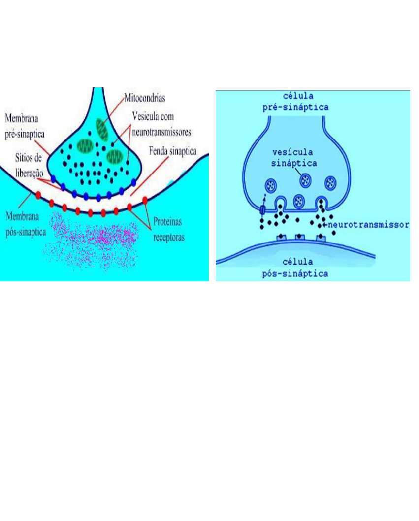 SINAPSE A sinapse é uma região de proximidade entre um neurônio e outra célula por onde é transmitido o impulso nervoso. Além disso é onde os impulsos nervosos são transformados em impulsos químicos em decorrência da presença de mediadores químicos. Ponto de contato entre uma célula nervosa (elemento pré-sináptico) e outra célula excitável, nervosa ou não (elemento pós-sináptico), visando a transmissão da informação. Geralmente elas ocorrem entre o axônio de um neurônio e o dendrito de outro. Entretanto, podem ocorrer algumas sinapses menos comuns, tais como axônio com axônio, dendrito com dendrito e dendrito com corpo celular. Os axônios apresentam diversas ramificações e, no final delas, são encontradas expansões chamadas de botões pré-sinápticos. Esse botão está separado da membrana do outro neurônio ou célula muscular através de um espaço que recebe o nome de fenda sináptica. No botão pré-sináptico existem diversas mitocôndrias, além de vesículas que são repletas de uma substância química que recebe o nome de neurotransmissores, que são capazes de alterar a permeabilidade da membrana do neurônio pós-sináptico. Exemplos de SINAPSE: . Sinapse entre dois neurônios . Sinapse neuromuscular: entre uma células nervosa e uma célula muscular esquelética Classificação das SINAPSES entre os neurônios quanto à citoarquitetura: Classificação das SINAPSES (quanto a condução do sinal): As sinapses químicas utilizam mediadores químicos, os neurotransmissores, que medeiam o sinal químico de uma célula pré-sináptica passando pela fenda para uma célula pós-sináptica. As sinapses elétricas transmitem informação instantaneamente de uma célula para outra, com transferência direta de corrente elétrica entre a célula pré-sináptica e a pós-sináptica. Elas são particularmente úteis quando a velocidade e a precisão na transmissão do impulso são fundamentais, como, por exemplo, no músculo cardíaco e no músculo liso. . Sinapse elétrica (canais iônicos) REPRESENTA MINORIA DE SINPASES NO SNC. ELEMENTO PRÉ E PÓS ESTÃO DIRETAMENTE EM CONTATO. FLUXO DIRETO DE CORRENTE ENTRE AS CÉLULAS ATRAVÉS DE CONEXONS. CONDUÇÃO RÁPIDA (SEM RETARDO SINÁPTICO) CONDUÇÃO BIDIRECIONAL. Na sinapse elétrica a transmissão do impulso elétrico é feita diretamente entre as células por meio das junções GAP (essa junção é composta por proteínas de membrana que servem como canais de baixa resistência elétrica. Essa junção GAP possui uma estrutura hexagonal chamada conexon, que forma um canal que representa a via de fluxo de corrente elétrica entre as células). Essa forma de comunicação é chamada de transmissão eletrotônica. Essas junções entre as células tem algumas especificidades em se tratando se sistema nervoso. Nessa região, elas são feitas principalmente por proteínas chamadas conexinas: proteínas de 4 alças transmembrânicas, com terminações N e C no citosol. Seis dessas conexinas formam um canal chamado conexon. Este tipo de sinapse é vantajoso quando a velocidade e a precisão na transmissão do impulso são fundamentais. Pode ser verificada, nos vertebrados, em células do músculo cardíaco, uma vez que a ligação elétrica sincroniza suas contrações, e dos músculos lisos, responsáveis, por exemplo, pelos movimentos peristálticos do intestino. . Sinapse química REPRESENTA A GRANDE MAIORIA DAS SINAPSES DO NOSSO ORGANISMO. ELEMENTO PRÉ-SINÁPTICO SEPARADO DO ELEMENTO PÓS-SINÁPTICO PELA FENDA SINÁPTICA (200-400 ºA). TRANSMISSÃO MEDIADA PELO NEUROTRANSMISSOR (QUÍMICA). ELEMENTO PRÉ SINTETIZA E LIBERA O NEUROTRANSMISSOR. ELEMENTO PÓS TEM OS RECEPTORES PARA O NEUROTRANSMISSOR. UNIDIRECIONAL. APRESENTA RETARDO SINÁPTICO (0,4-0,8 SEG). APRESENTA FADIGA SINÁPTICA (secreção elevada de neurotransmissores até esgota, ou a célula pós-sináptica deixar de responder) PASSÍVEL DE MODULAÇÃO. X Possui mitocôndria, porque precisa de ATP para fazer a síntese dos neurotransmissores e para o tráfego das vesículas Armazenamento de neurotransmissores: . Elemento pré-sináptico . O neutransmissor é armazenado nas vesículas Síntese do Neurotransmissor: A síntese do neurotransmissor se faz a partir de um precursor (tirosina, triptofano, colina e outros alfa-aminoácidos) que, vindo do meio externo para o interior do neurônio, atravessa a membrana do corpo celular da estrutura neuronal por intermédio de mecanismos especializados. X Acontece no terminal axônio X Pode ser derivado de peptídeo ou aminoácido Tipos de vesículas: . Pequenas – Contém aminoácidos (GABA, GLICINA, Ach, GLUTAMATO) . Pequenas de centro denso – Contémas CATECOLAMINAS (ADRENALINA, NOROADRENALINA, DOPAMINA – DERIVADOS DE AAS) . Grandes de centro denso – Contém os neuropeptídeos (ENCEFALINAS) Proteínas (CINESINAS) trafegam os neurotransmissores para o terminal axônio, para liberar através de exocitose X As cinesinas são motores protéicos que têm a capacidade de se locomover usando microtúbulos como trilhos. Seguem abaixo as fases para a liberação dos neurotransmissores: 1)Despolarização da Membrana Pré-Sináptica (Potencial de Ação) 2)Abertura dos Canais de Ca⁺⁺ (influxo) 3)Fusão das Vesículas com a Membrana (SNAREs) 4)Exocitose do Conteúdo Vesicular na Fenda Sináptica; 5)Interação do Transmissor com seu Receptor Específico (na Célula Pós-Sináptica) 6)Abertura de Canais Pós-Sinápticos com a Entrada ou Saída de Íons, o que causa um Potencial Pós-Sináptico (Hiper/Despolarização) 7)Reciclagem da Membrana Vesicular 8)Remoção dos Neurotransmissores da Fenda Sináptica por: Difusão, Destruição Enzimática ou Transporte Ativo para a Terminação Pré-Sináptica. X PTN snare fazem parte da abertura do canal para a liberação Interferências no complexo SNARE X Participam da liberação das vesículas no terminal axônio TOXINA BOTULÍNICA: INATIVAÇÃO DE PROTEÍNAS SN