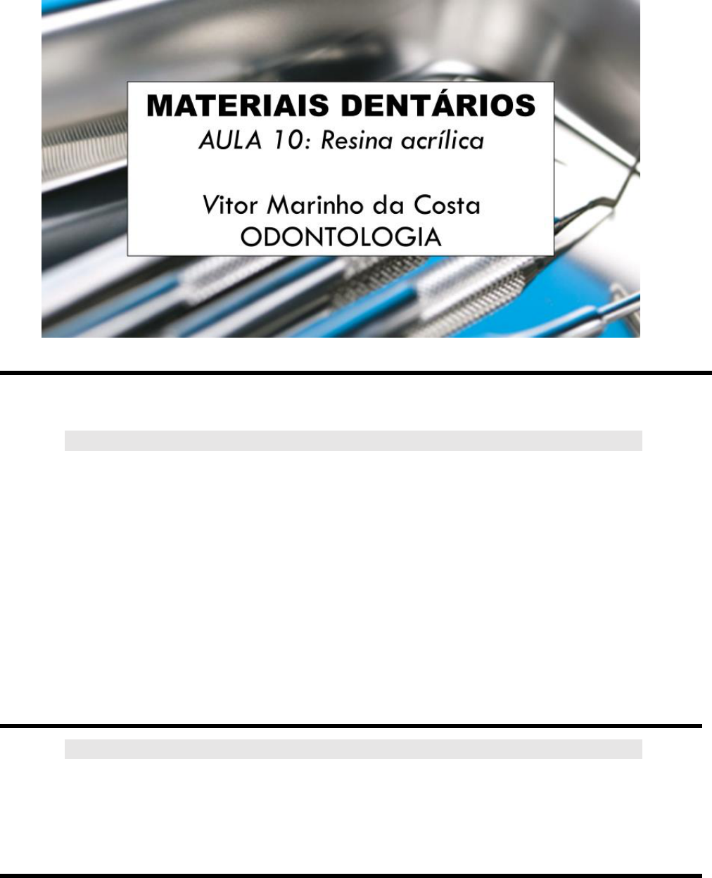 Vitor Marinho da Costa 1 Vitor Marinho da Costa Terça-feira 11/09/2018 1. RESINA ACRÍLICA: • A resina acrílica tem várias funcionalidades na odontologia, que vão desde provisórios até extensos trabalhos restauradores. • O forte odor da resina acrílica é devido a sua volatilidade de seu monômero. • A resina acrílica é um polímero e possuem moléculas muito grandes arranjadas em extensas cadeias. • As resinas acrílicas apresentam propriedades óticas e dimensionais estáveis em condições orais normais, e as propriedades físicas são comprovadamente adequadas para aplicações odontológicas. Além de apresentarem fácil processamento e baixo custo. 2. APRESENTAÇÃO: • A resina acrílica se apresenta na forma de um Pó (composto por polimetilmetacrilato pré-polimerizado na forma de esferas, pérolas) e de um líquido (Em sua maior parte, formado por metilmetacrilato não polimerizado). Perceba que o pó já é o próprio polímero e o liquido é o monômero. Vitor Marinho da Costa 2 Vitor Marinho da Costa 3. COMPOSIÇÃO: • A composição da resina acrílica se dá por duas fases, uma em pó (Polimetil metacrilato e pequena quantidade de benzoíla, que funciona como um iniciador, responsável por começar o processo de polimerização) e uma fase líquida (Monômero de metilmetacrilato com pequenas quantidades de hidroquinona, que funciona como um inibidor da polimerização). • Toda a reação de formação da resina acrílica é EXOTÉRMICA. Na reação acontece uma quebra de ligações duplas e assim temos o aumento da cadeia pela incorporação de grupos. • Plastificante. • Pigmentos. • Agentes de ligação cruzada. 4. CLASSIFICAÇÃO: • As resinas acrílicas podem ser classificas em dois grupos, aquelas que são termicamente polimerizáveis e aquelas que são quimicamente polimerizáveis (autopolimerizáveis). Esses dois tipos de resina acrílica são importantes, pois em algumas situações o controle do tempo de polimerização se faz necessário, como na confecção de próteses totais. Procedimentos mais permanentes, onde o material precisará durar por um tempo maior, como no caso das próteses, as resinas termo ativadas são escolhidas. • As resinas termicamente ativadas são polimerizadas sob pressão, e com isso teremos materiais mais resistente. 5. PROPRIEDADES: • Dureza relativamente baixa – Tem maior facilidade de fraturar. • Alteração dimensional elevada se comparada com os outros polímeros. 6. APLICAÇÃO: • Próteses totais, PPR, Dentes artificiais, Moldeiras individuais, Coopies de moldagem, Placas intermaxilares (miorelaxante), Bases para montagem de PPR, Dispositivos ortodônticos, Coroas provisórias, Facetas estéticas (desuso), Modelos para núcleos metálicos fundidos. Vitor Marinho da Costa 3 Vitor Marinho da Costa 7. PROPORCIONALIDADE (3:1): • A proporção ideal pra de 3 pra 1 em um pode Paladom tampado, para evitar evaporação, e com isso diminuindo a perda de dimensão. • Muito pó pode levar a um preenchimento inadequado, pelo monômero, dos espaços livres entre as particular de pó, resultando em um material fraco com consequente porosidade no produto final. O uso de monômero em excesso produzirá excessiva contração de polimerização e perda da qualidade da adaptação da superfície interna do material. 8. ESTÁGIOS DE POLIMERIZAÇÃO: • Existem 5 fases, sendo que o processo de polimerização acontece nas 4 primeiras. • FASE 1 ou ARENOSA – Quando se mistura o pó no liquido, formando uma espécie de areia molhada. Essa fase passa muito rápida. • FASE 2 ou PEGAJOSA ou FILAMENTOSA – Nesse momento a resina se torna bastante pegajosa. Nesse momento o monômero está atacando o polímero. • FASE 3 ou PLÁSTICA, GEL ou MASSA – Nessa fase a resina se torna passível de ser manipulada com a mão, visto que não está mais pegajosa. • FASE 4 ou ELÁSTICA ou BORRACHÓIDE – Nesse estágio a resina não está grudenta e apresenta uma memória elástica.