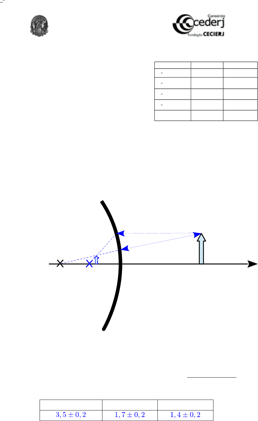 Introdução às Ciências Físicas 1 2 o Semestre de 2016 AP1 de ICF1 Instituto de Física UFRJ Avaliação Presencial 1 de Introdução às Ciências Físicas I – AP1 Segundo Semestre de 2016 Pólo:_____________________Data:_________________ Curso:_________________________________________ Nome:_________________________________________ Assinatura:____________________________________ PROVA AP1 DE ICF1 Questão 1 (3,0 pontos) Uma seta é colocada sobre o ponto O do eixo de um espelho convexo como mostra a figura 1. O centro do espelho é C. C F O Figura 1 a) Escreva abaixo as distâncias entre o espelho e seu centro (C), entre o espelho e seu foco (F). NÃO SE ESQUEÇA DAS INCERTEZAS. Encontre GRAFICAMENTE a imagem da seta formada pelos raios que saem de suas extremidades e são refletidos no espelho. Anote-a também na tabela abaixo. C (cm) F (cm) I (cm) Profs. Lucia Coutinho e Sergio Jorás 1 Questão Nota Rubrica 1a 2a 3a 4a Total 0,7 pt (DESENHO) + 0,3 pt X 3 (TABELA) SEM INCERTEZA, PERDE 0,3 pt (CADA) Introdução às Ciências Físicas 1 2 o Semestre de 2016 AP1 de ICF1 b) Encontre a posição da imagem do objeto USANDO A EQUAÇÃO DOS ESPELHOS. c) MEÇA a distância horizontal do espelho até a posição da base da imagem encontrada no item (a). Ela coincide com o valor obtido no item (b)? COMENTE o seu resultado. A medida do desenho é . É compatível com o valor calculado pela equação dos espelhos, pois ele está dentro da sua faixa de incerteza. d) A imagem encontrada é real ou virtual? JUSTIFIQUE. A imagem é virtual porque é formada pelo prolongamento dos raois refletidos. Questão 2 (3,0 pontos) Dois amigos vão disputar uma corrida do ponto 0 até o ponto 3. Eles largam ao mesmo tempo e podem escolher caminhos diferentes; ganha quem chegar primeiro ao final. Um deles, André, escolhe o caminho direto e mais curto (pela areia) e o outro, Bruno, escolhe o mais longo (pelo asfalto). Bruno vai do ponto 0 até o ponto 1, a 2 km de distância, na direção de 45o com o vetor . Do ponto 1, segue até o ponto 2, a 3 km de distância de 1, em uma direção de 0o com o vetor . Do ponto 2, vai direto para a chegada, indicada pelo ponto 3, a 2 km de distância de 2, em uma direção de 135o com vetor . André, como dito anteriormente, vai em uma linha reta da largada (0) até a chegada (3). O ponto 3 NÃO está indicado na figura 2 abaixo; você deve determinar sua posição pelos dados acima. (a) Desenhe, na Figura 2 abaixo, os vetores deslocamento de cada corredor em cada etapa. USE COMO ESCALA: 1 KM = 3 CM. (b) Calcule e some as componentes dos deslocamentos de Bruno na direção (horizontal). NÃO É PARA MEDIR NO DESENHO. (c) Calcule e some as componentes dos deslocamentos de Bruno na direção (vertical). NÃO É PARA MEDIR NO DESENHO. Profs. Lucia Coutinho e Sergio Jorás 2 0,7 pt 0,4 pt 0,3 pt 0,6 pt ANULADA 0,6 pt Introdução às Ciências Físicas 1 2 o Semestre de 2016 AP1 de ICF1 (d) MEÇA no seu desenho as componentes do deslocamento de André ao longo da direção (vertical). Compare com o resultado do item (c) e COMENTE. Os resultados são iguais dentro de suas faixas de incerteza. (e) Suponha que a velocidade de André seja 5 km/h e que a velocidade de Bruno seja 8 km/h. Calcule o tempo que cada um leva para chegar ao ponto 3. André: Bruno: (f) Qual o módulo do vetor velocidade média de cada corredor? CUIDADO: lembre-se de que o vetor velocidade média é dado por , onde é o deslocamento TOTAL do corredor durante o intervalo de tempo . André: Bruno: (g) Quem ganha a corrida? Bruno, pois Profs. Lucia Coutinho e Sergio Jorás 3 ANULADA 0,4 pt X 2 0,4 pt X 2 0,2 pt Introdução às Ciências Físicas 1 2 o Semestre de 2016 AP1 de ICF1 x 0 Figura 2 Profs. Lucia Coutinho e Sergio Jorás 4 1 2 3 B ru noA nd ré Introdução às Ciências Físicas 1 2 o Semestre de 2016 AP1 de ICF1 Questão 3 ( 3,0 pontos) Uma lanterna está localizada ao lado de um pote com água, que tem índice de refração de 1,3. Do lado de fora do pote existe ar, de índice de refração 1,0. A reta pontilhada é a normal à superfície no ponto de incidência do raio luminoso 1. Imagine que a lanterna emita luz de apenas uma cor. Figura 3 (a) Indique (na figura 3) e meça o ângulo de incidência do raio luminoso 1, já desenhado. (b) Calcule o valor do ângulo de refração e indique-o no desenho como . Trace o raio refratado 2 até que ele encontre a outra superfície. (c) Desenhe a nova reta normal neste novo ponto de incidência e chame-a de N2. (d) Indique e meça o ângulo de incidência do raio que foi refratado 2 ao incidir na outra superfície; chame-o de . (e) Calcule o valor do ângulo de refração deste raio para o ar. Se existir, desenhe o raio refratado 3 com este ângulo. (f) Indique e meça o ângulo do raio refletido 4. (g) Desenhe o raio refletido 4 para dentro do líquido até ele encontrar outra superfície. (h) Desenhe a nova reta normal neste novo ponto de incidência e chame-a de N3. (i) Indique e meça o novo ângulo de incidência . (j) Calcule o valor do ângulo de refração deste raio para o ar. Se existir, desenhe o raio refratado 5 com este ângulo. Profs. Lucia Coutinho e Sergio Jorás 5 1 ÁGUAAR AR AR 42 3 5 N2 N3 0,3 pt 0,3 pt 0,3 pt 0,3 pt 0,4 pt 0,4 pt 0,4 pt 0,2 pt 0,2 pt 0,2 pt Introdução às Ciências Físicas 1 2 o Semestre de 2016 AP1 de ICF1 Questão 4 (1,0 pontos: 0,2 para cada item) Diga se as afirmações abaixo são falsas (F) ou verdadeiras (V). ( F ) A mancha luminosa gerada pela passagem de luz por uma fenda muito estreita pode ser explicada pela óptica geométrica. ( F ) A normal à superfície de separação de dois meios no ponto onde o raio incidente atinge a superfície é sempre perpendicular ao raio refratado. ( F ) Em uma interface plana, o ângulo incidente, usado na Lei de Snell, é medido entre o raio incidente e a superfície de separação entre os meios. ( F ) A reflexão total sempre acontece quando um raio de luz incide so